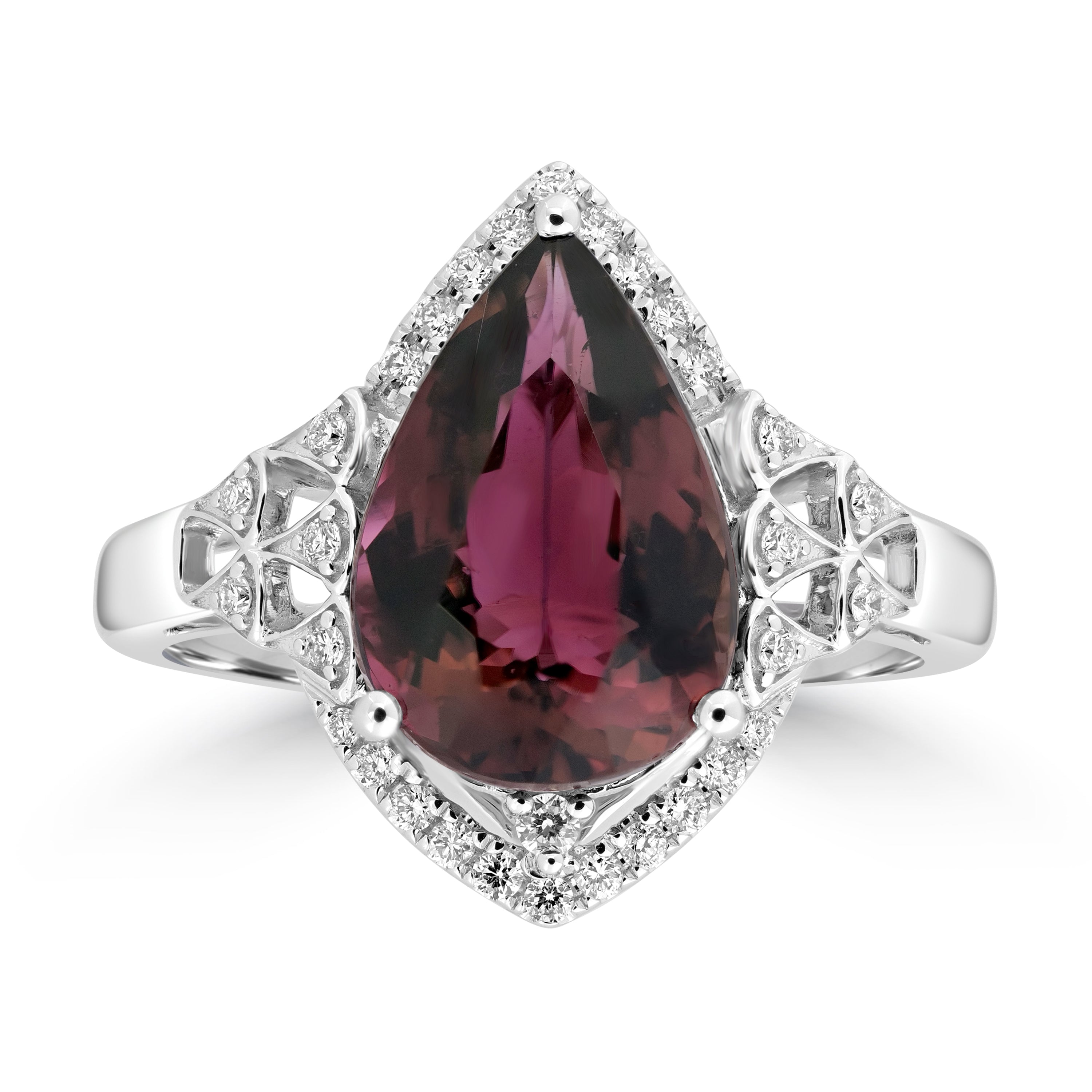 Skillfully crafted in 18K white gold, this exquisite ring exudes elegance. Its distinctive high-class design looks fabulous with pear-cut Tourmaline and round Diamonds. Perfect for various occasions!