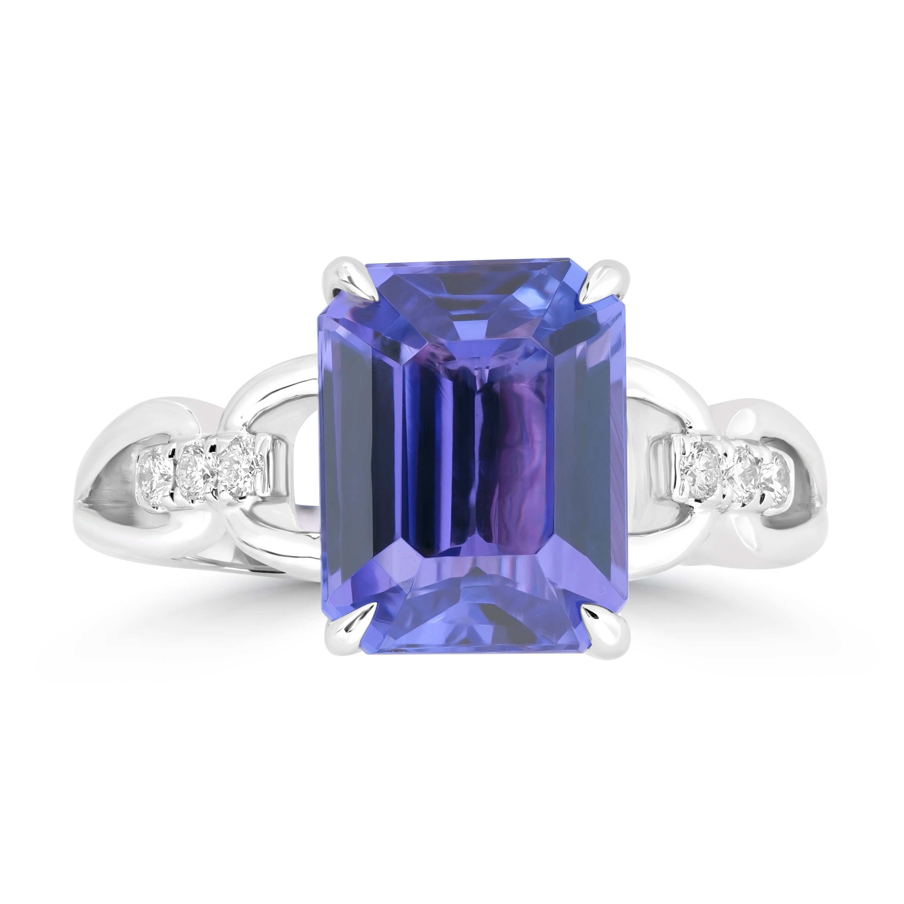 This ring is designed of 18k white gold and is further decorated with a creditable design that features Octagon-cut Tanzanite and round Diamonds.