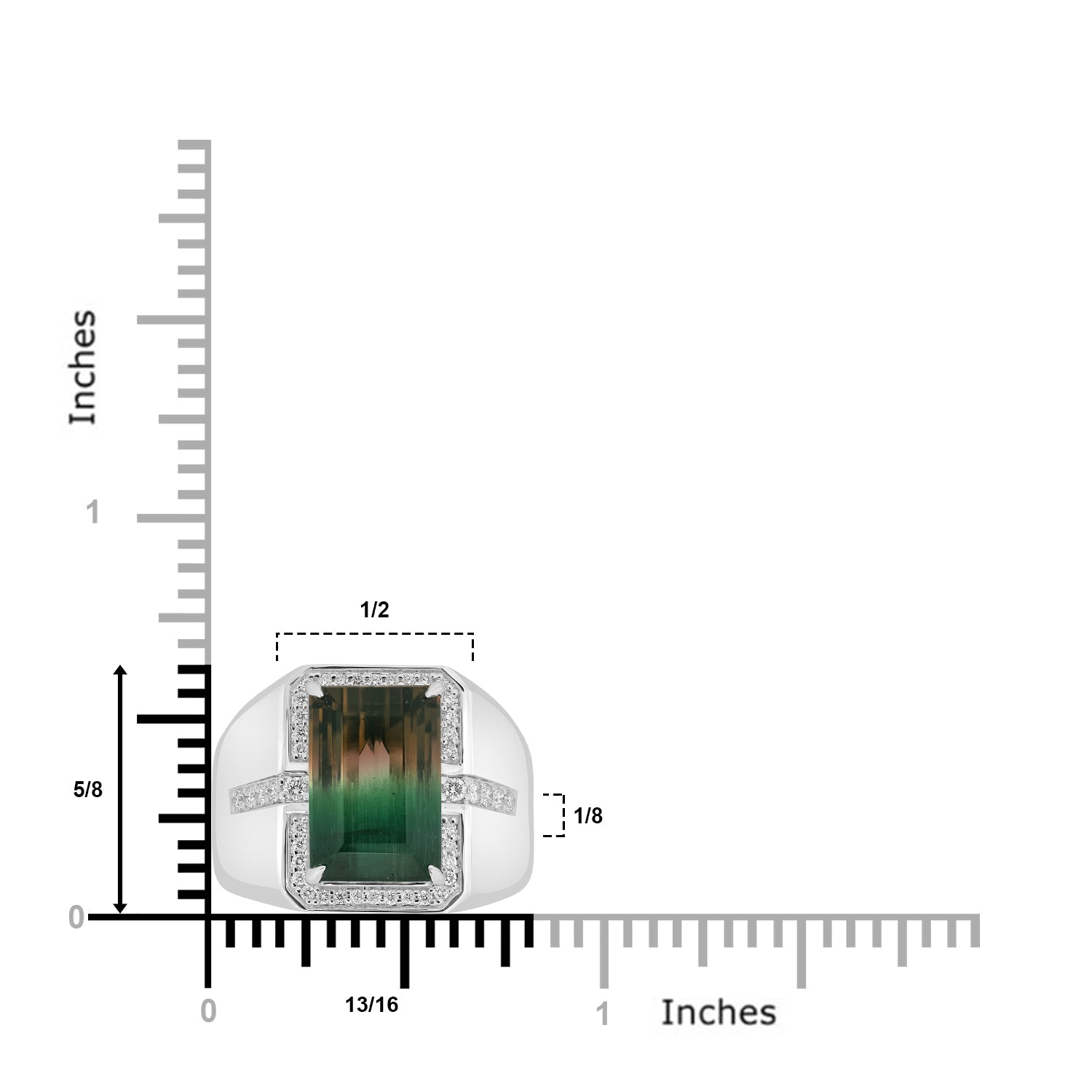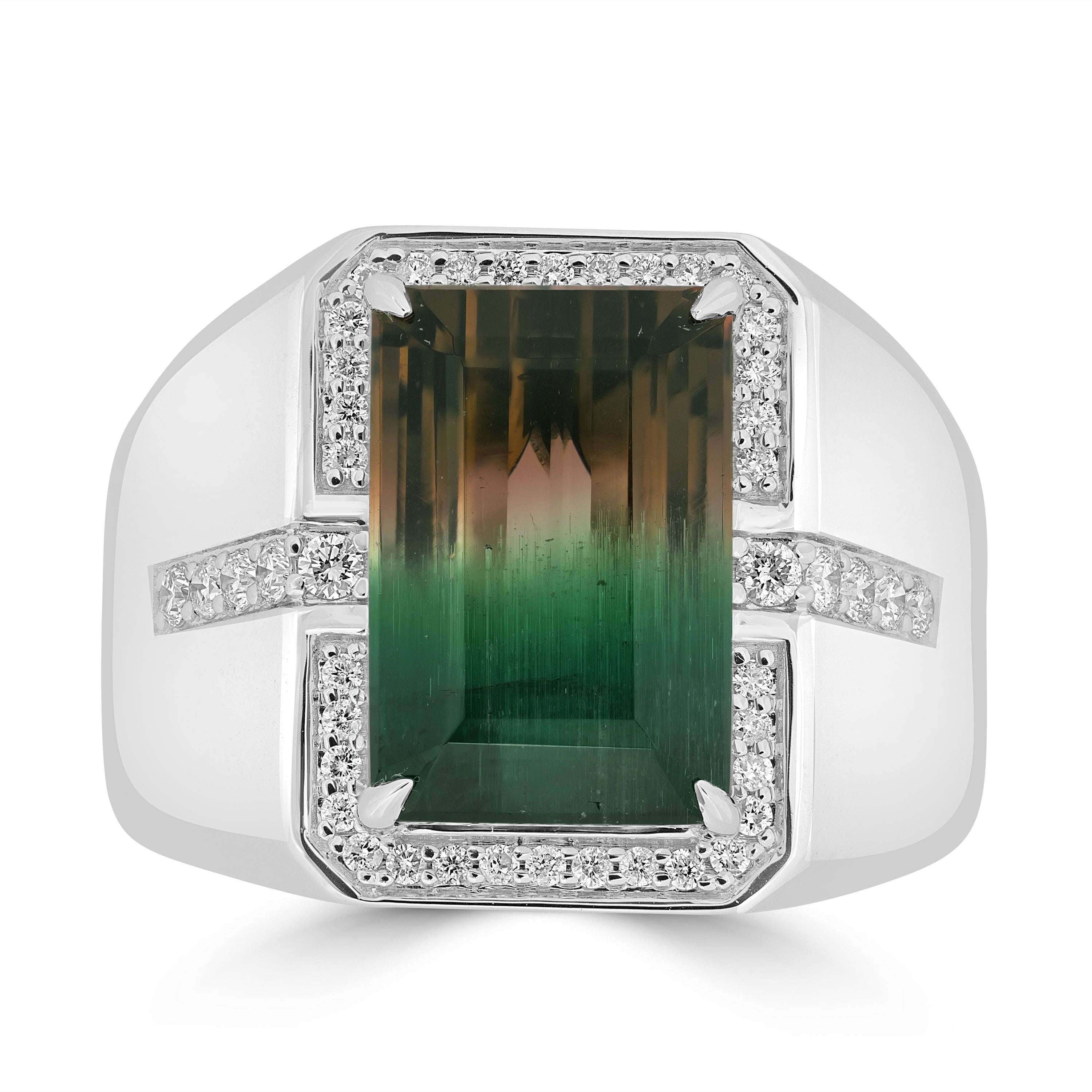 Crafted with 18K white gold, this stylish and glamorous ring showcases fine detailing. Adorned with an eye-catching emerald-cut Tourmaline and round Diamonds, it exudes ravishing charm. Flaunt extraordinary glamour with this exquisite and versatile accessory.