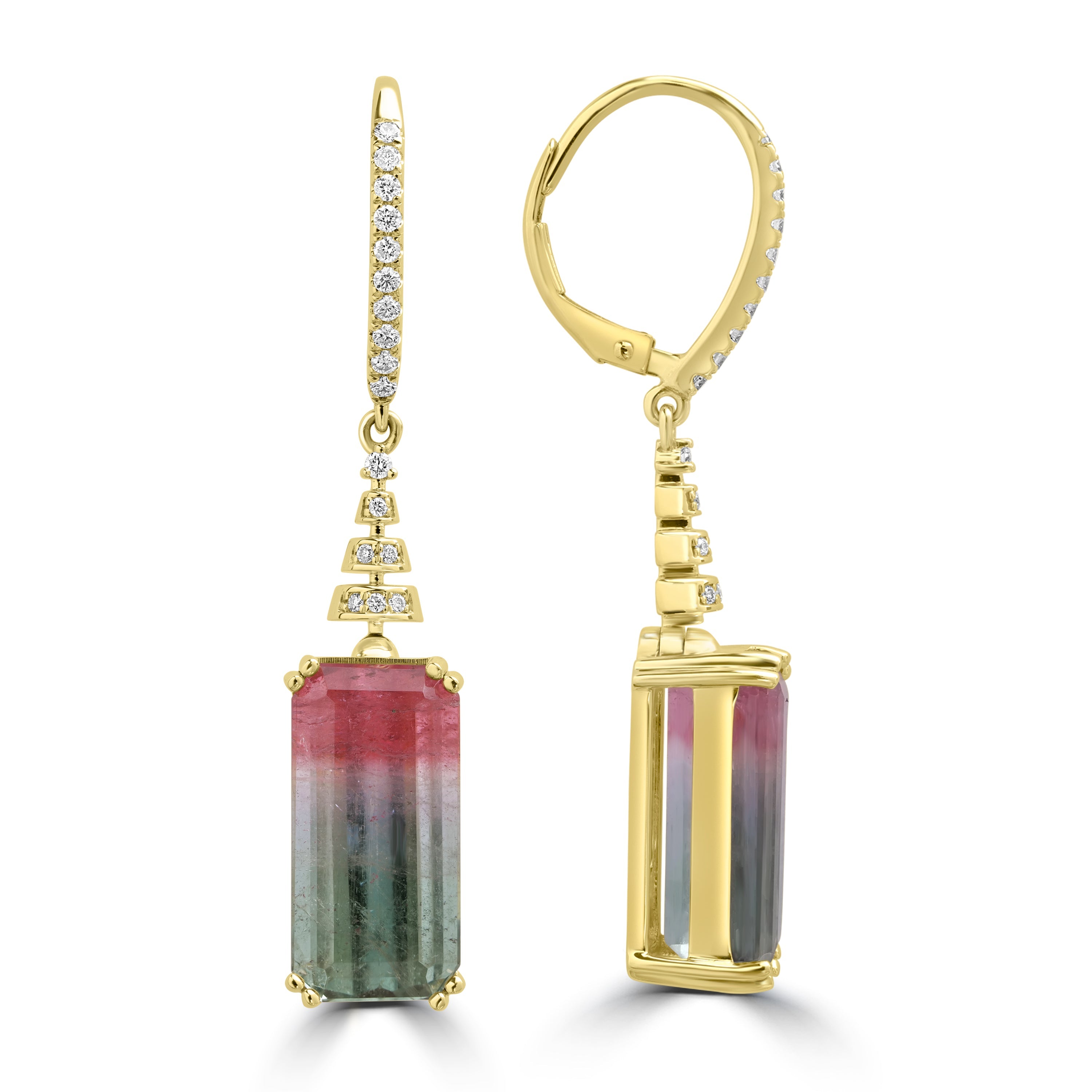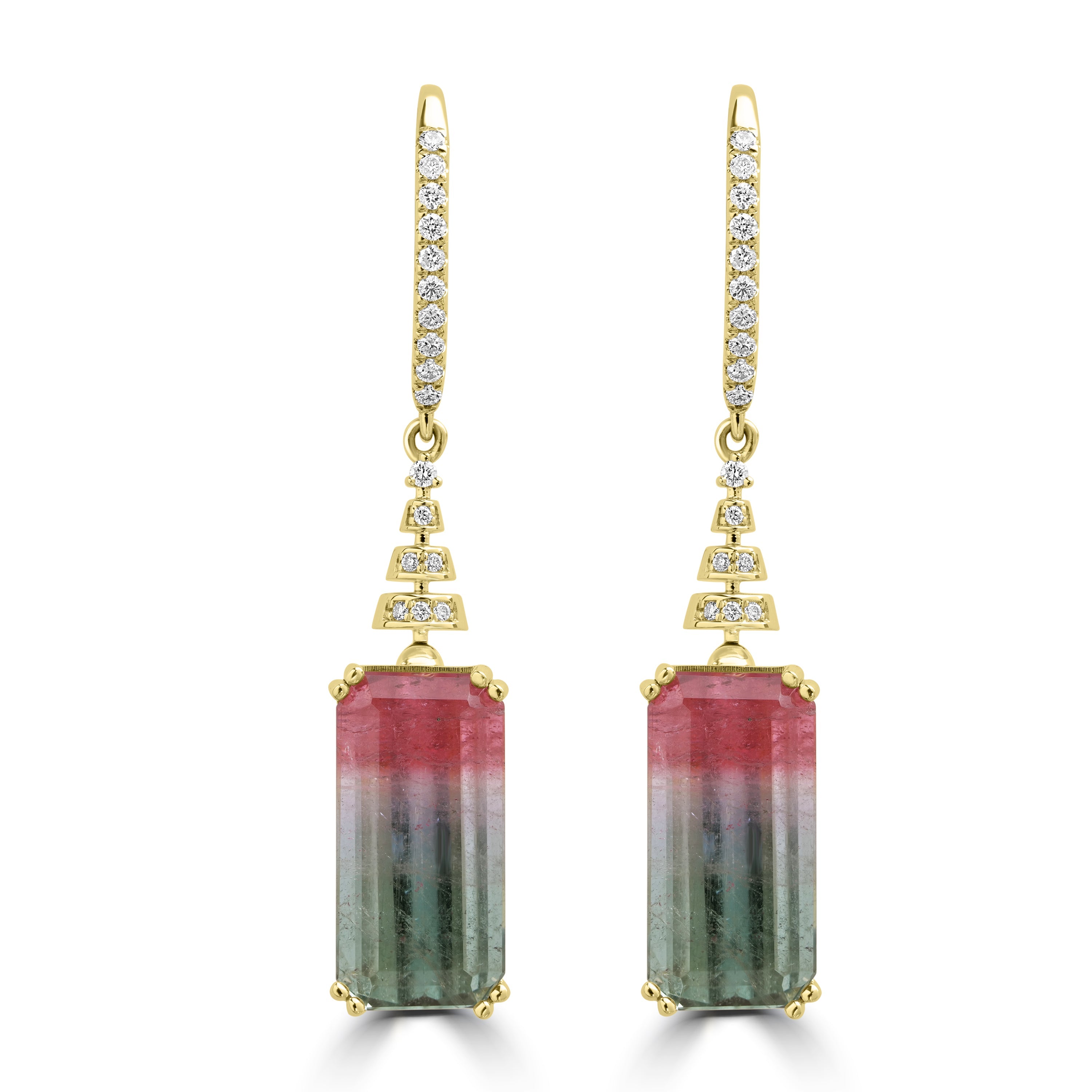 Set with a gorgeous emerald-cut Tourmaline, these impressive earrings boast a beautified round Diamond. Crafted from 18k yellow gold, these marvelous earrings are perfect for any occasion