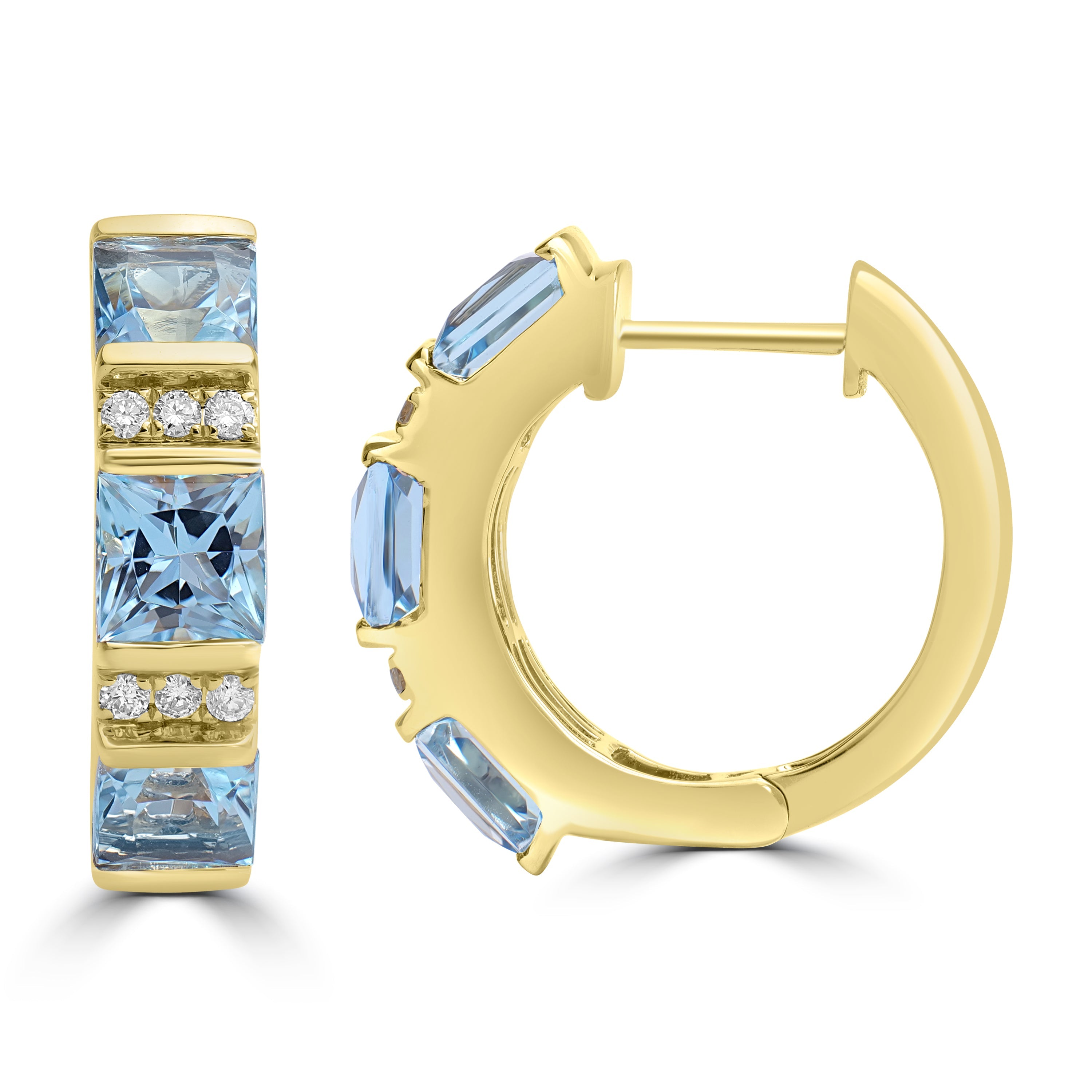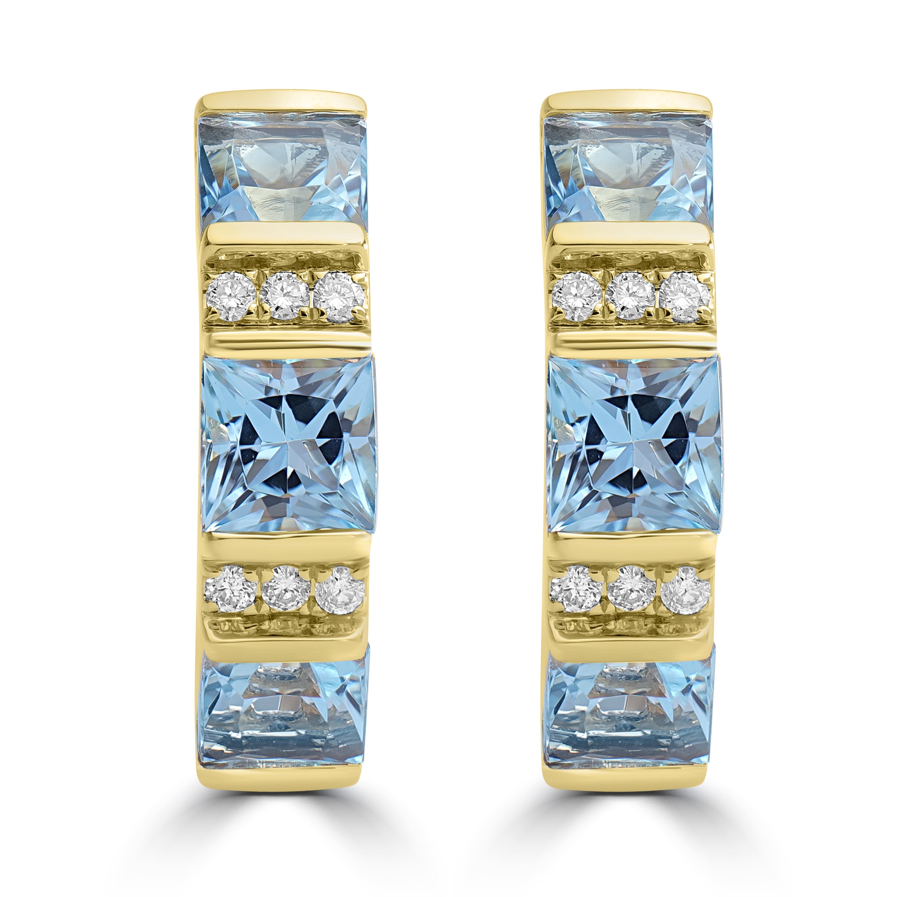Stylishly crafted with 18K yellow gold, these earrings boast a captivating design that looks fabulous with square-cut Aquamarine and elegant round Diamonds. Their exquisite design and exceptional craftsmanship make them a truly enchanting choice for those with a discerning taste in jewelry.