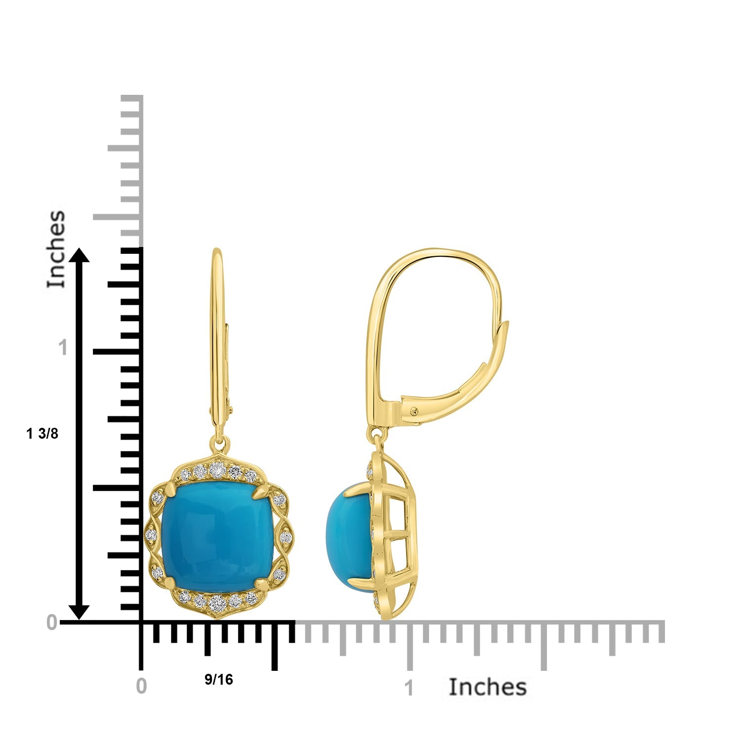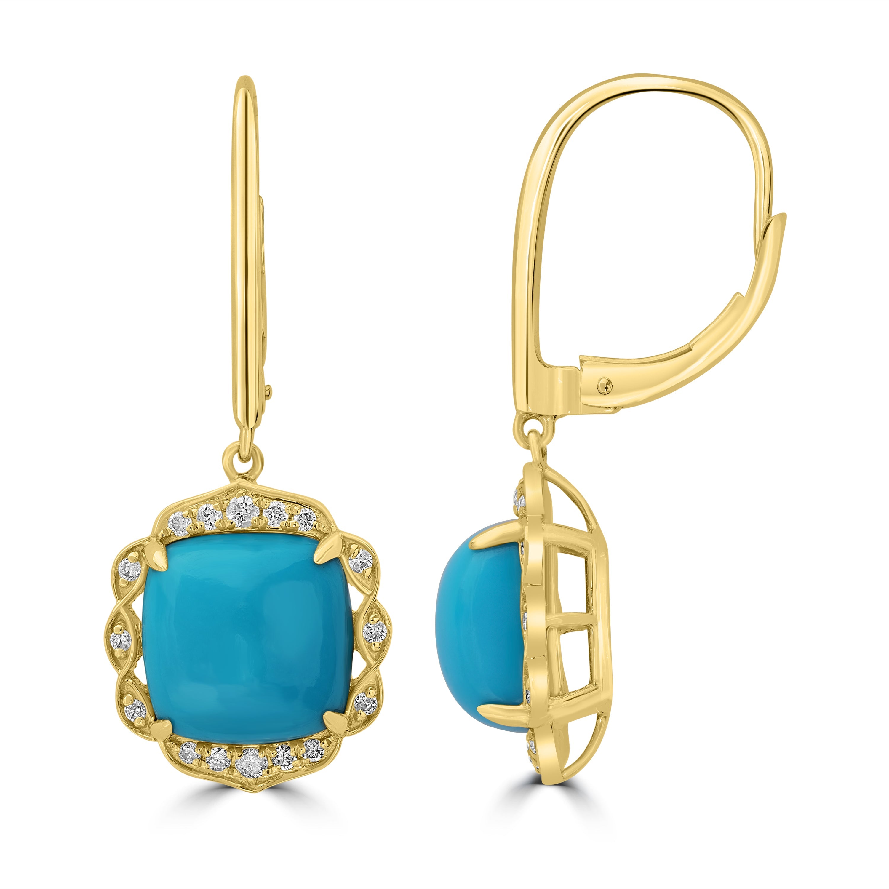 This pair of earrings is the perfect accessory for parties and special occasions and is a joy to wear. Creatively designed with lustrous 18k yellow gold and embellished with cushion-cut Turquoise and round Diamonds, these sparkling earrings will add elegance and delicate charm to your ensemble.