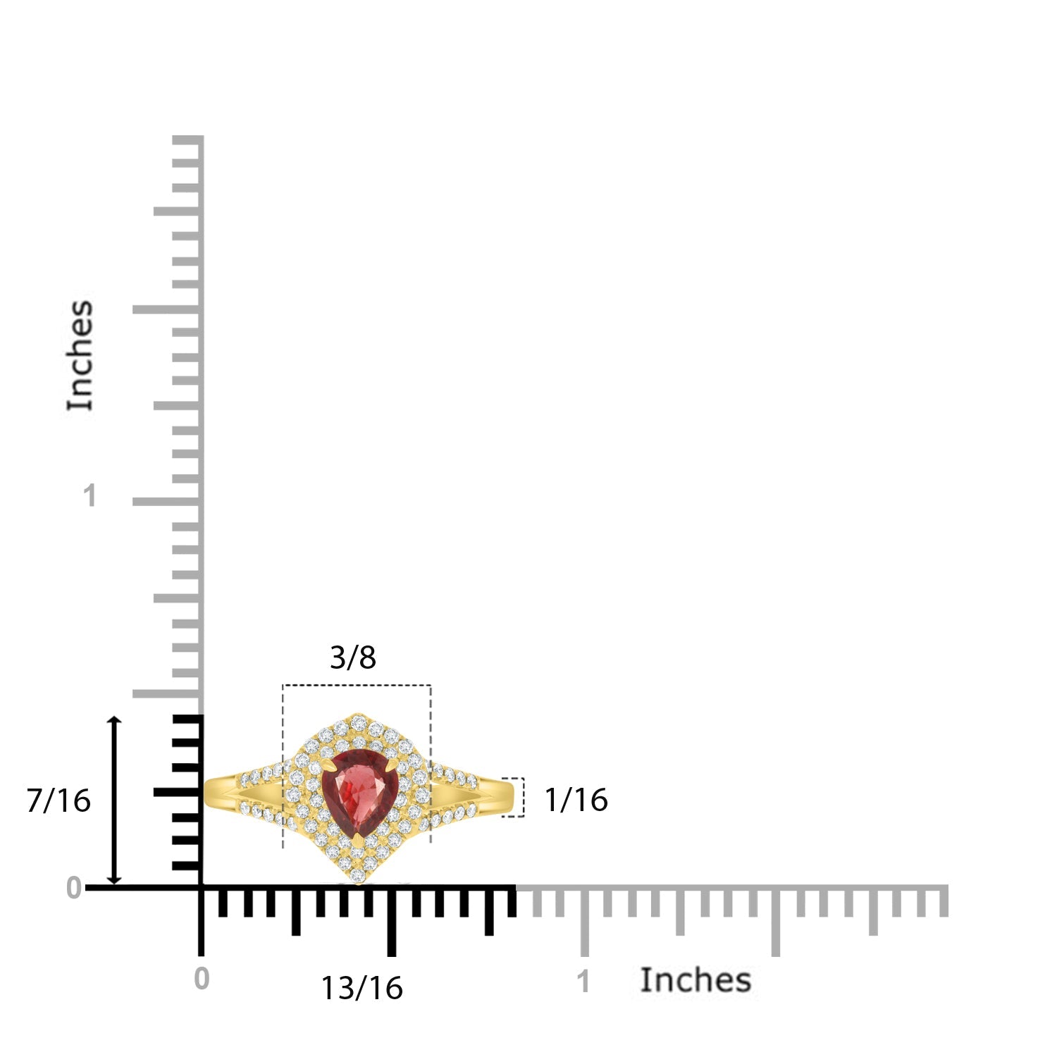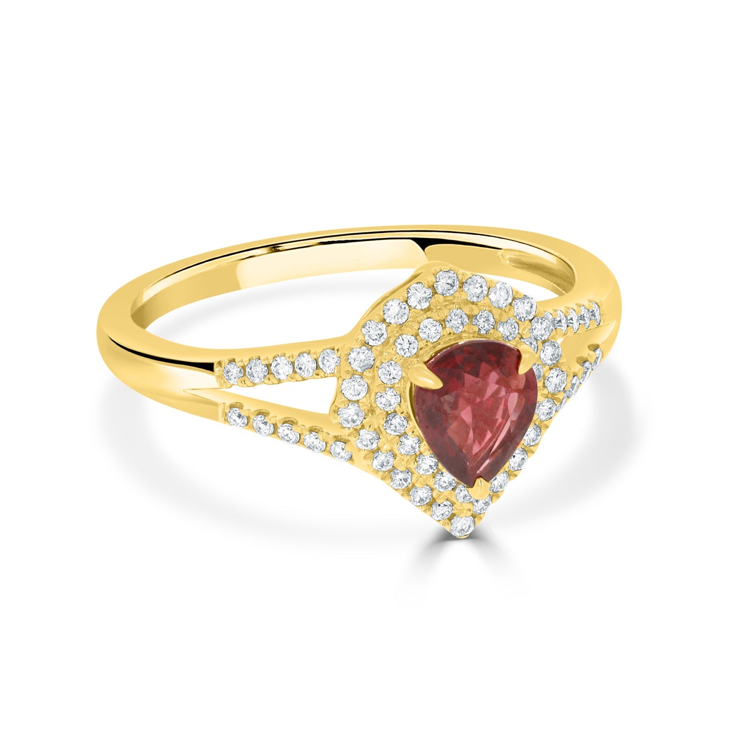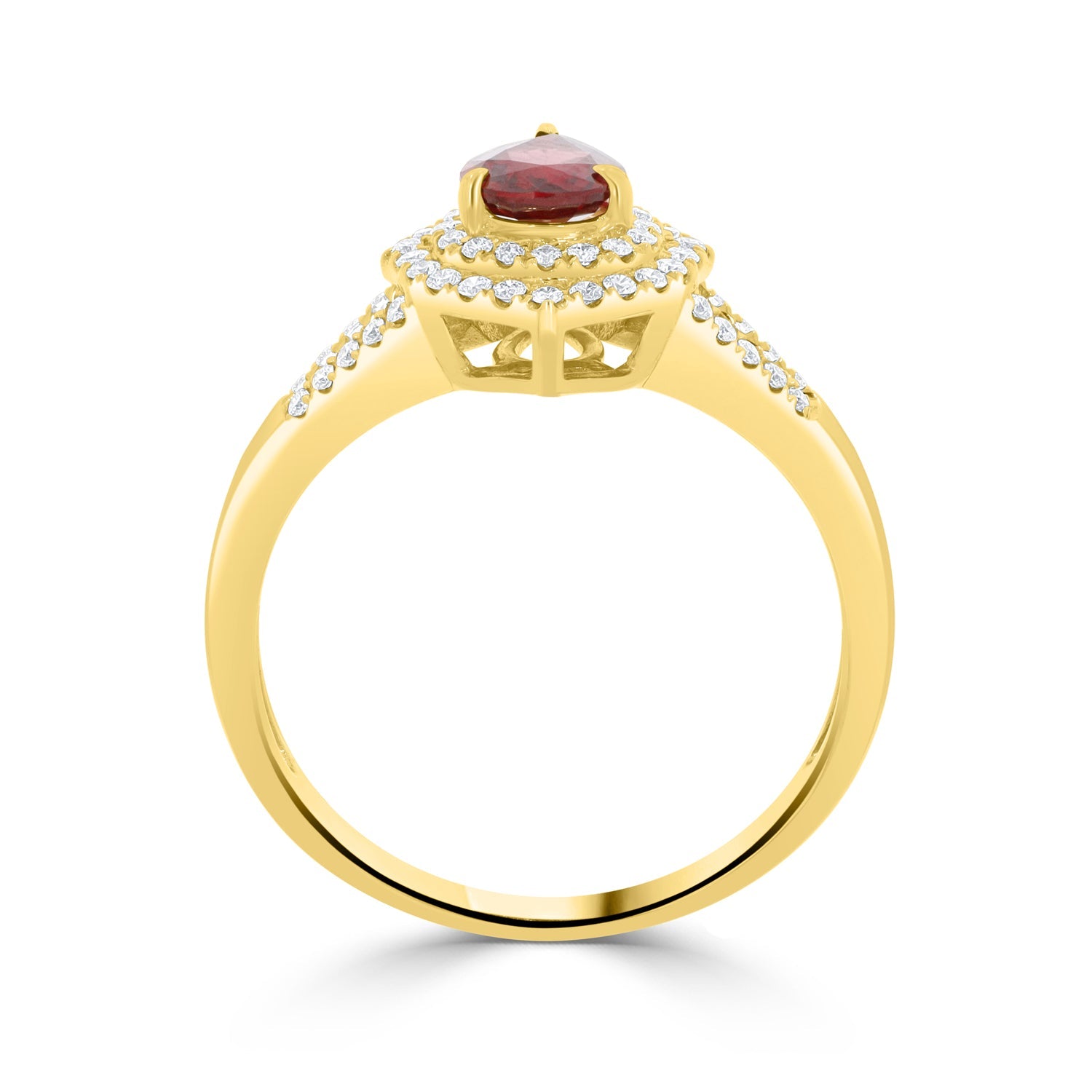 Set With An Exclusive Pear Cut Ruby, This Breathtaking Ring Is Designed With 18K Yellow Gold For A Lustrous Look. Bordered By Shimmering Round Cut Diamonds, The Unmatched Radiance Of This Fine Jewelry Makes It Hard To Resist.