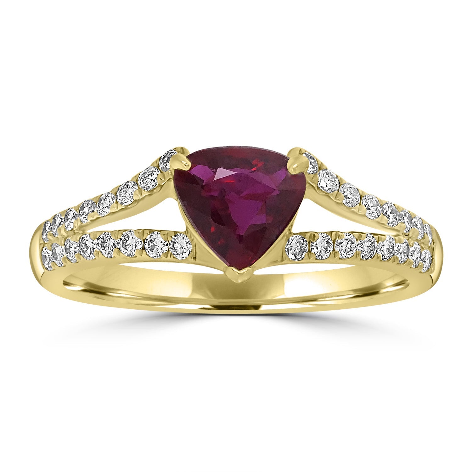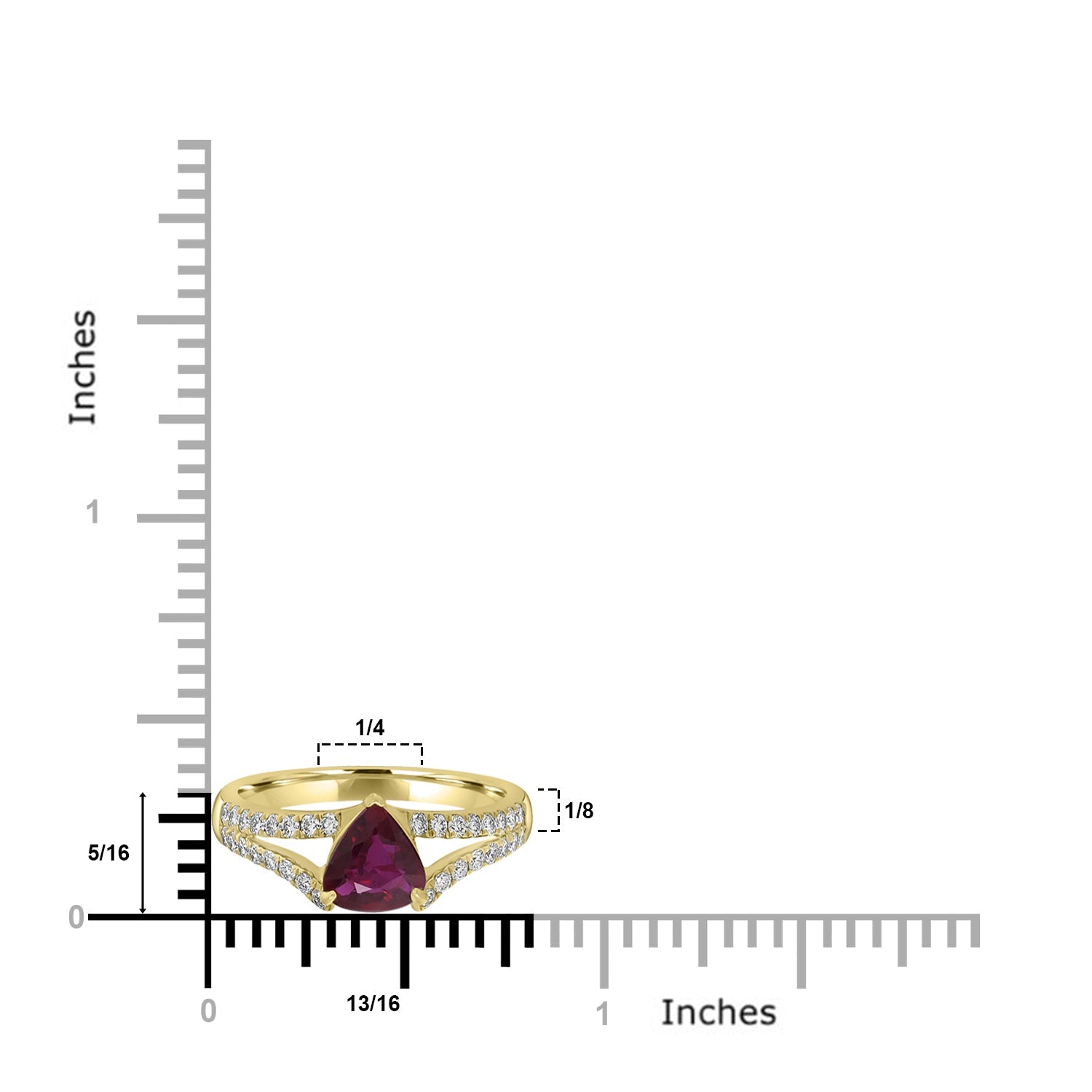 This unforgettable 18K yellow gold ring is set with a pear-cut Ruby and round Diamonds. Perfect for events where you want to stand out.