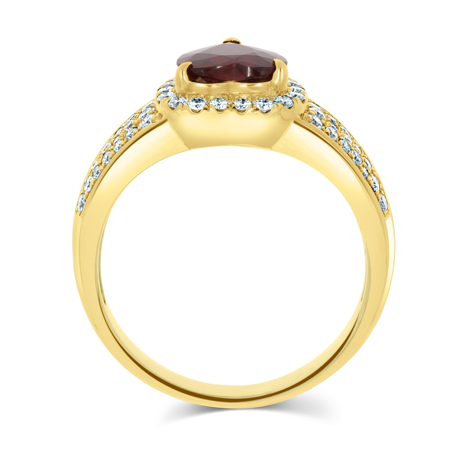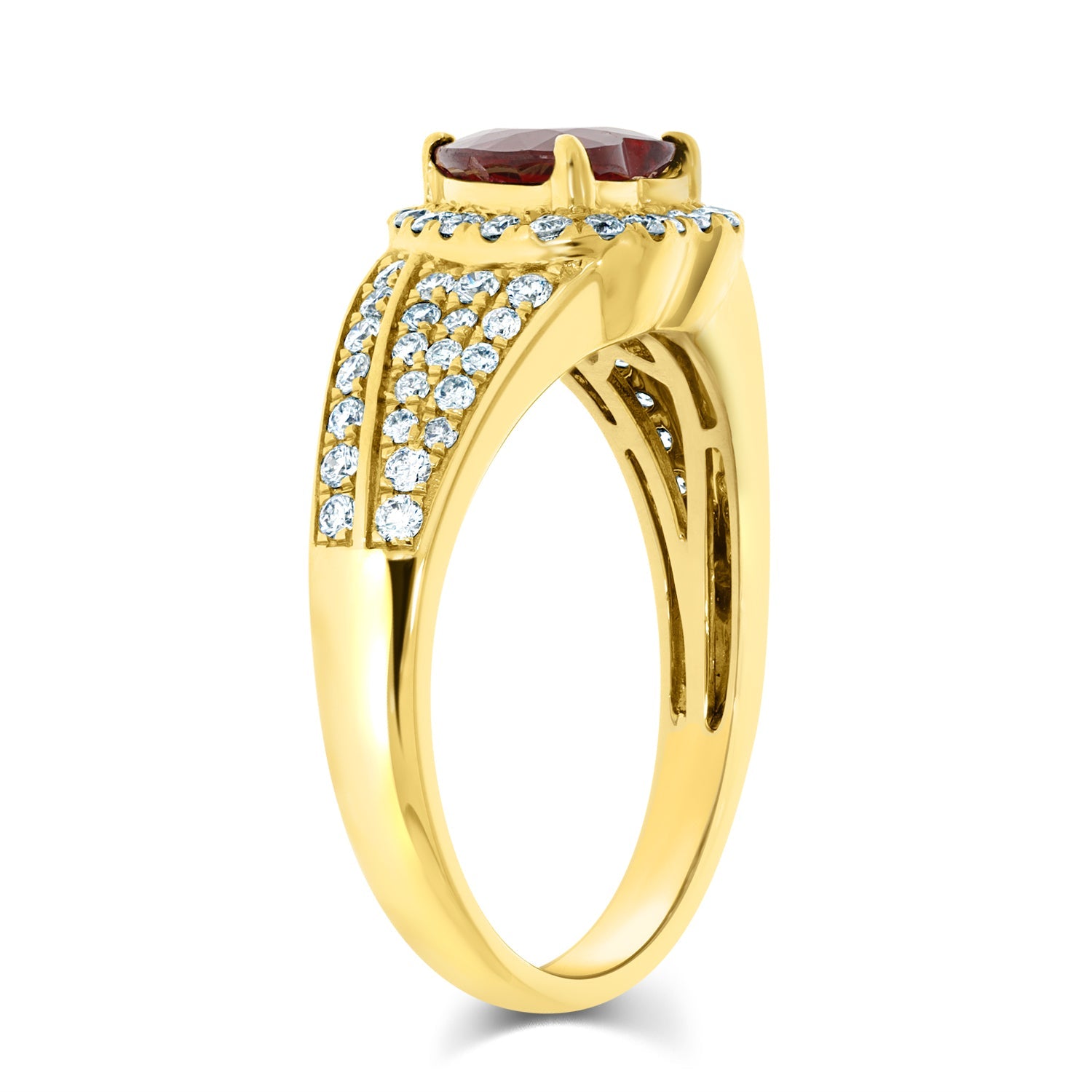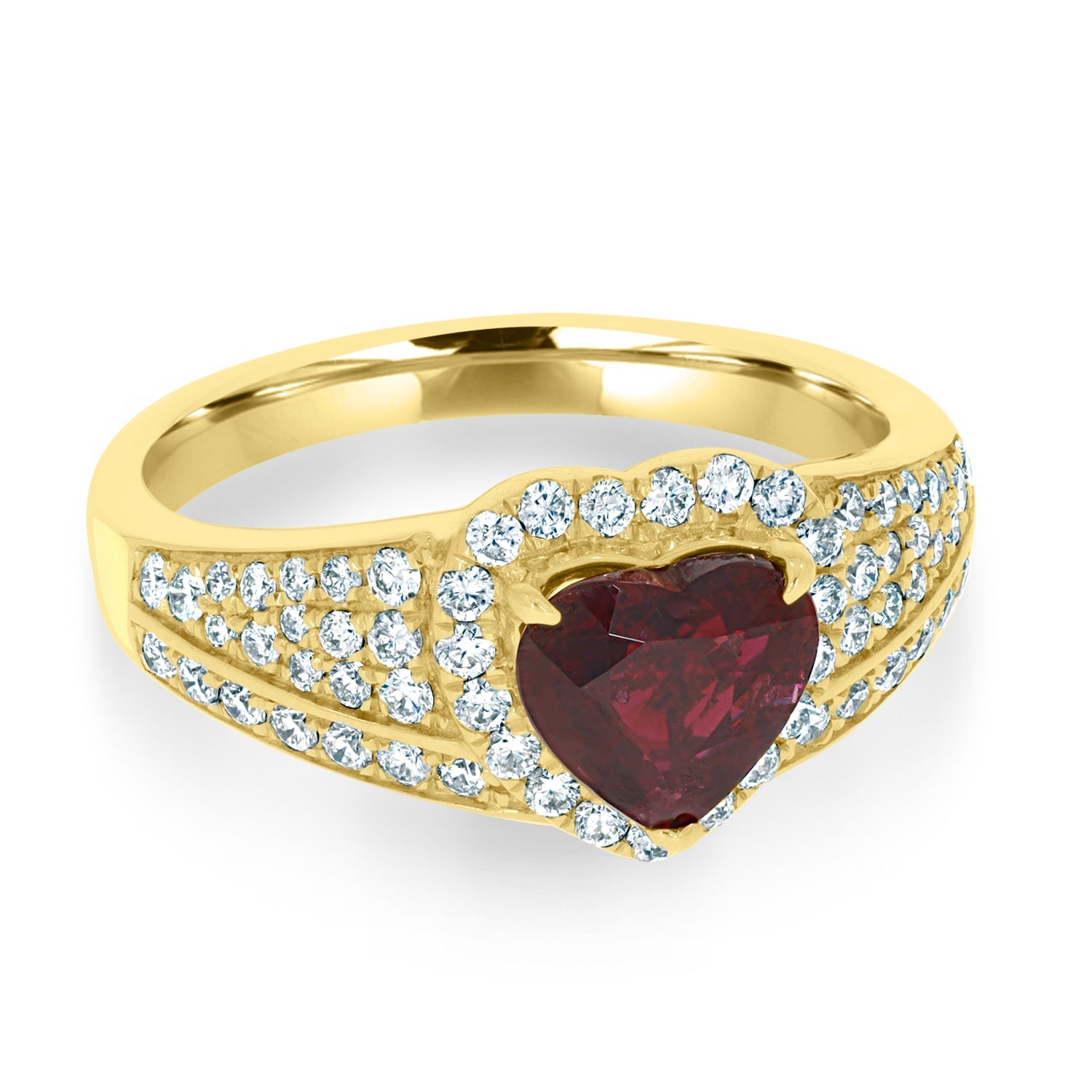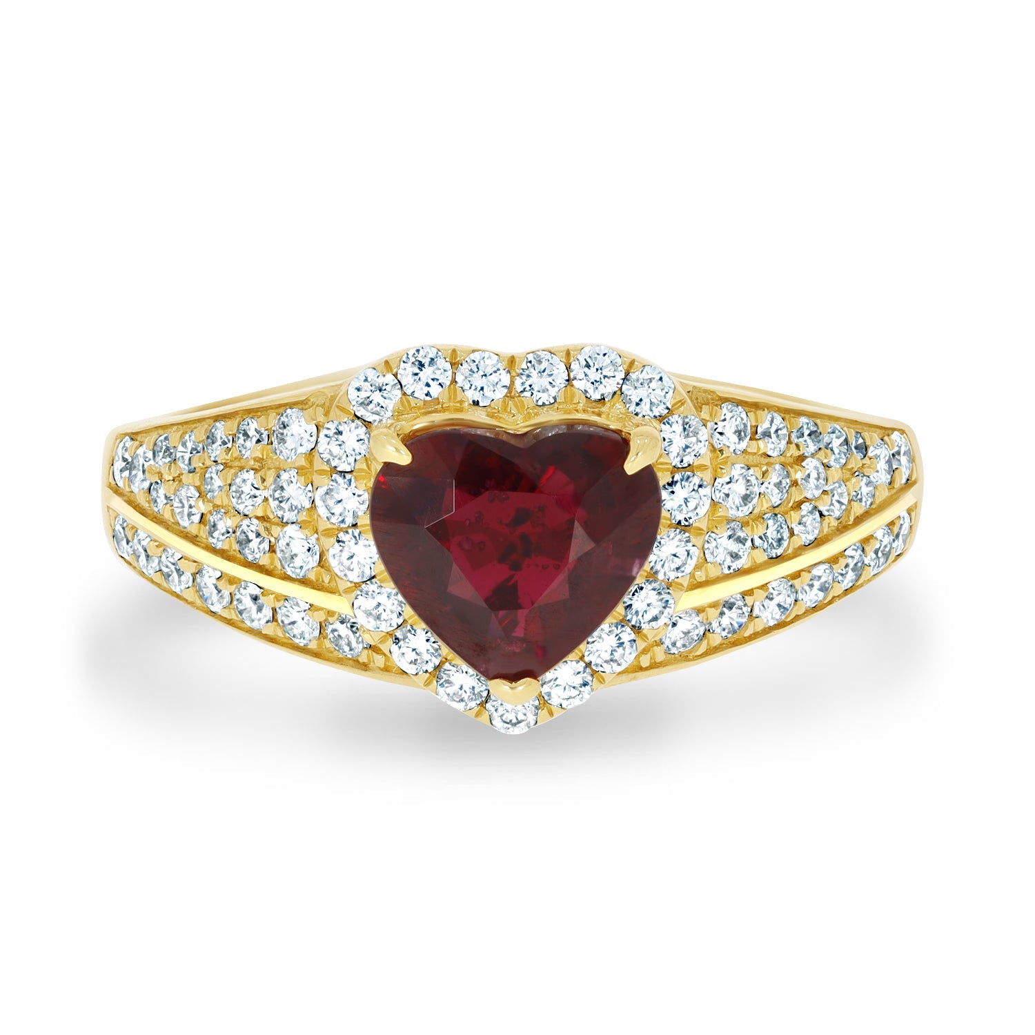 Set With A Breath-Taking Heart Cut Ruby, This Spectacular Ring Adds A Touch Of Glamour To Your Ensemble. Designed With 18K Yellow Gold, It Is Bordered By Sparkling Round Cut Diamonds Which Add To Its Unmatched Brilliance.