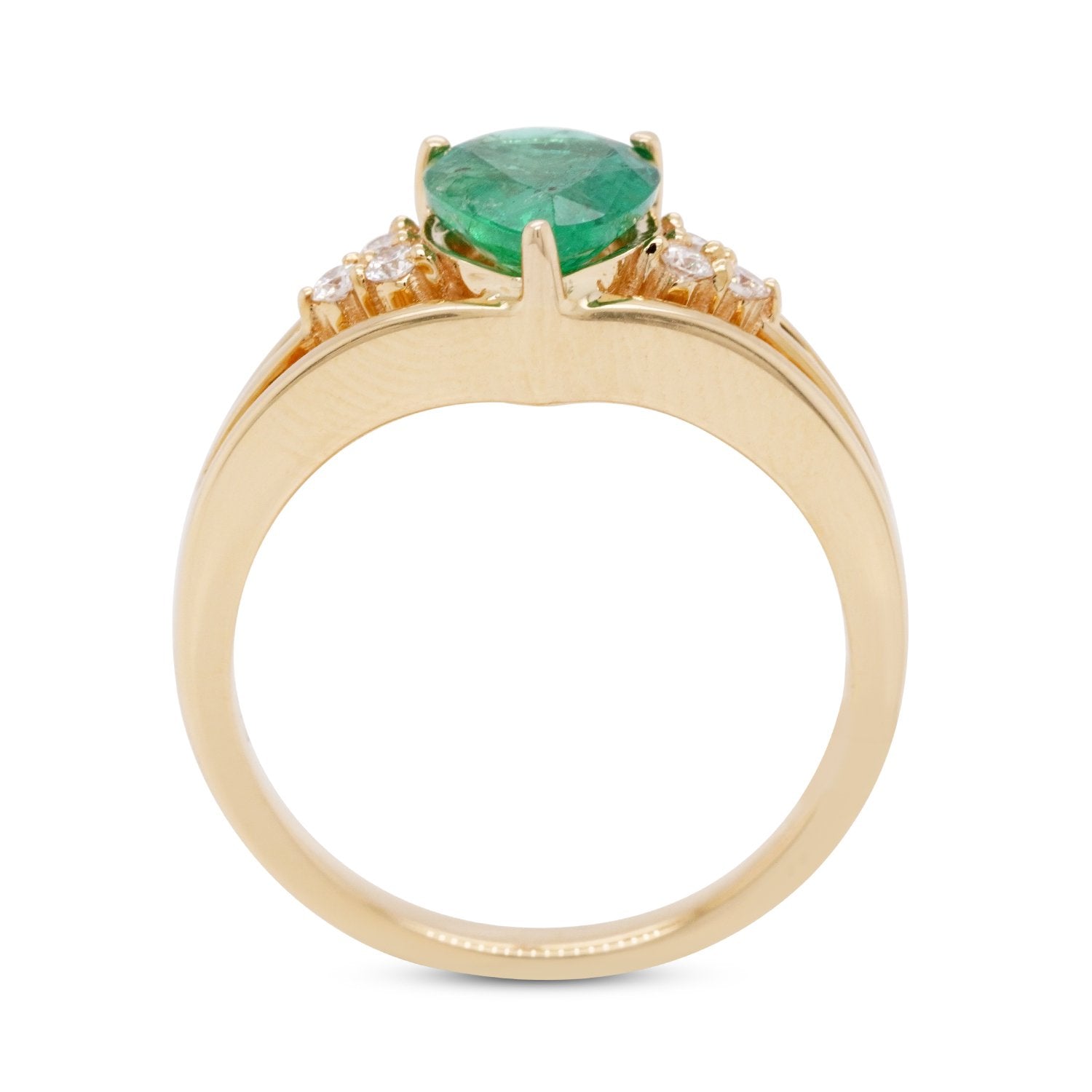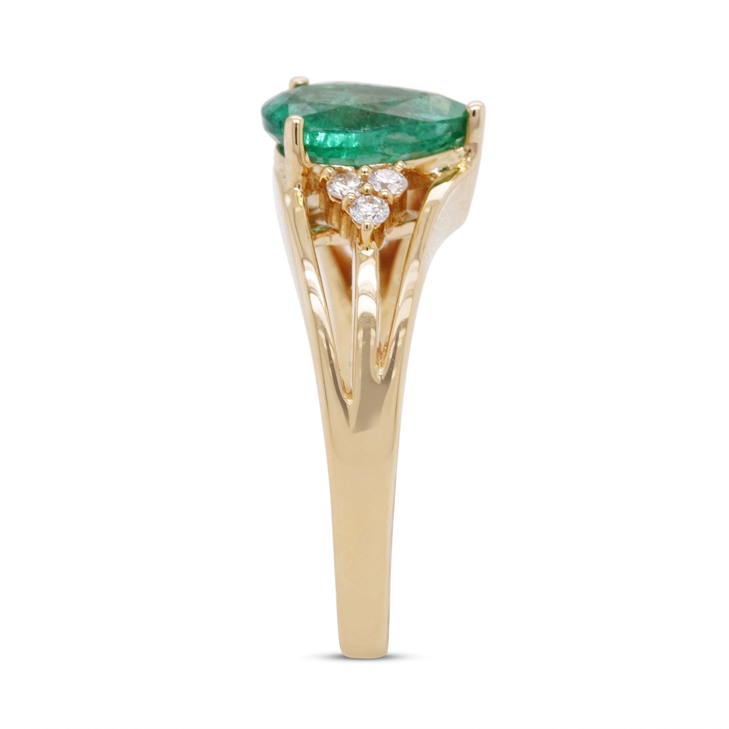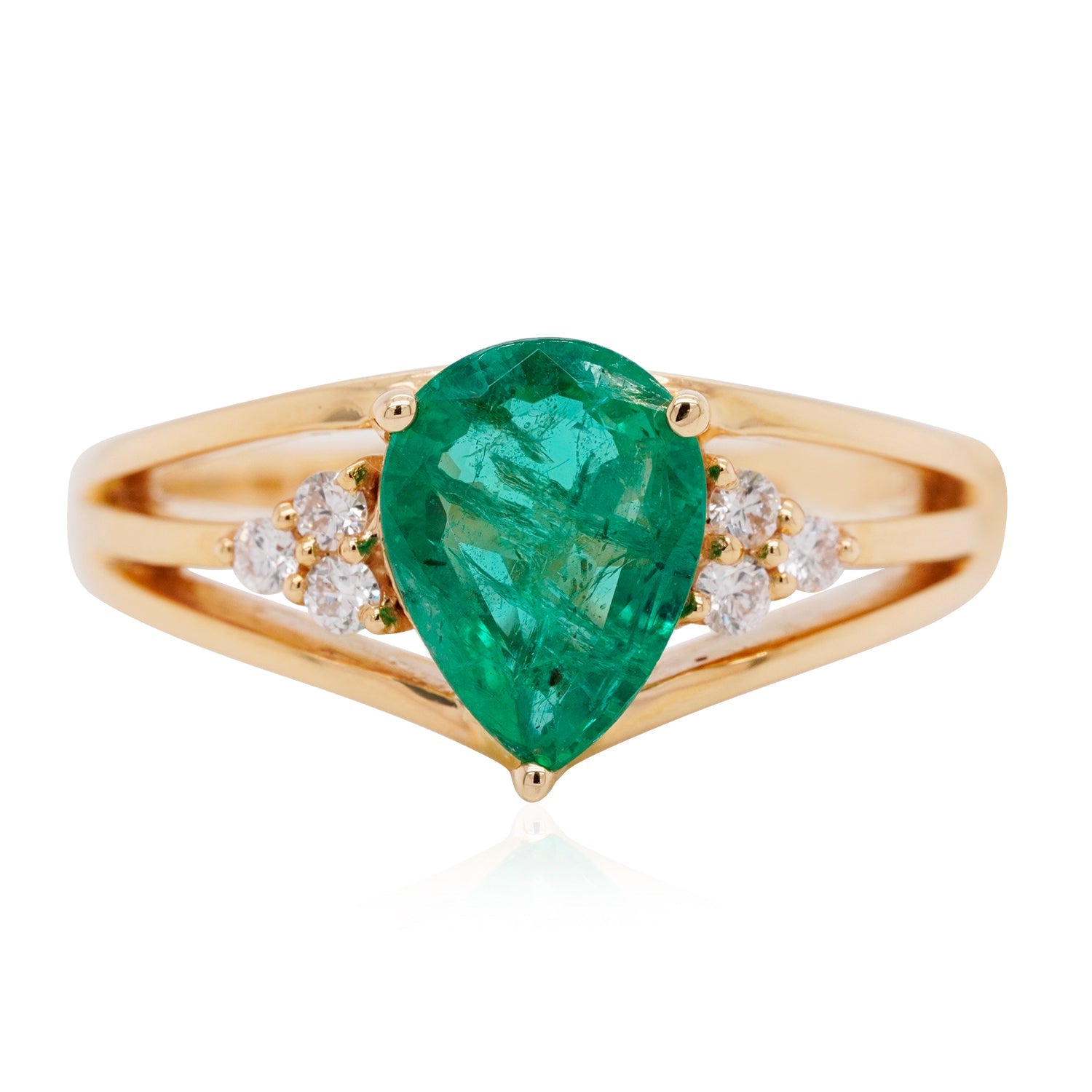The 18K yellow gold used in this ring heightens the deep green of the emerald that reflects beautifully in the light. Featuring a pear cut, it is further highlighted by the round diamonds that glitter and shine. A perfect mix of contemporary and classic styles, this fascinating jewelry makes the woman in you feel loved and pampered. A token of latest trend, this glorious ring is crafted in perfect harmony!