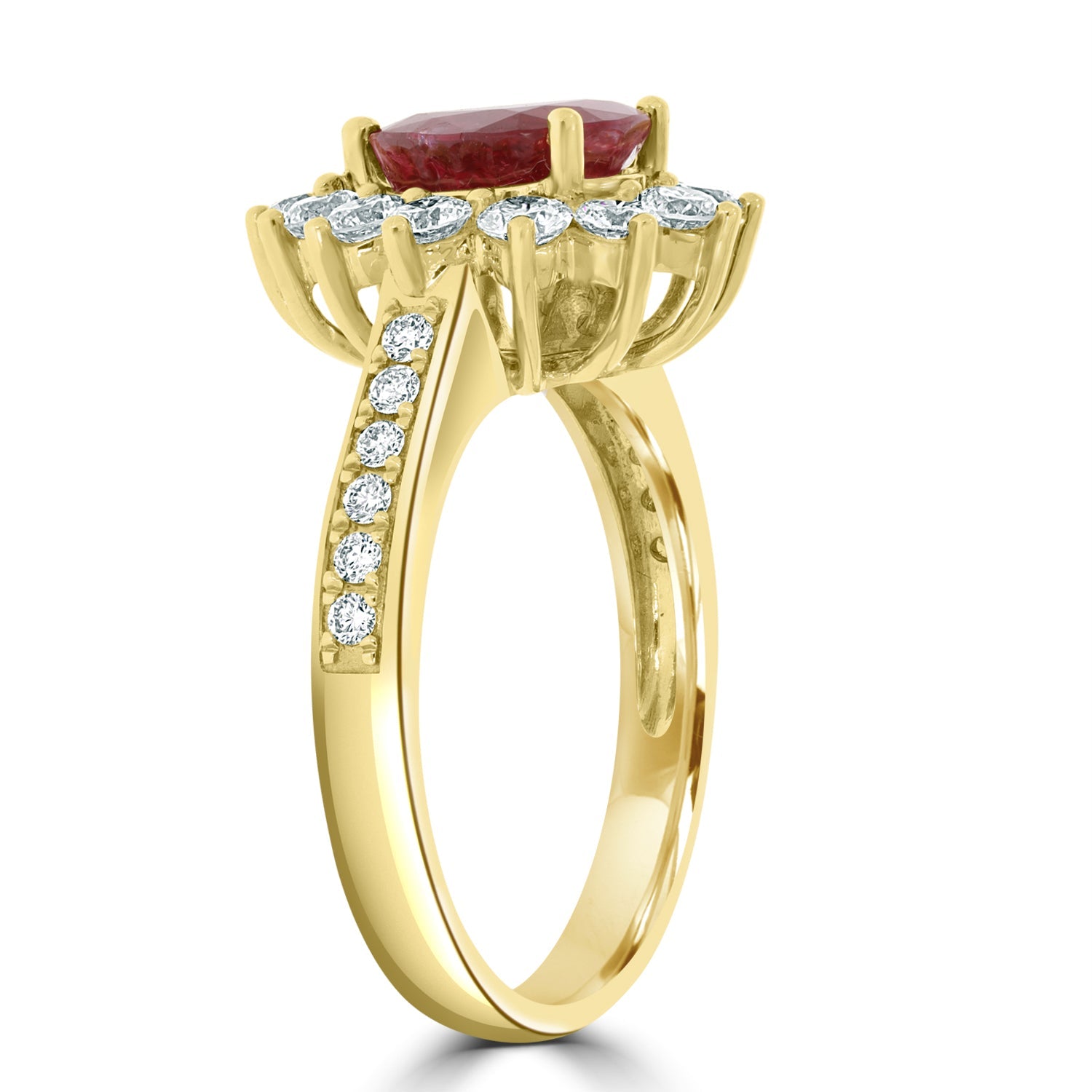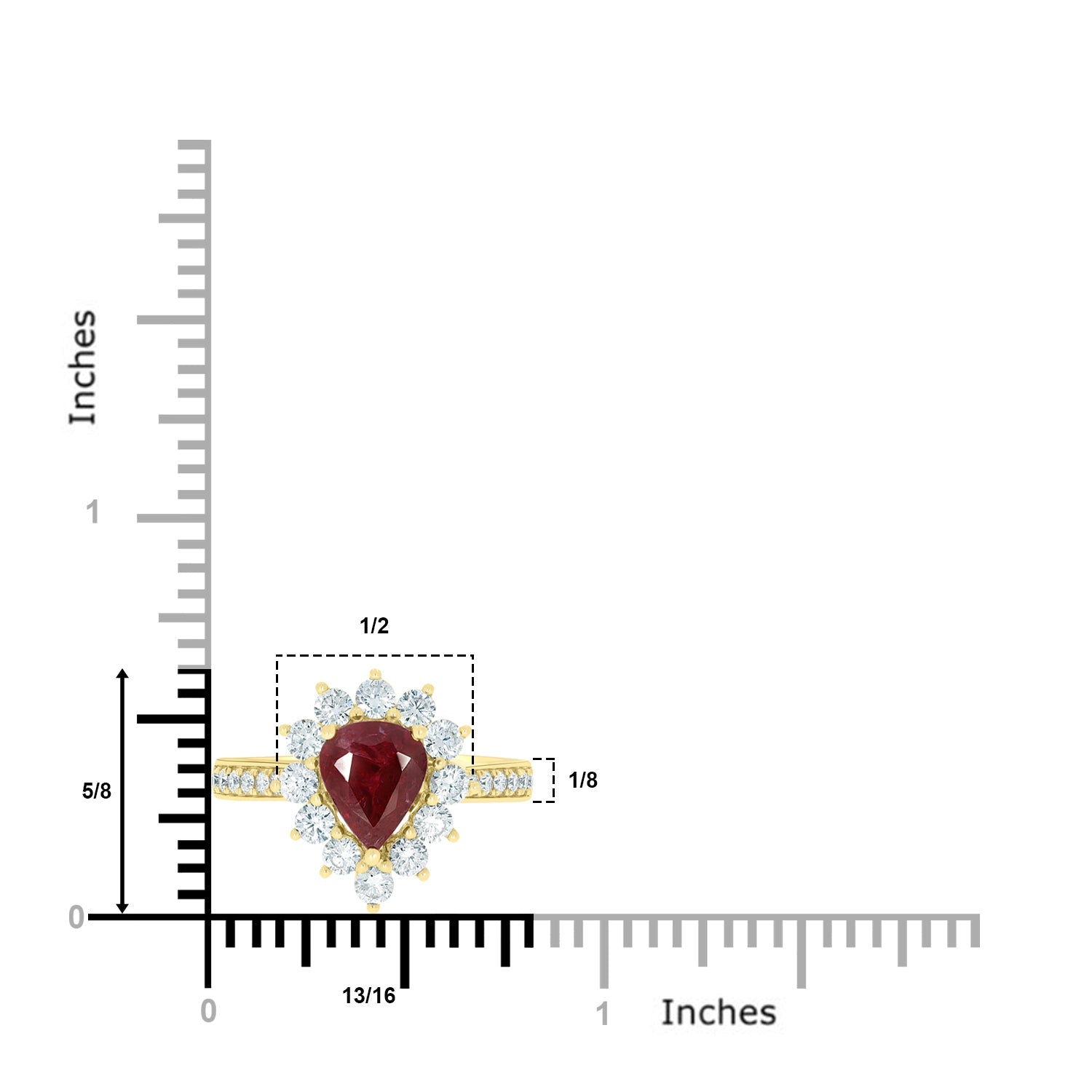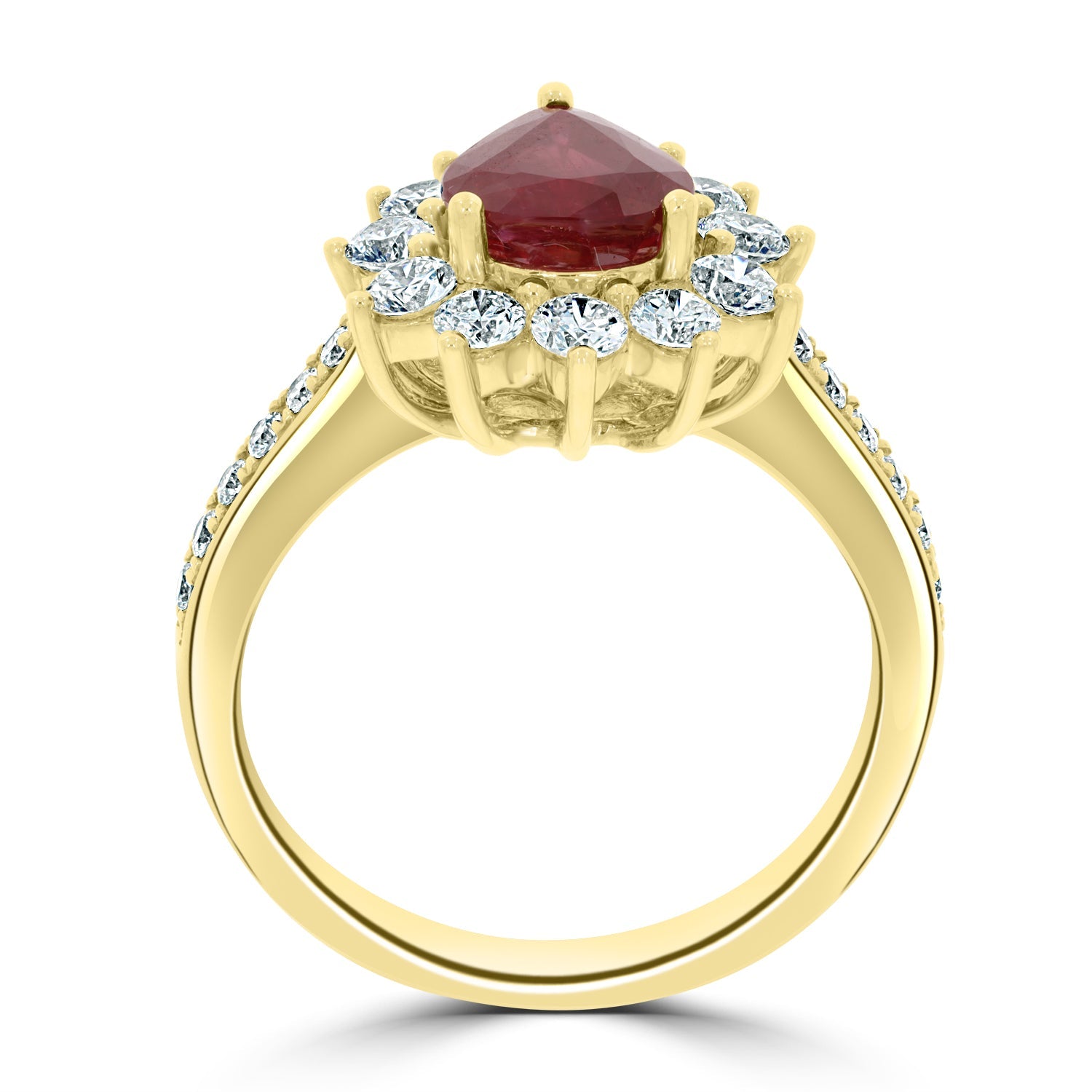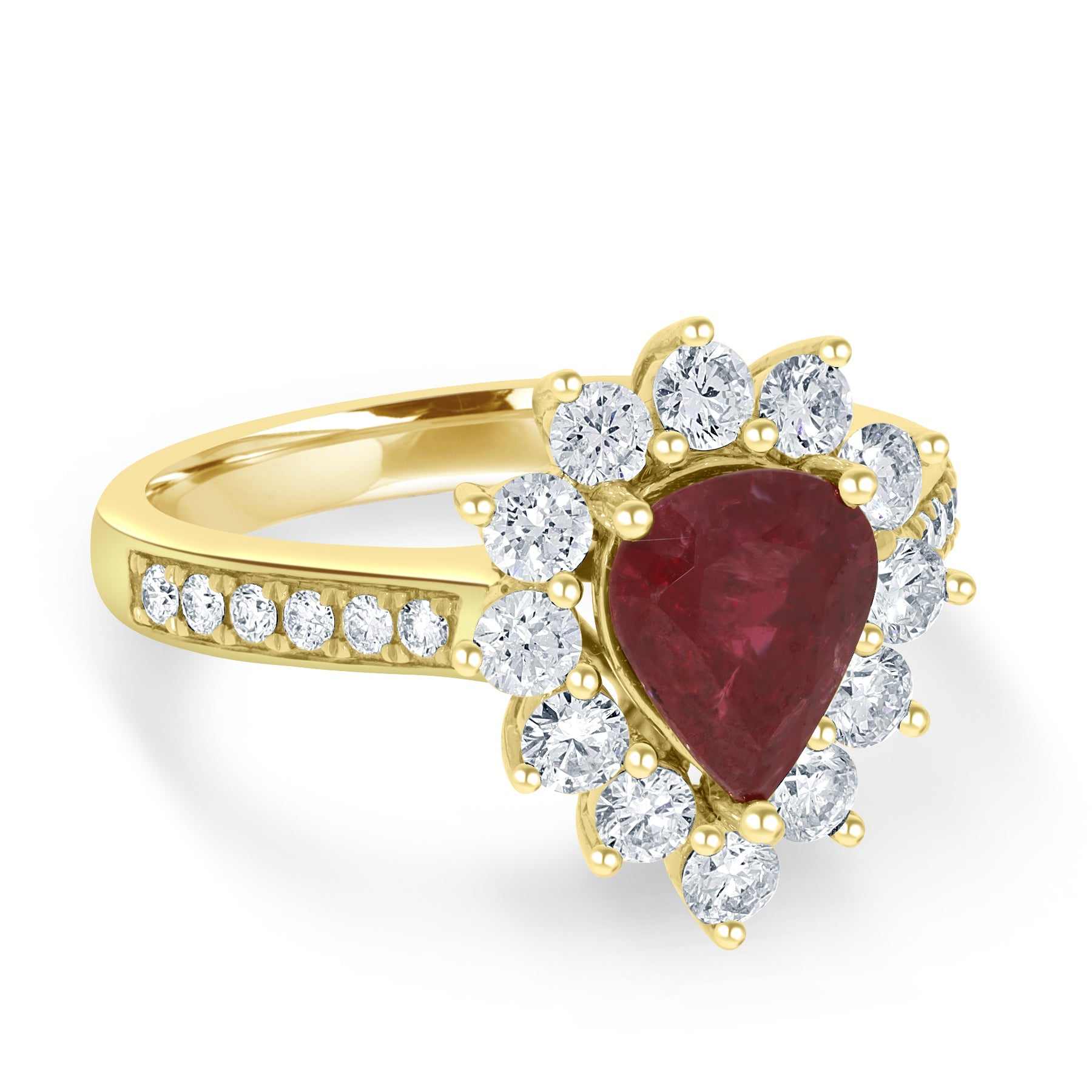 Designed With Shiny 18K Yellow Gold, This Striking Ring Is Set With A Brilliant Pear Cut Of Ruby At The Center And Bordered By Diamonds Which Give It A Dazzling Finish.