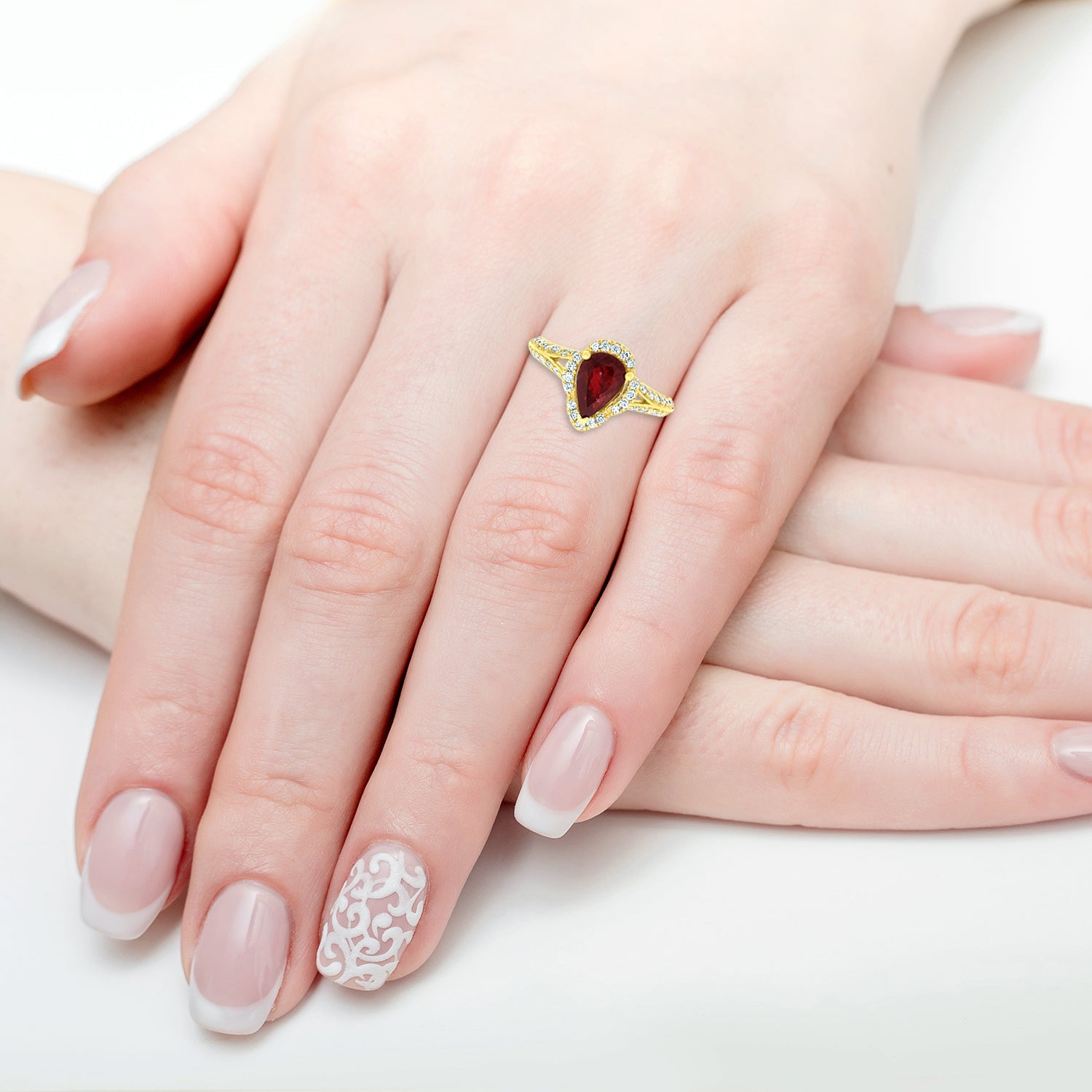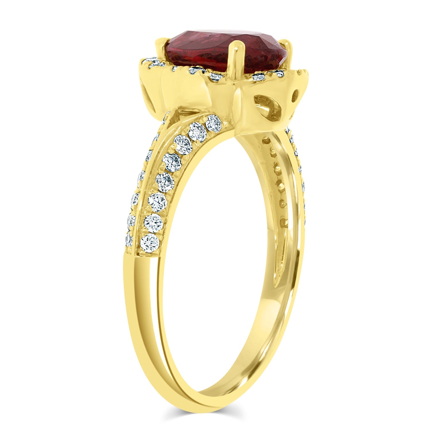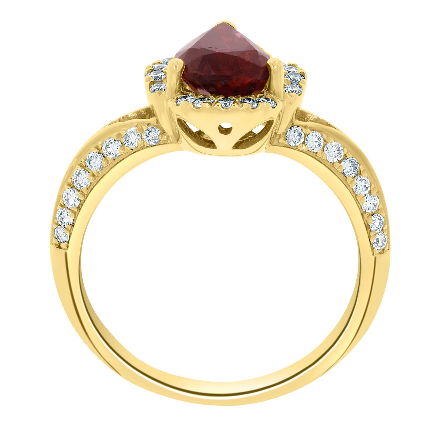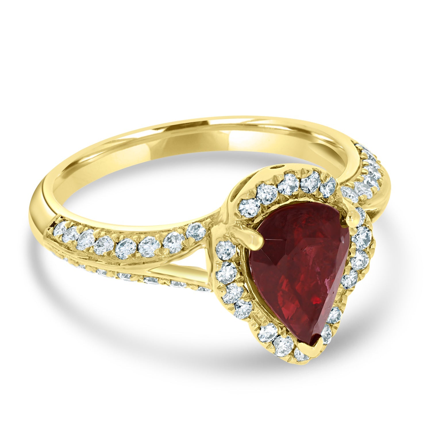 Designed With A Marvelous Pear Cut Ruby, Its Exquisite Design Stands Out Owing To The Shimmering Round Cut Diamonds Around It. Crafted Of 18K Yellow Gold, Wear This Stunning Ring To Any Event.