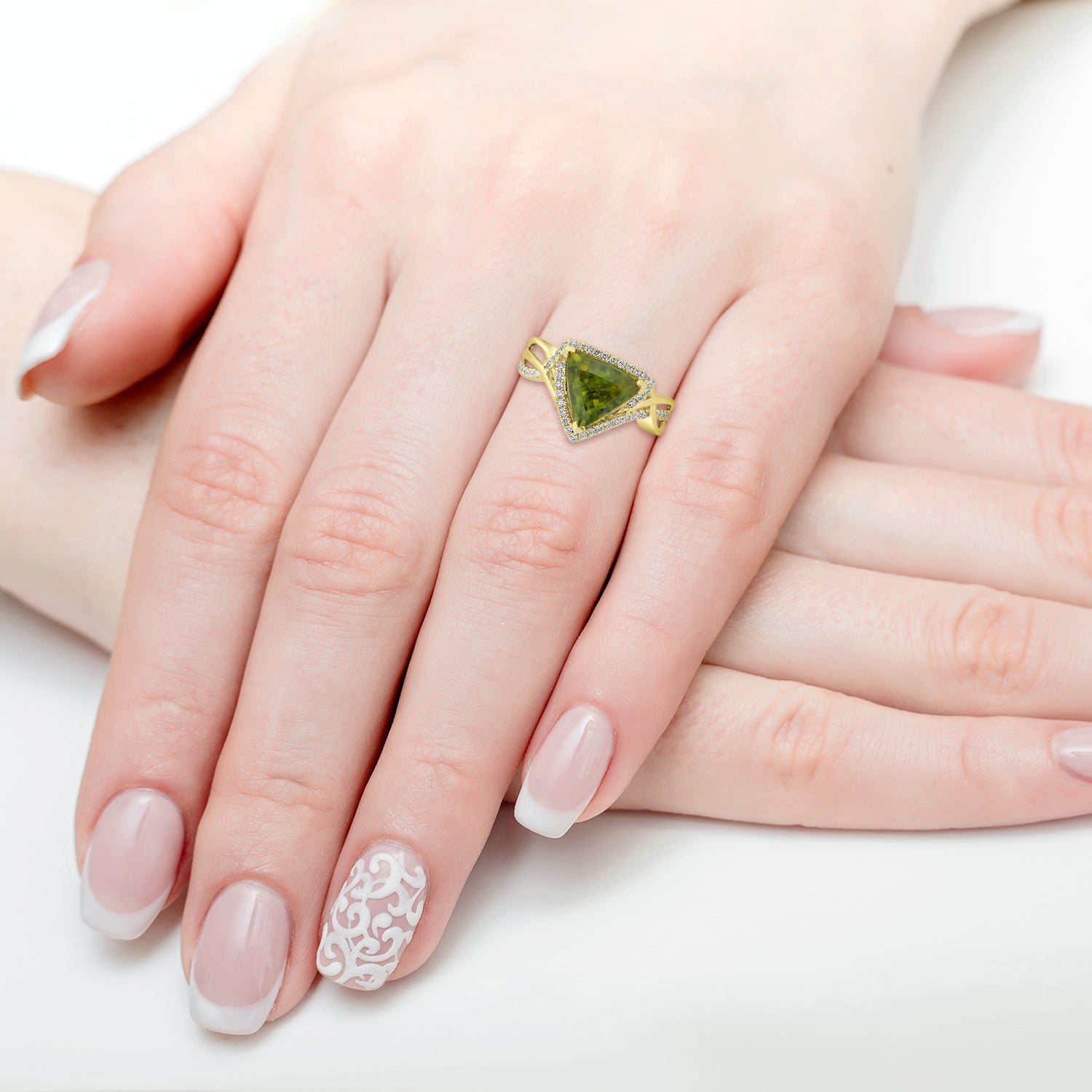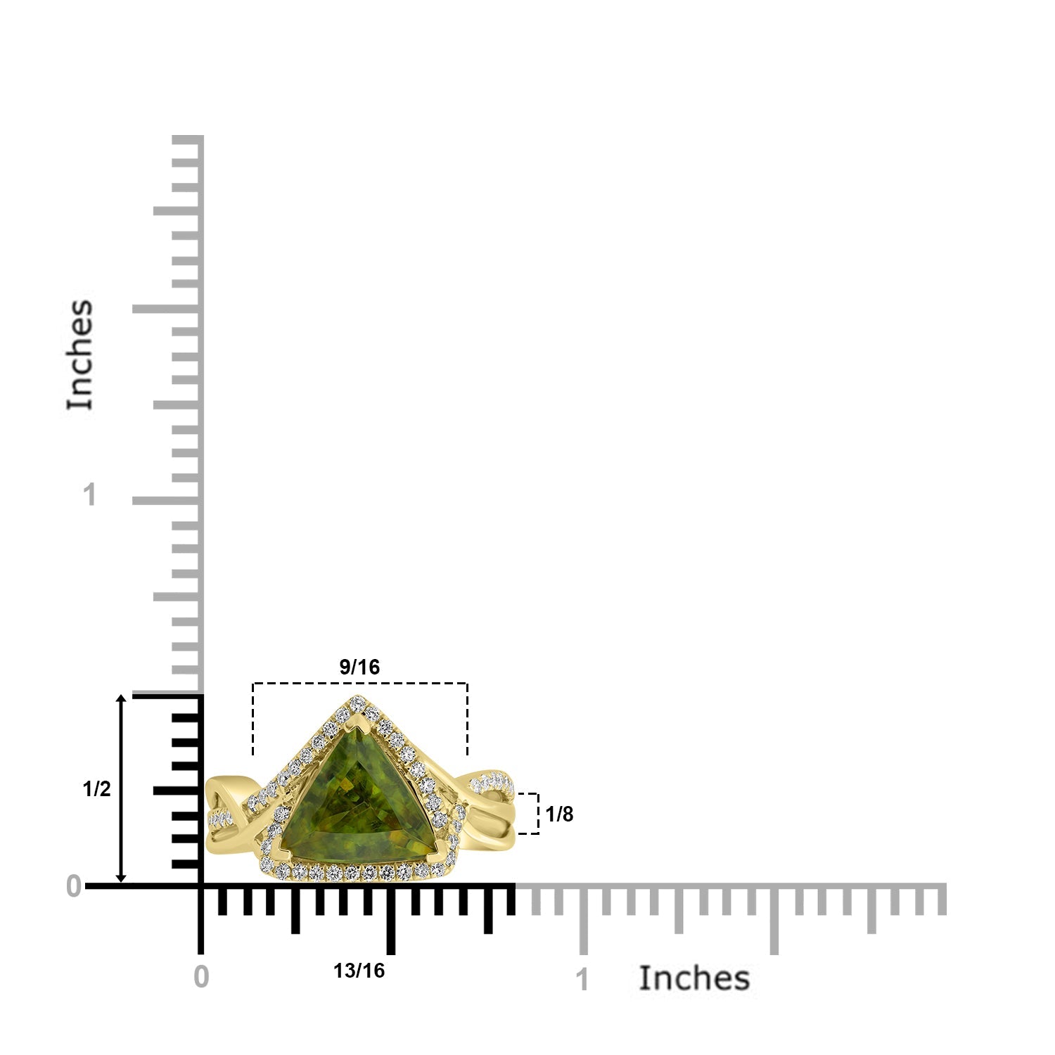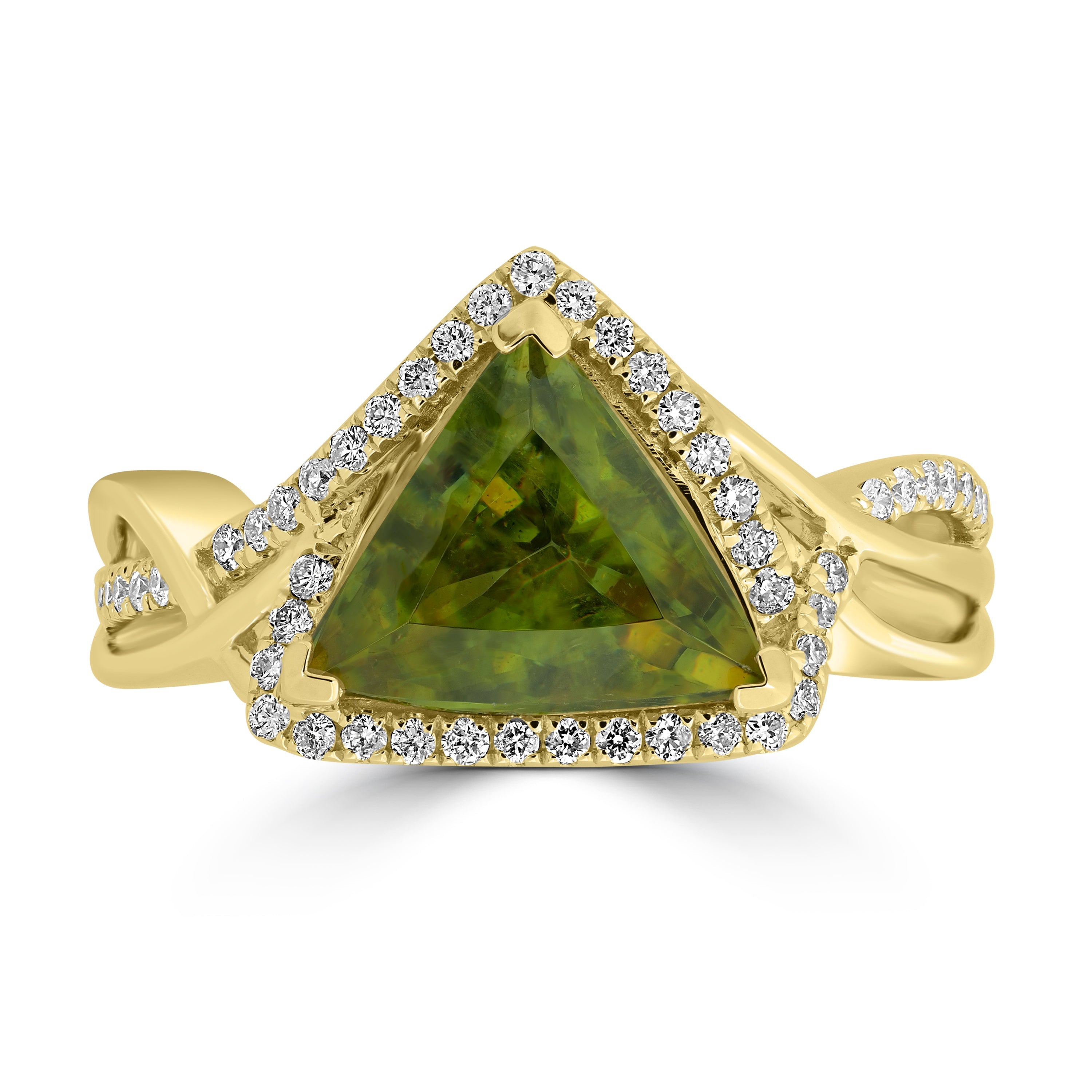 Crafted with 18K yellow gold, this stylish ring showcases the exceptional craftsmanship and a captivating design. The opulent trillion-cut Sphene and round Diamonds embellish this charming ring, adding a touch of luxury and elegance.