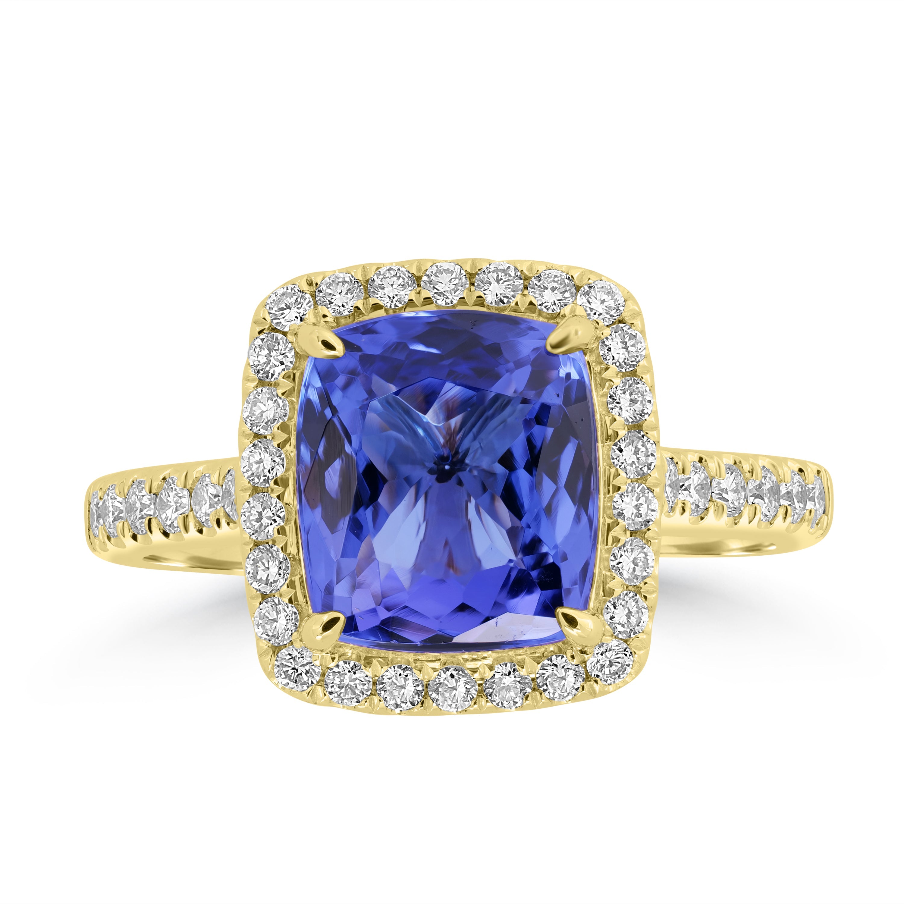 Crafted with 18K yellow gold, this fabulous ring offers added elegance to your look. Adorned with cushion-cut Tanzanite and round Diamonds, it reflects advanced artistry and luxury look, perfect for parties and special events.