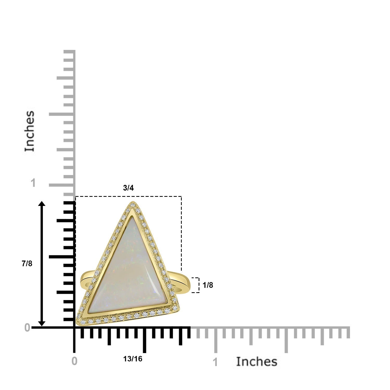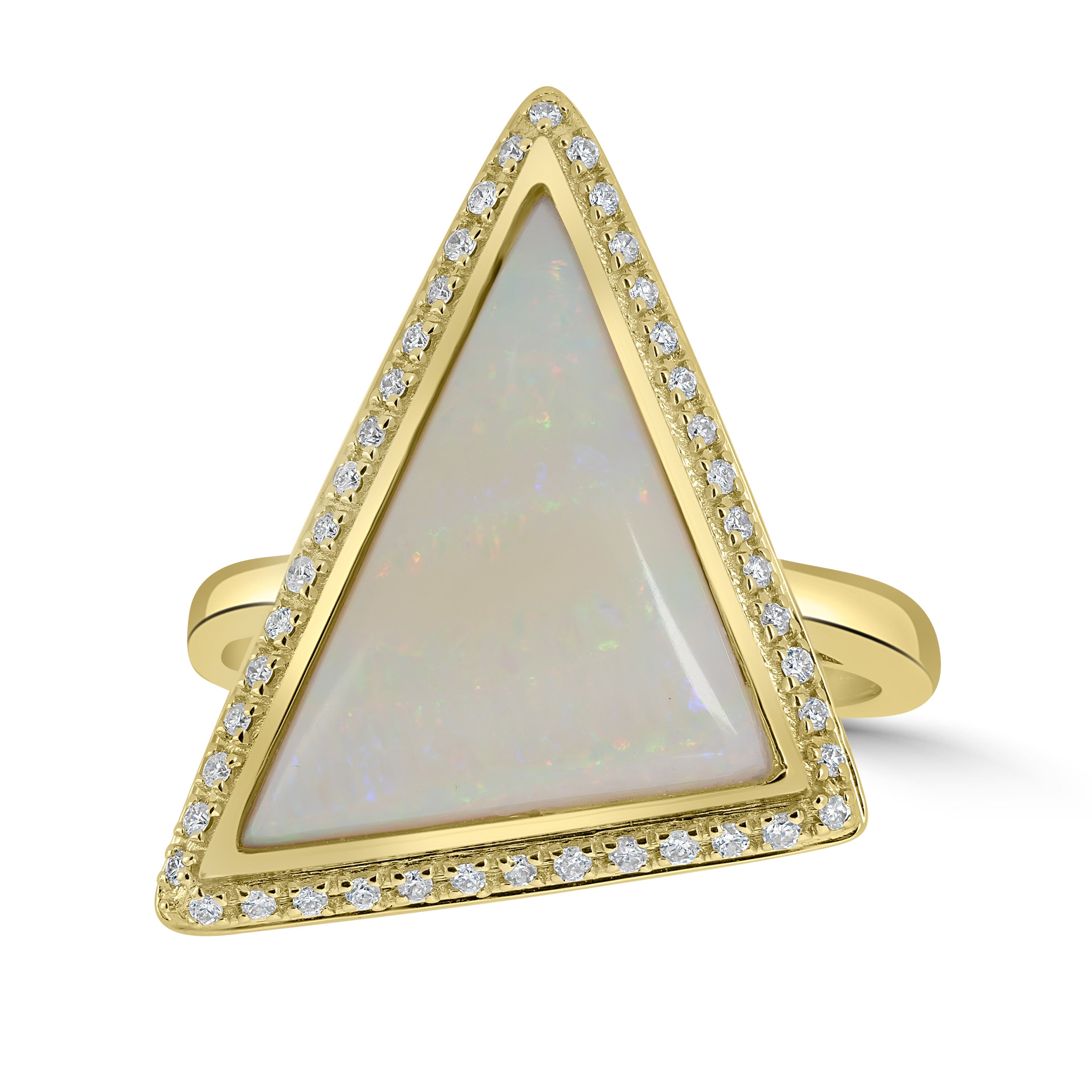 This 18K yellow gold ring is subtle and fashioned in a way that shows off the artist's skill. It's a beautiful piece to keep forever. Fashioned with precision and skill to bring out the actual dazzle of the trillion-cut Opal and round Diamonds, this piece is your perfect companion for parties and special occasions.