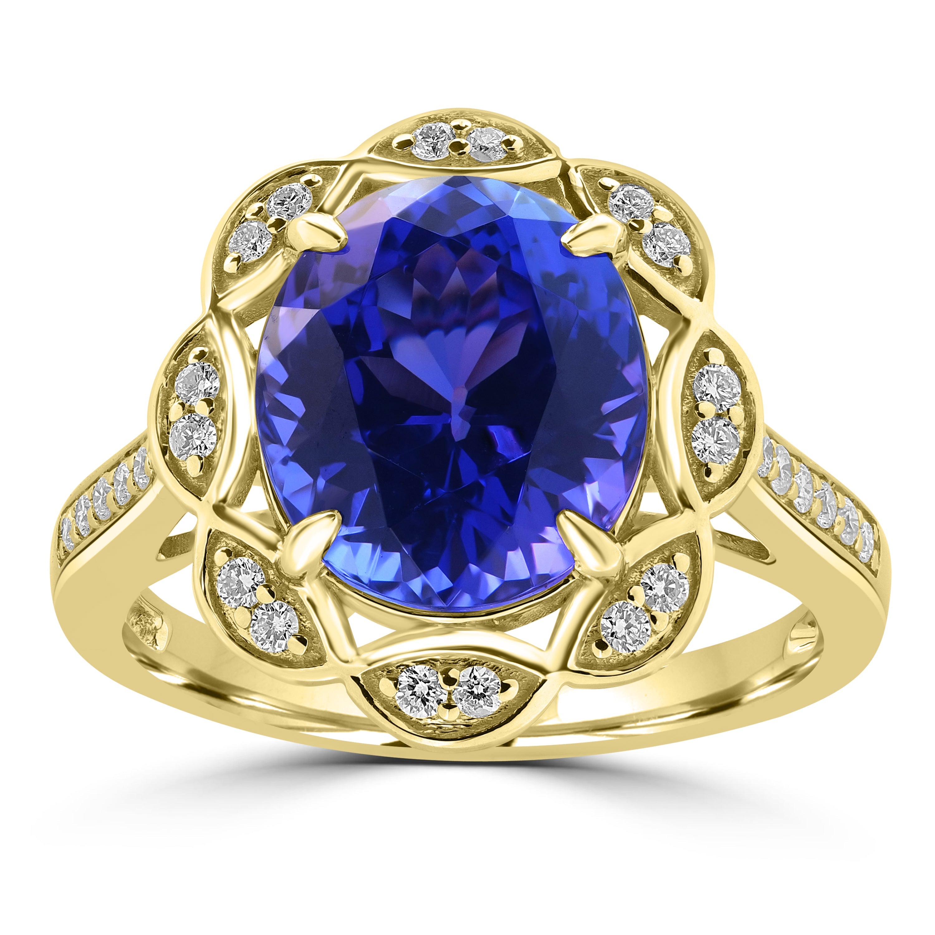 Crafted expertly, this 18K yellow gold ring will add a new dimension to your luxury style. The design showcases oval-cut Tanzanite and round Diamonds that add sparkle and charm to your look.