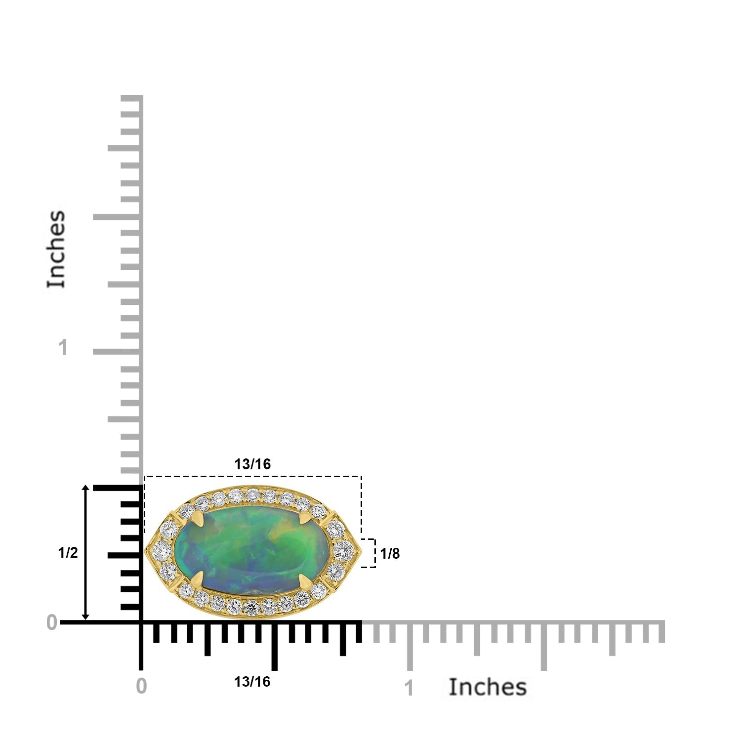 Elevate your style with this carefully crafted 18K yellow gold ring. Its exquisite design, featuring an oval-cut black Opal and round Diamonds, adds a touch of elegance and charm to any outfit. Make a statement with this exquisite and captivating piece.