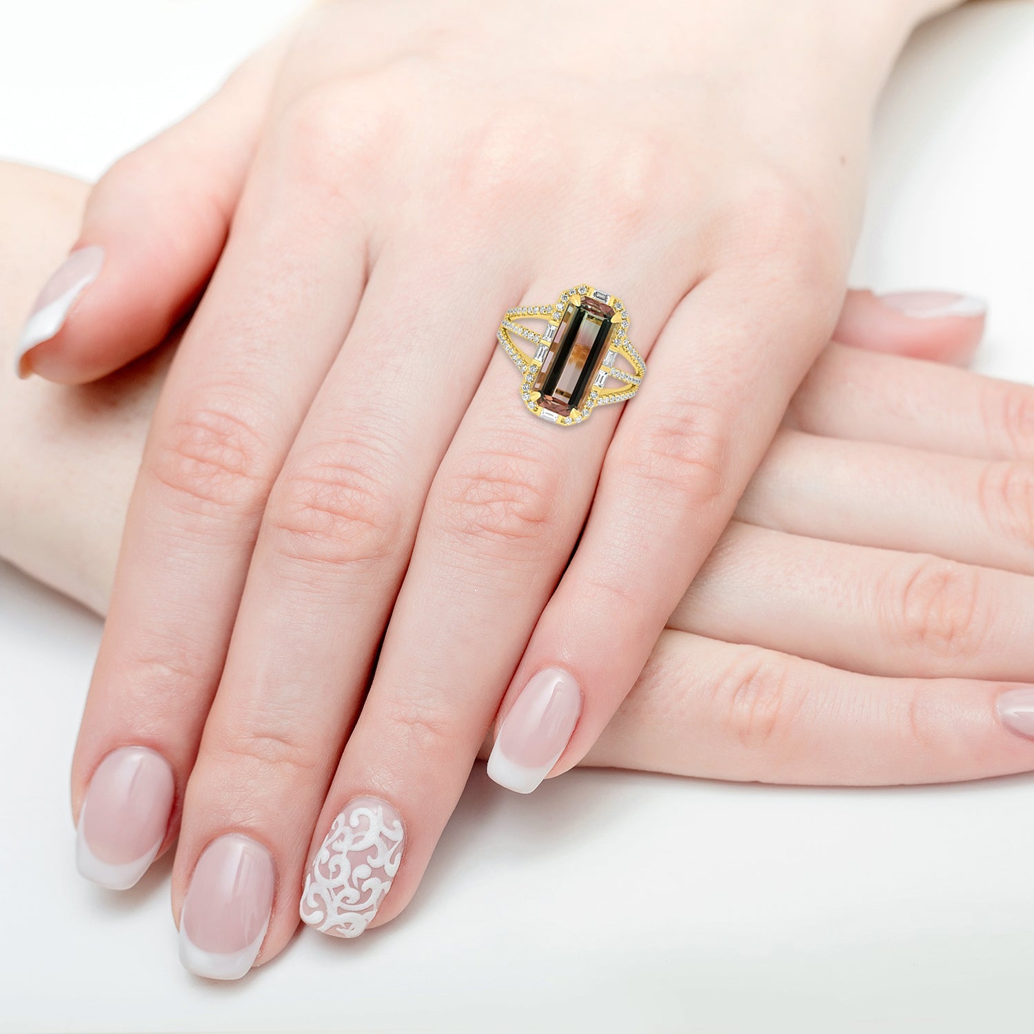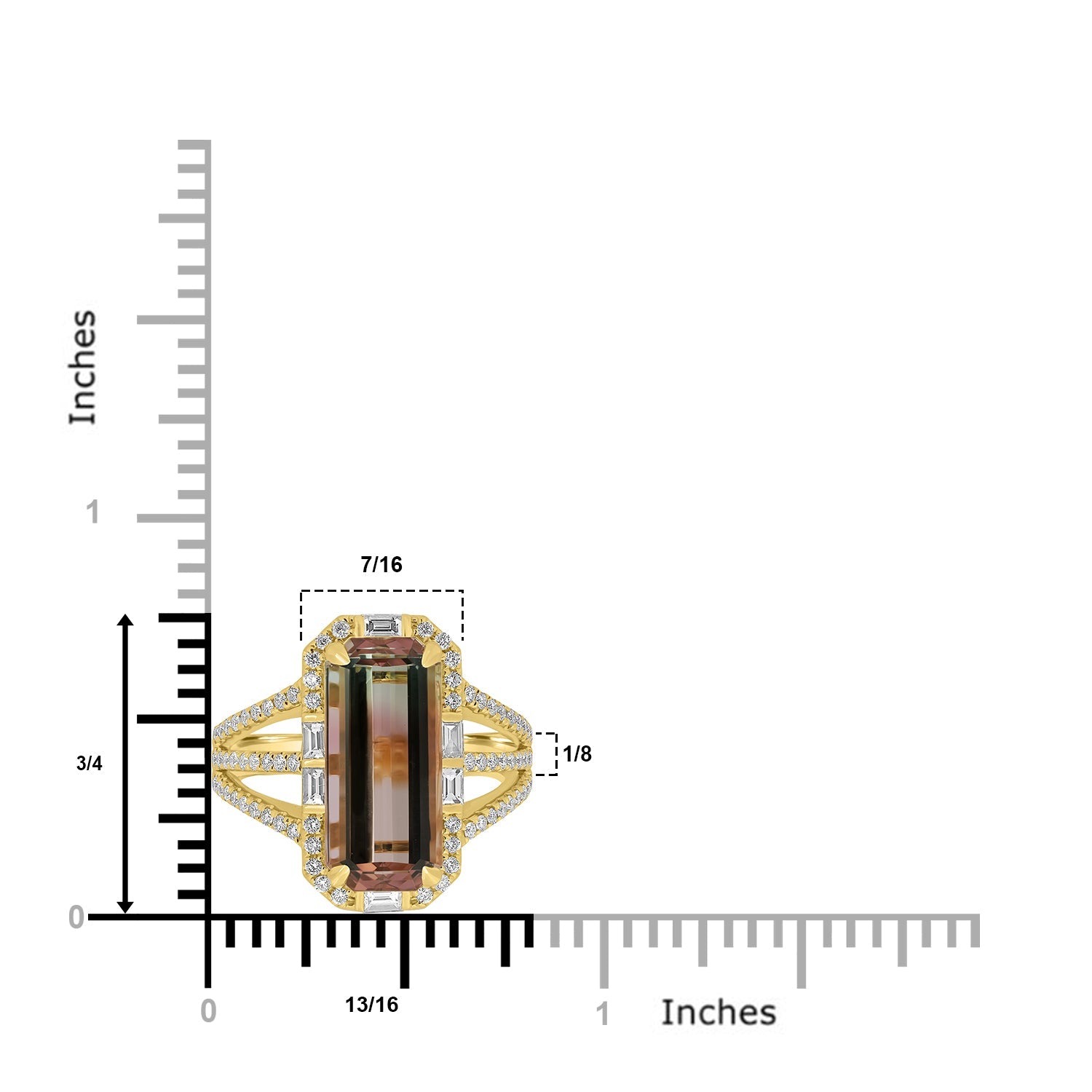 Be it simple or grand events, this luscious ring will complement your look perfectly. Carefully crafted with lustrous 18k yellow gold and embellished with octagon-cut Tourmaline and round Diamonds, this classy ring will set you apart from the crowd.