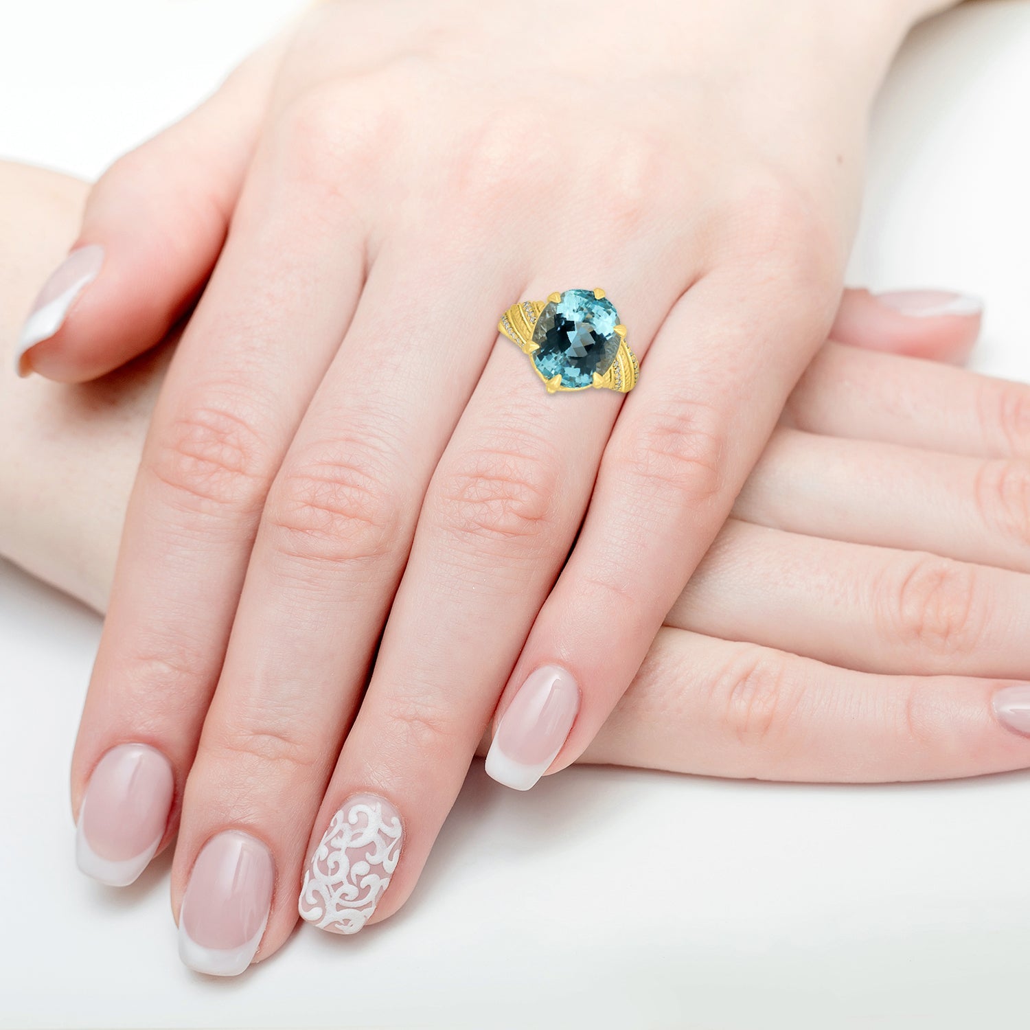 Fashioned in 18k yellow gold, wear this timeless, adorable ring for special occasions and parties. Stylish and sophisticated at the same time, this glamorous ring has a trendy design embellished with oval-cut Aquamarine and round Diamonds that creates a fabulous look.