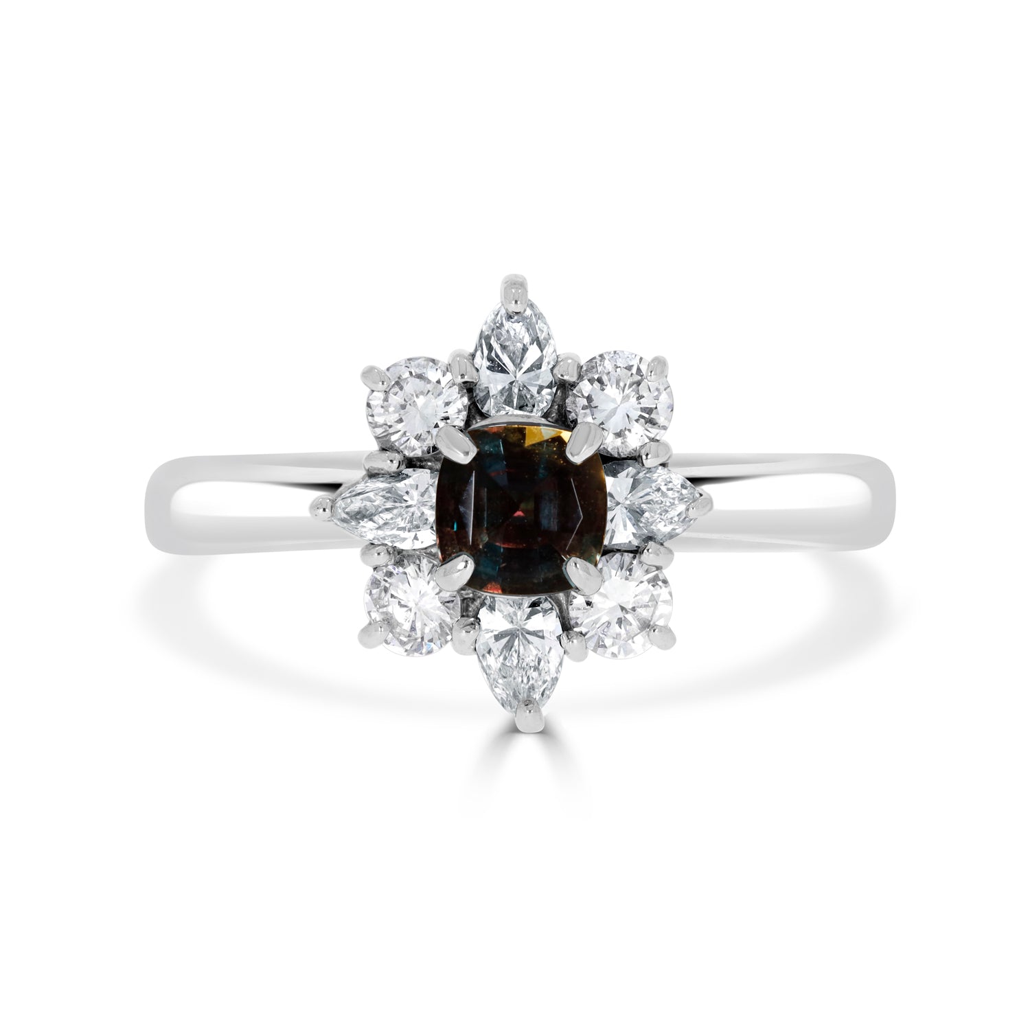 Fashioned From PT900 Platinum, This Classy Piece Looks Fabulous And Adds A Dynamic Shimmer To Your Stylish Look. This Ring Is Adorned With Cushion-cut Alexandrite, Round Diamonds And Pear-cut Diamonds.