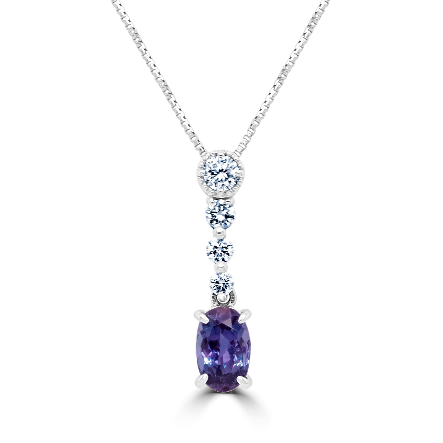 Set with a breathtaking oval cut Alexandrite at its center, this exquisite pendant is designed with platinum. Surrounded by glittering round cut Diamonds, this is the right pick to showcase your tastes.