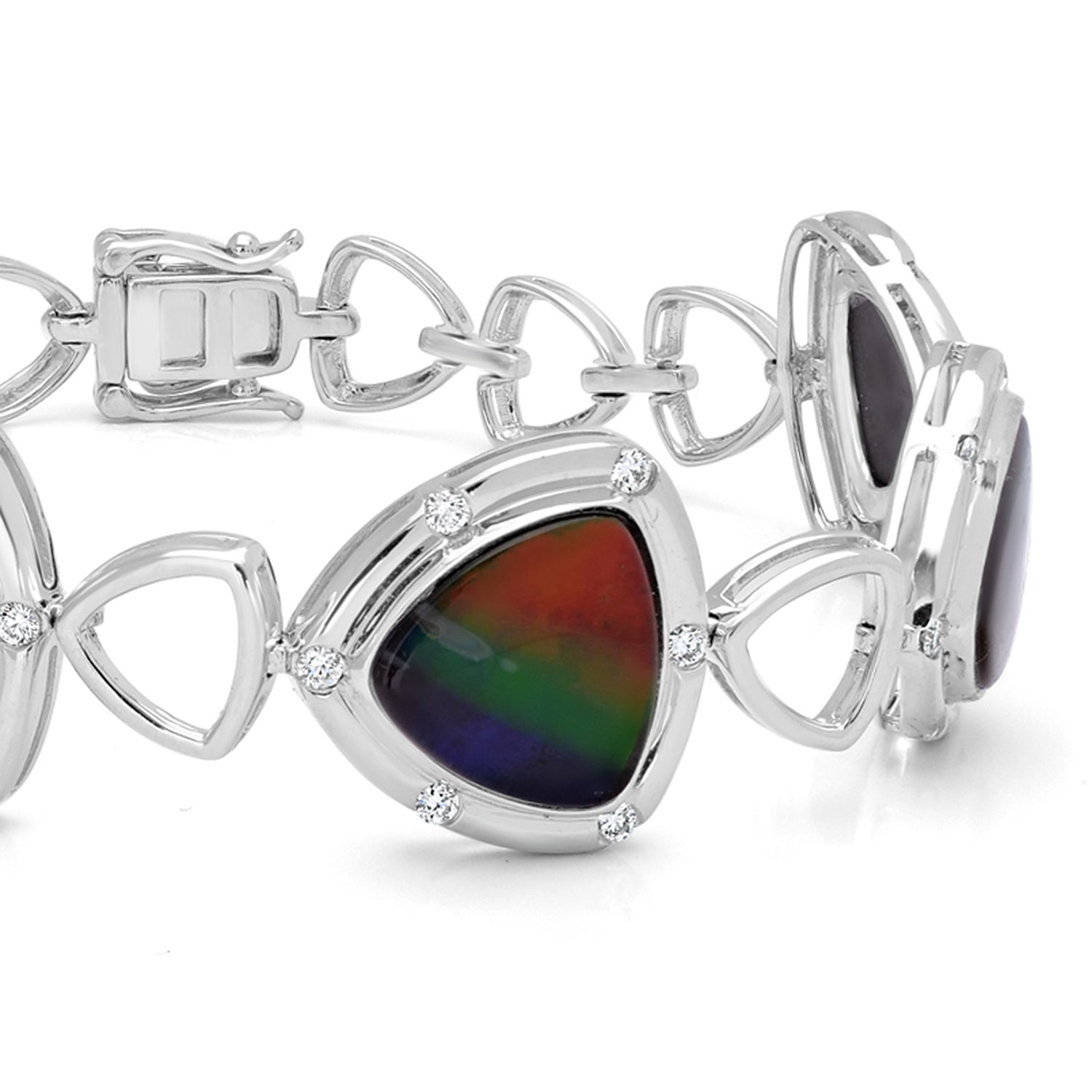 This exotic bracelet is crafted with 14k white gold and set with mix-cut Ammolite and round Diamonds give a mesmerizing look.