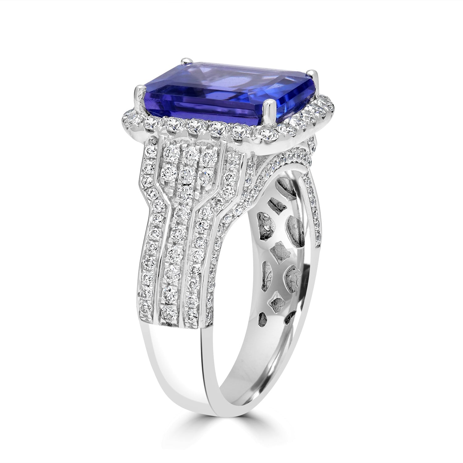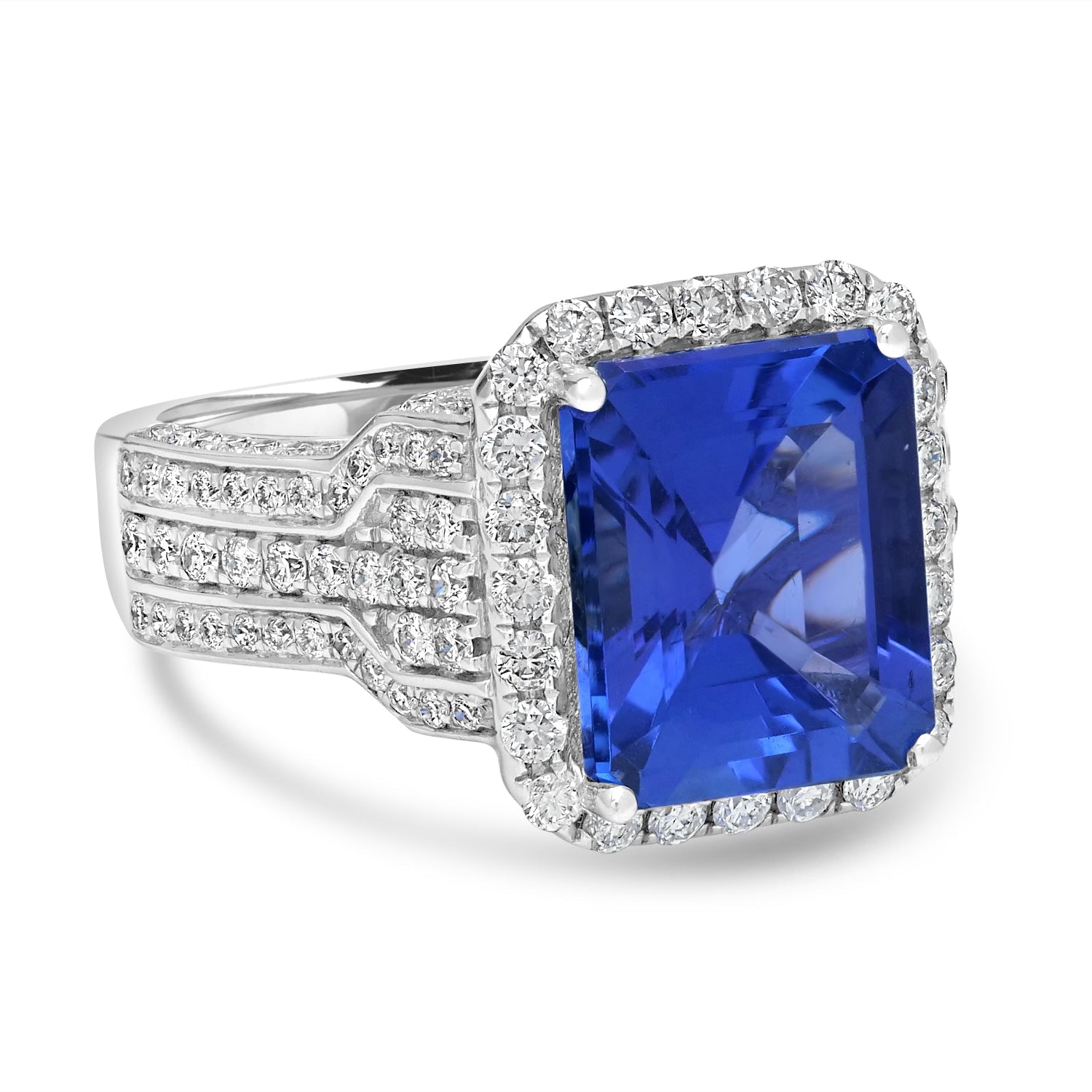 "Fashioned with 14k white gold, this timeless ring features emerald-cut Tanzanite and round Diamonds. An excellent ring sure to receive compliments."