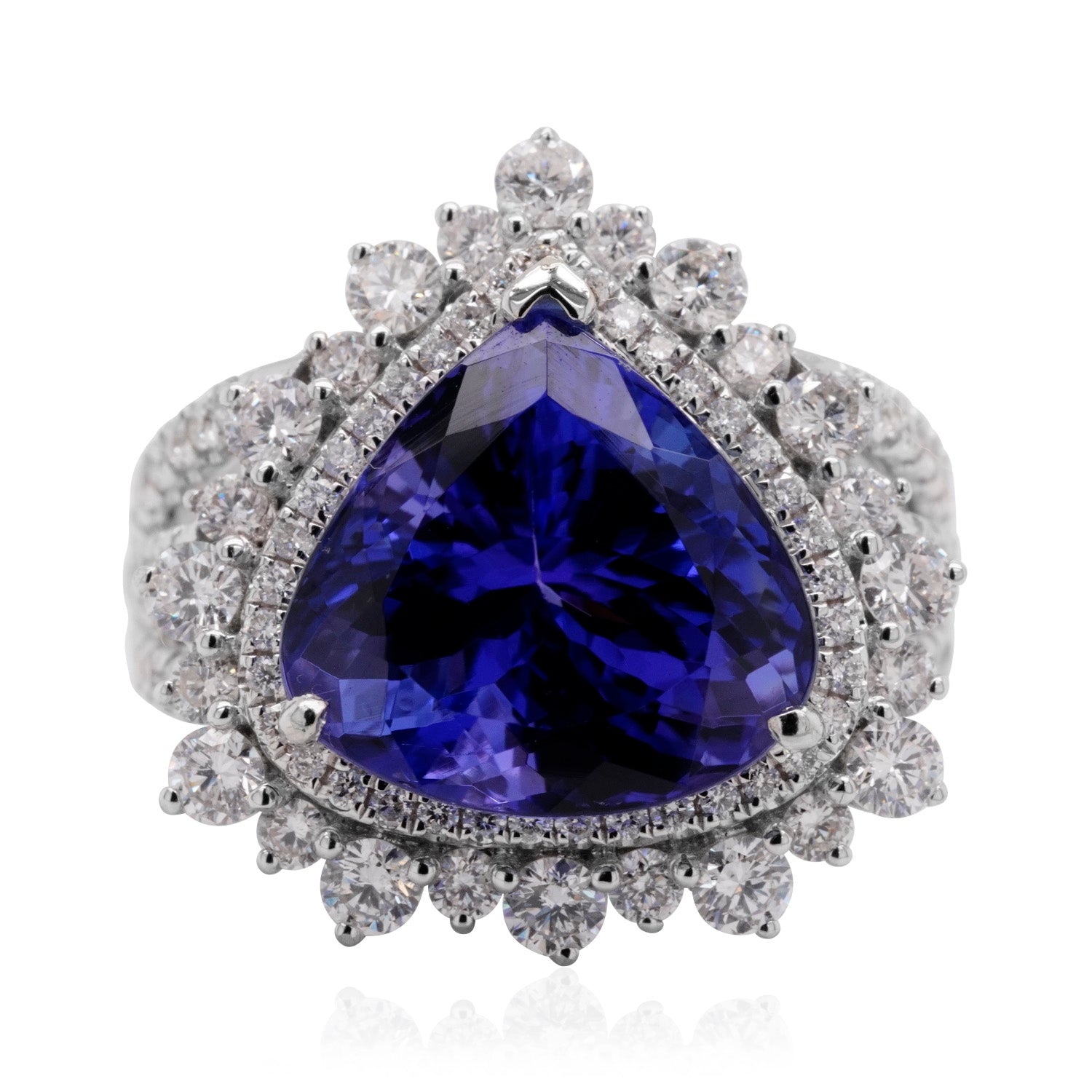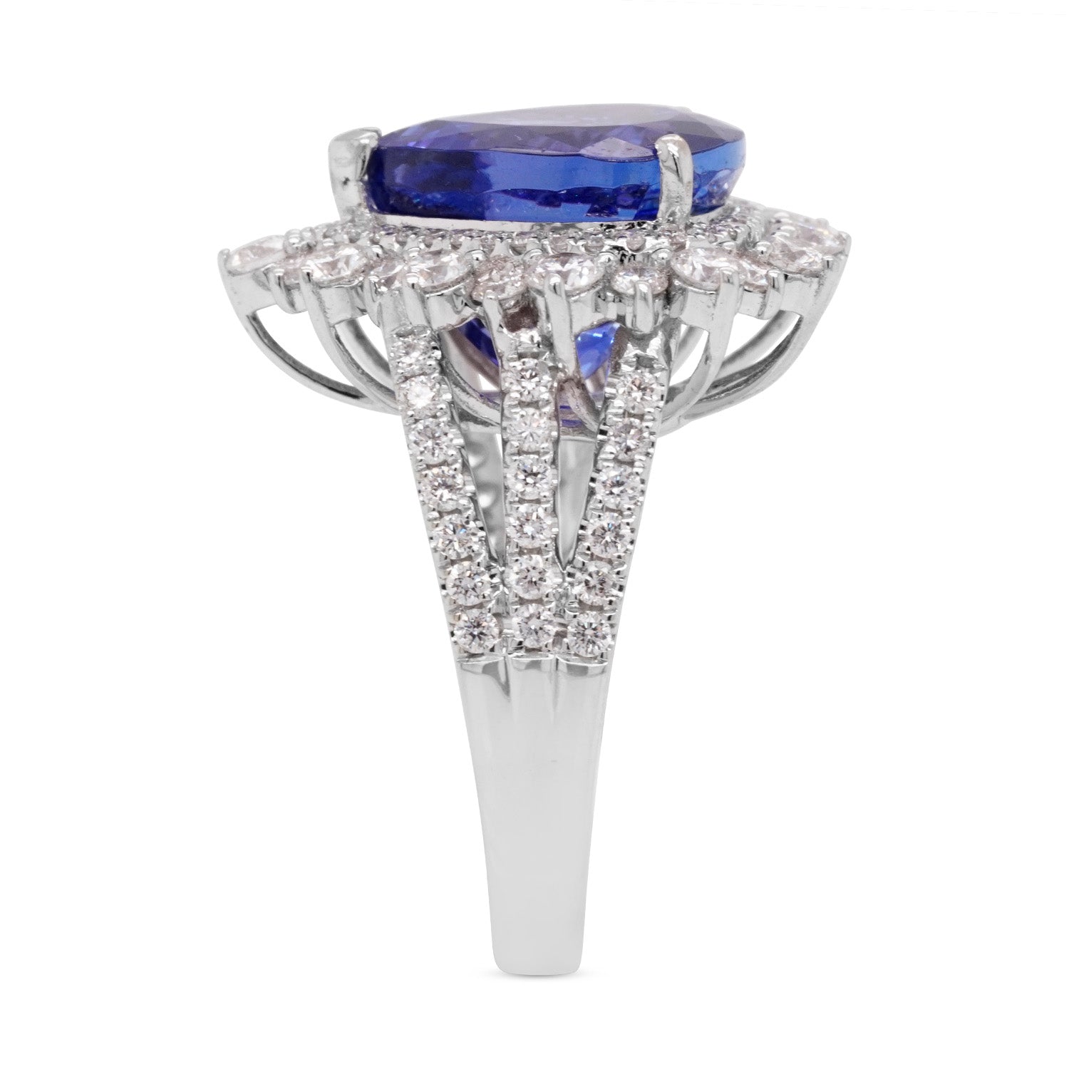 The modern and classic styles of this ring give your ensemble an effortless finish. Designed in 14K white gold, its glorious sheen gives your look a rich finish while the brilliance of the pear cut Tanzanite adds a dash of glamour. Furthermore, this striking gemstone is flanked by round cut Diamonds which give it sparkle and shine. Jewelry that you will never take off, opt for this incredible ring soon!