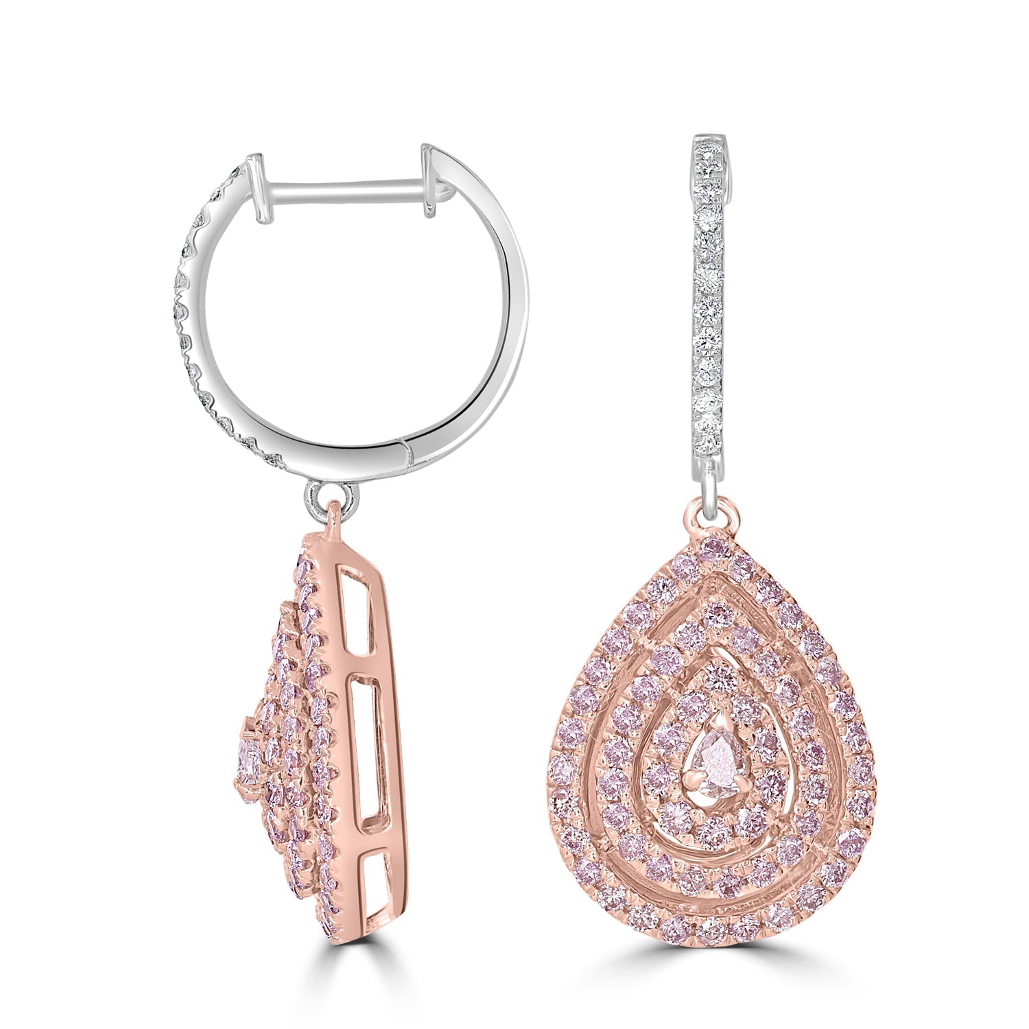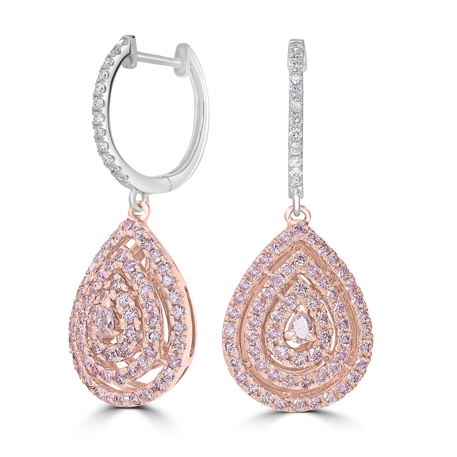 Fashioned with 14k two-tone gold, these earrings are set with an exquisite pear-cut pink Diamond and round Diamonds that have a truly brilliant sparkle. Wear these charming earrings and leave everyone dazzled.