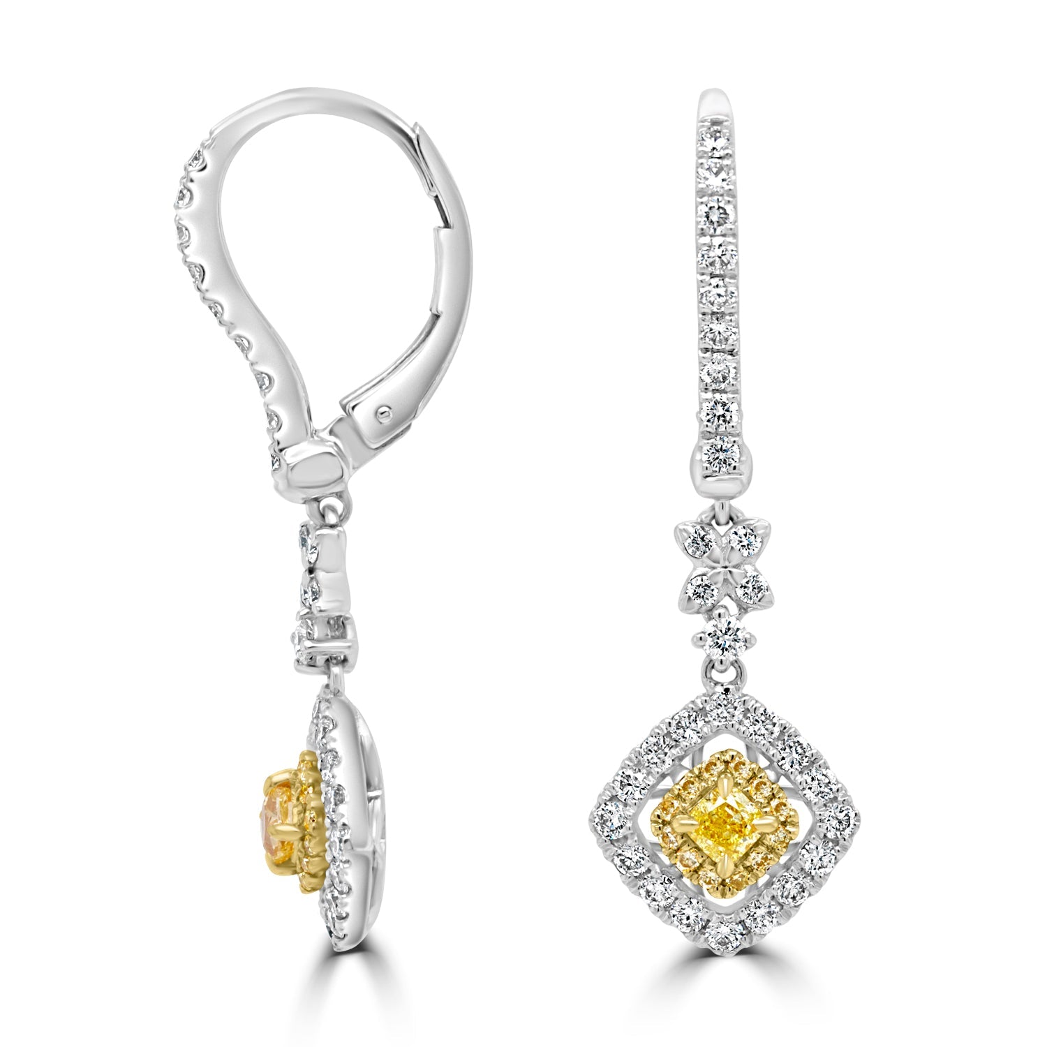 Designed with 18K two tone gold for added beauty, these enchanting earrings are set with a marvelous cushion cut Diamond in its center and bordered by shimmering round cut Diamonds.