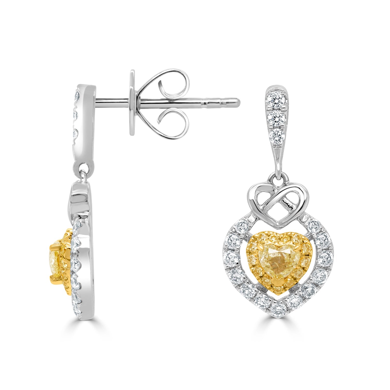These earrings adorned with heart cut Diamond and round-cut Diamond strikes the perfect balance between sophistication and statement-making tale. The 18K two-tone gold adds radiance and luxury to the piece.