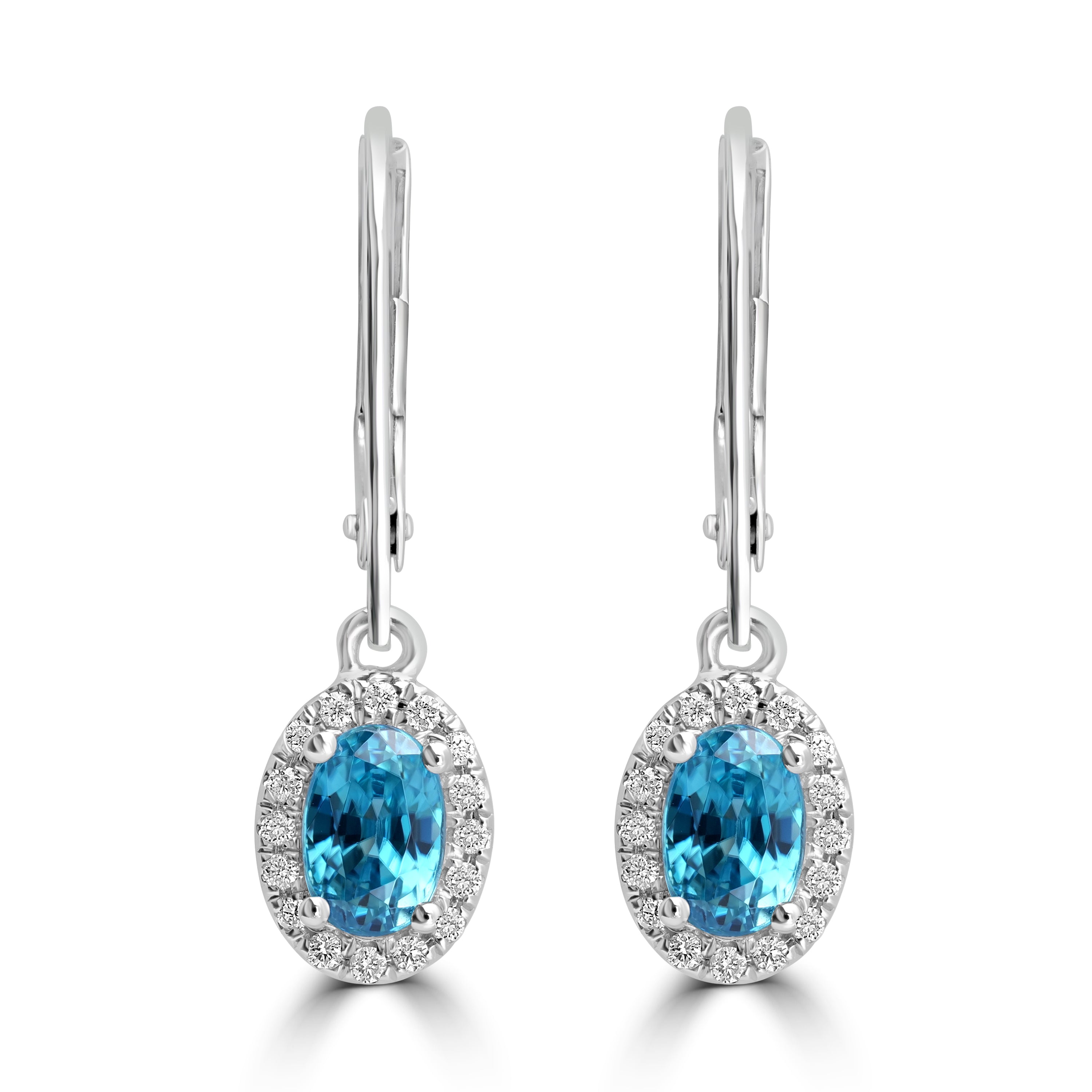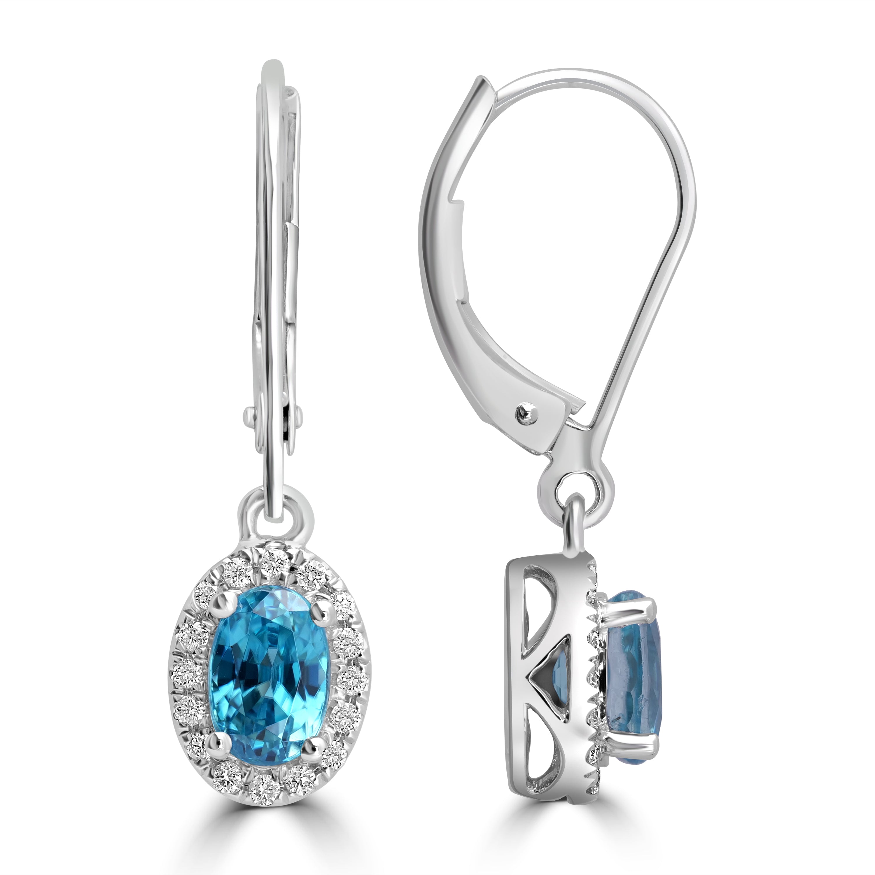 Crafted from 14K white gold with a rich finish, these earrings are fashioned with meticulous detail, featuring a world-class design that adds drama to their appearance. Adorned with oval-cut Blue Zircon and round Diamonds, this piece exudes finesse.