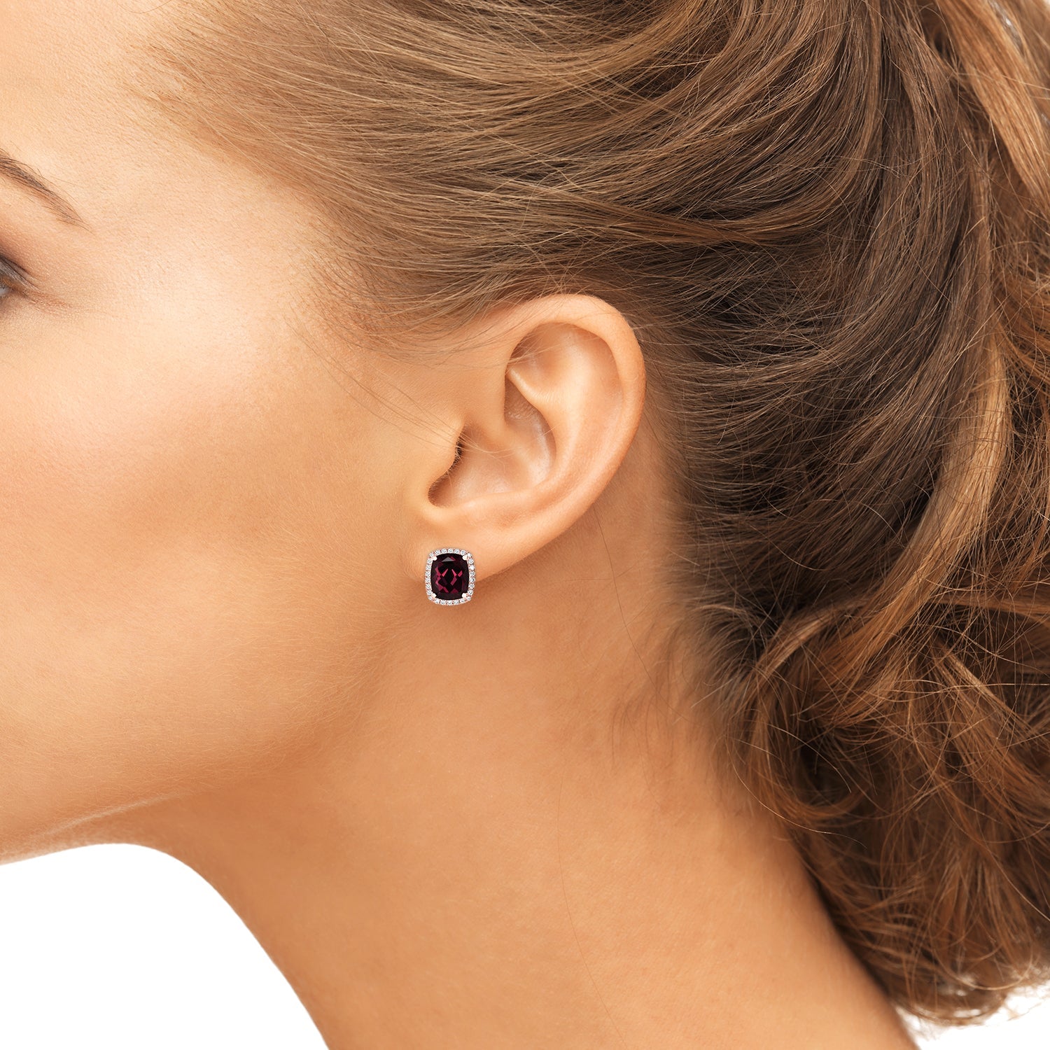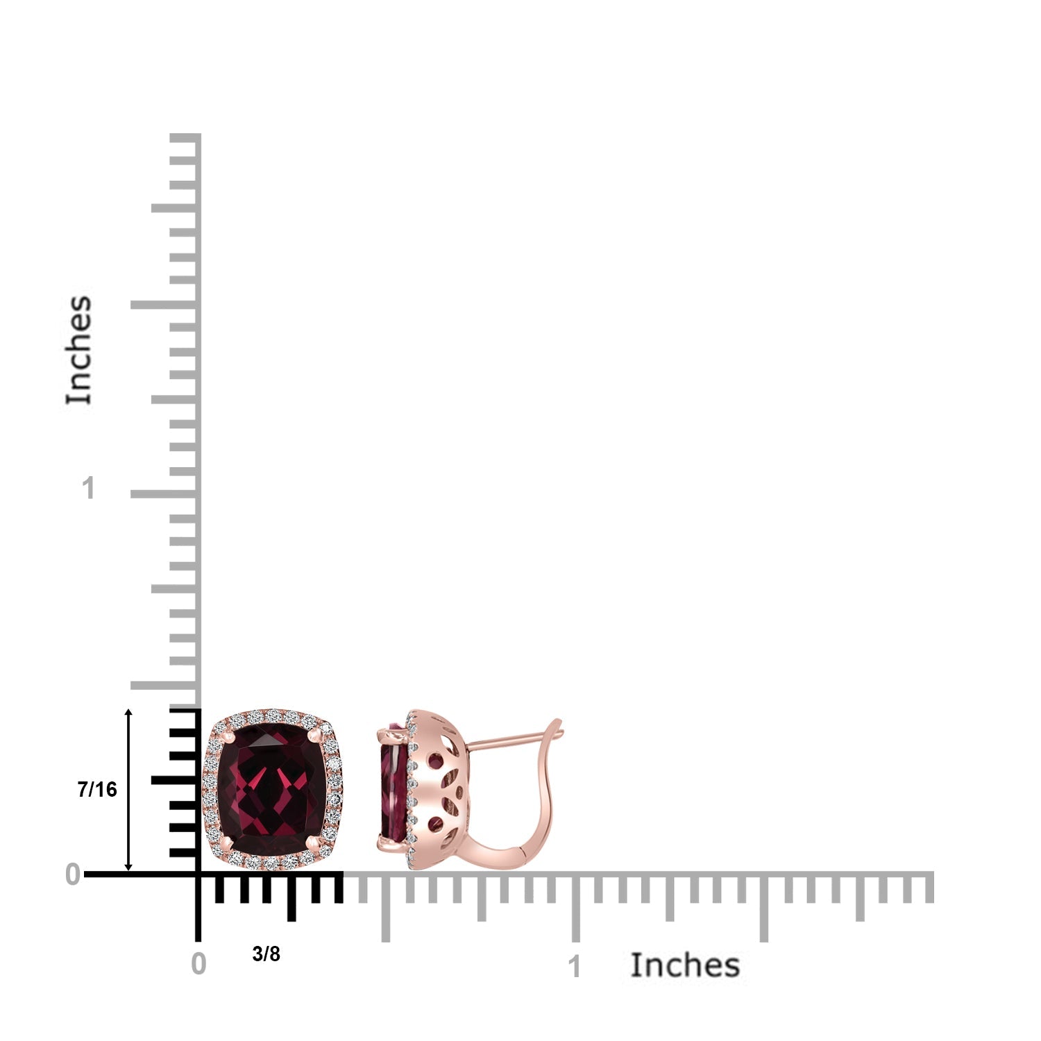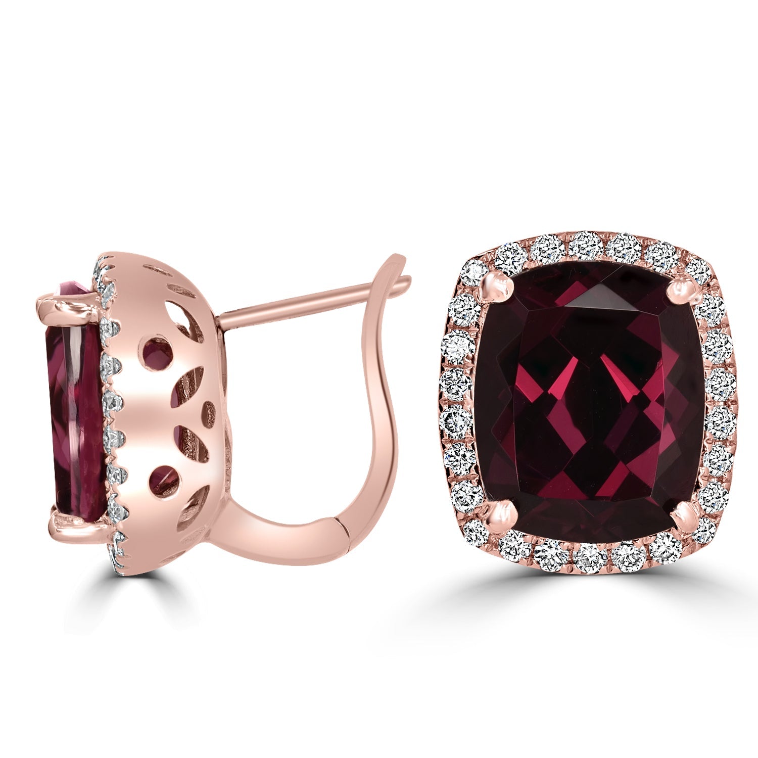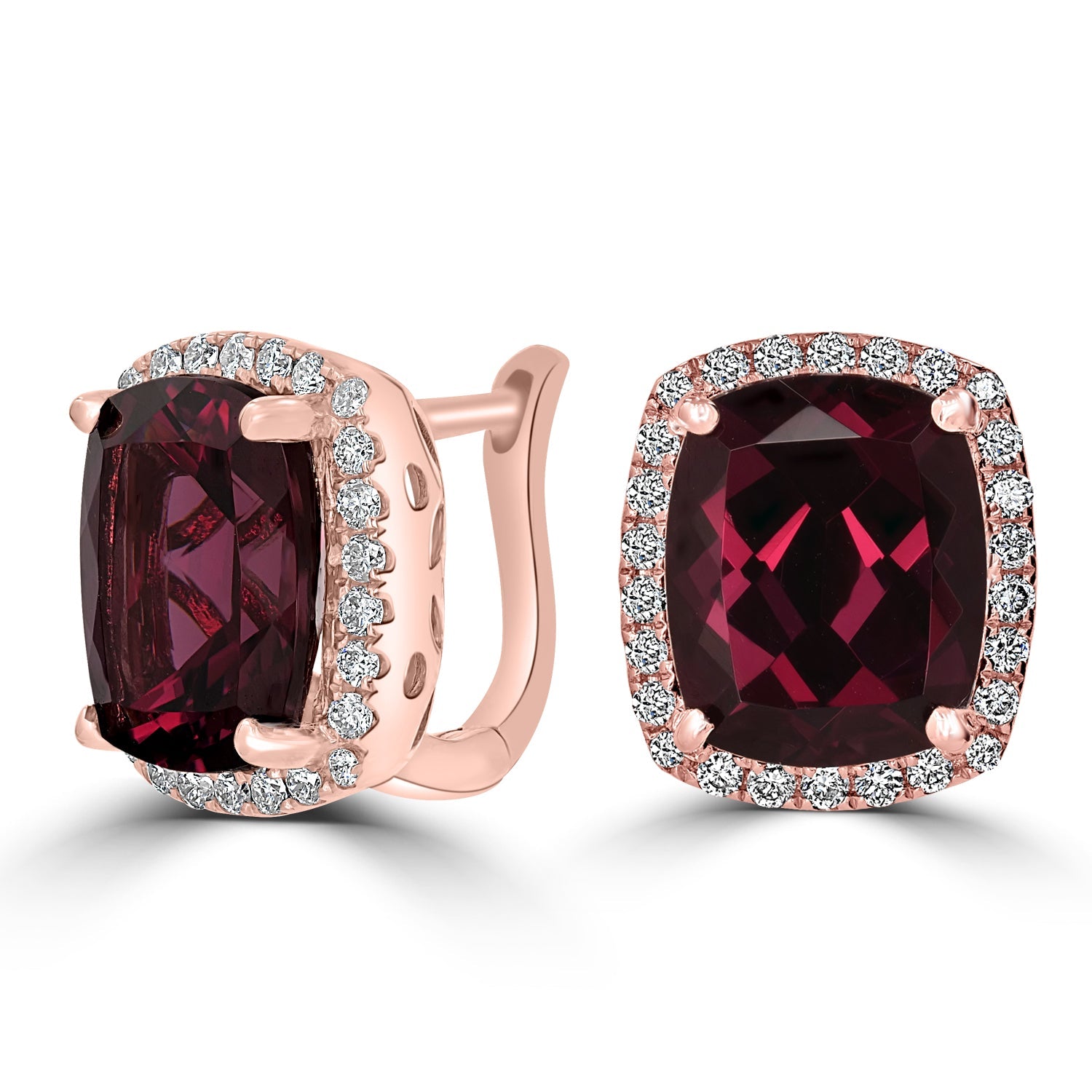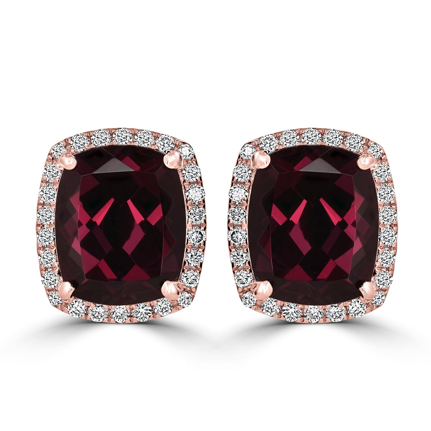 Fashioned from 14k rose gold, these dazzling earrings are perfect for every occasion. Set with a gorgeous cushion-cut Rhodolite Garnet and round Diamonds that are sure to stand out.