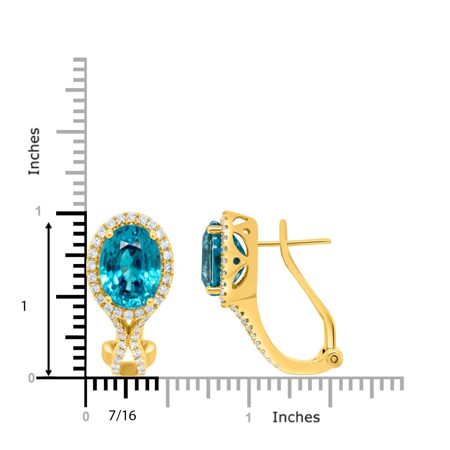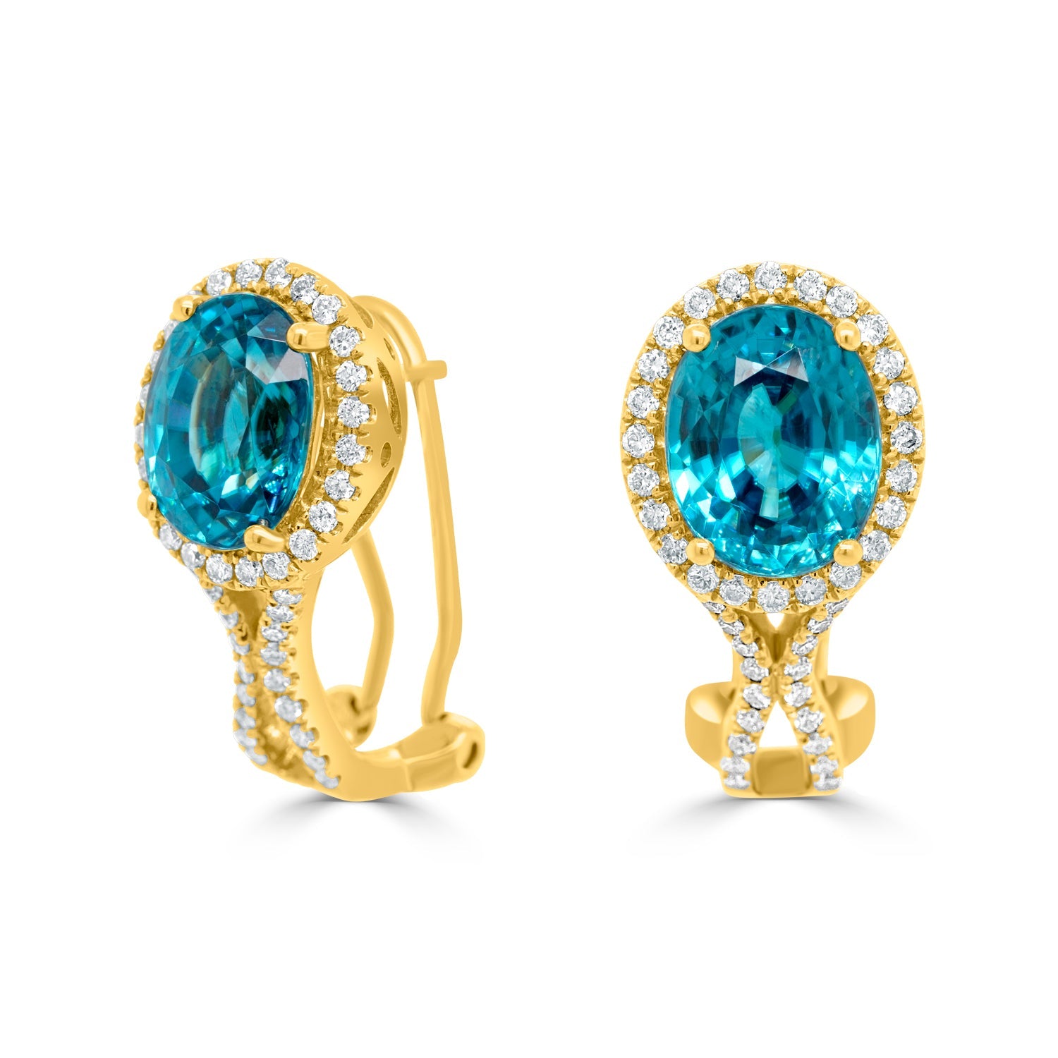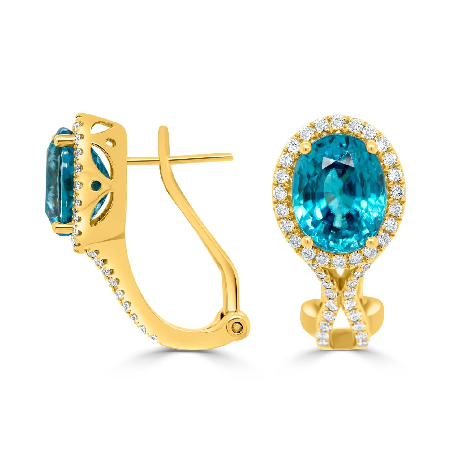 These earrings are set with an oval-cut blue Zircon that sparkle amidst round Diamonds. Crafted from 14K yellow gold, this piece is perfect for every occasion.