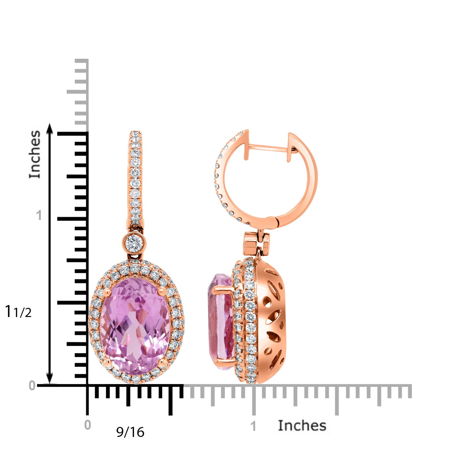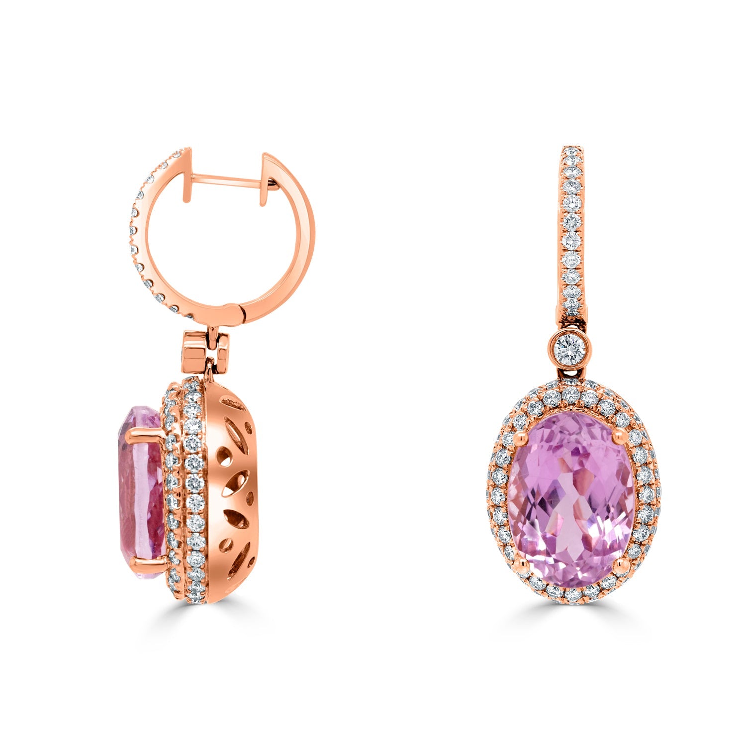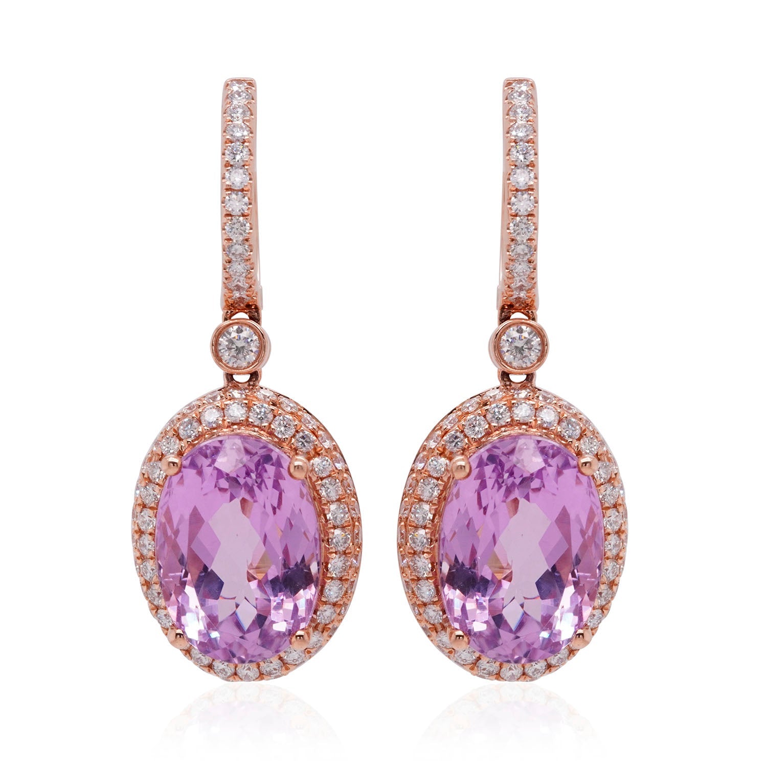 This gorgeous pair of earrings is a great way to add charm to your loveable persona. Flaunting an exceptional kunzite in an oval cut, they are bordered with round diamonds that sparkle with radiance. A captivating style that gives them an exotic look, they are designed in 14K rose gold for a refined finish. Endless charisma to reflect your grace, these stunning earrings are made for you!