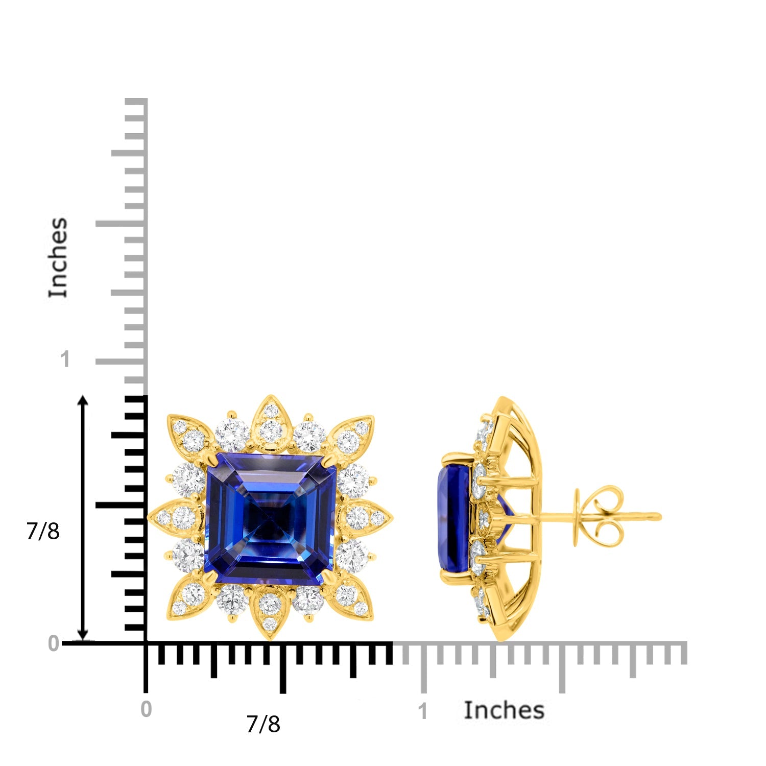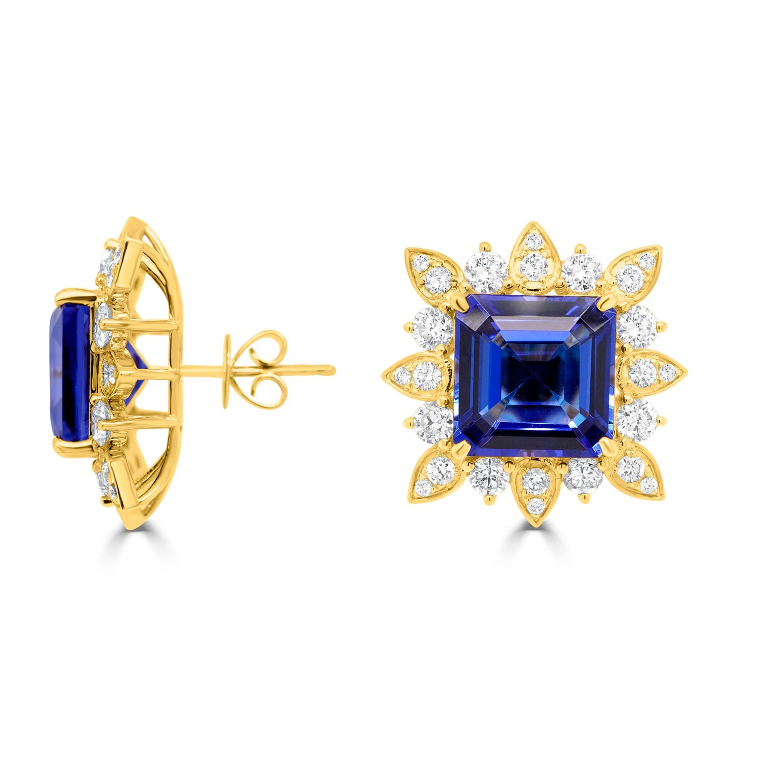 "Set with spectacular square-cut Tanzanite and and a beautiful round Diamond, these luxurious earrings are designed from 14K yellow gold."