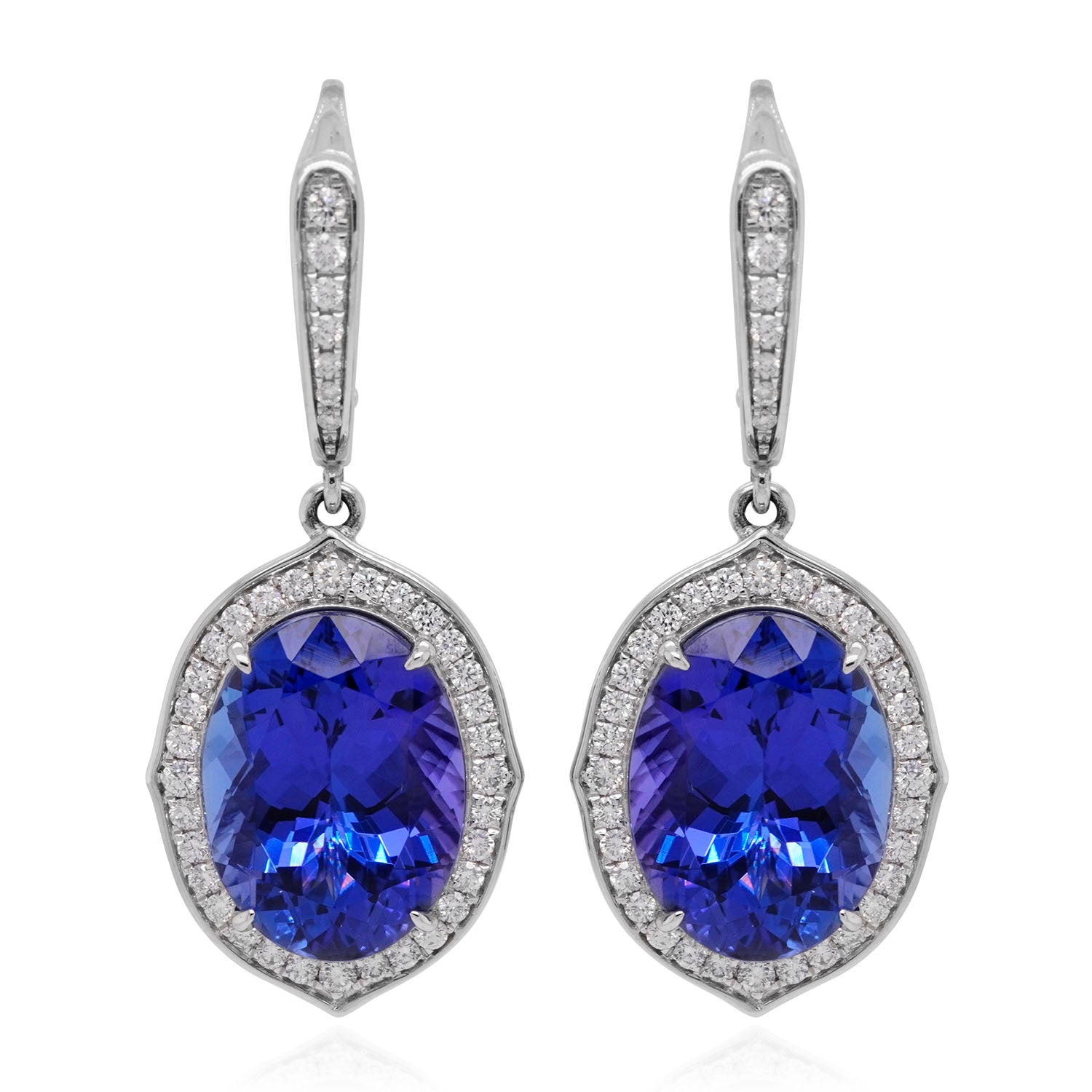 A perfect gift to enhance her beauty, these exceptional earrings are a true delight. Featuring a radiant tanzanite in an oval cut, each earring comes with glittering round diamonds that surround this splendid jewel, giving it a shimmer that brightens up the day. Crafted in 14K white gold.