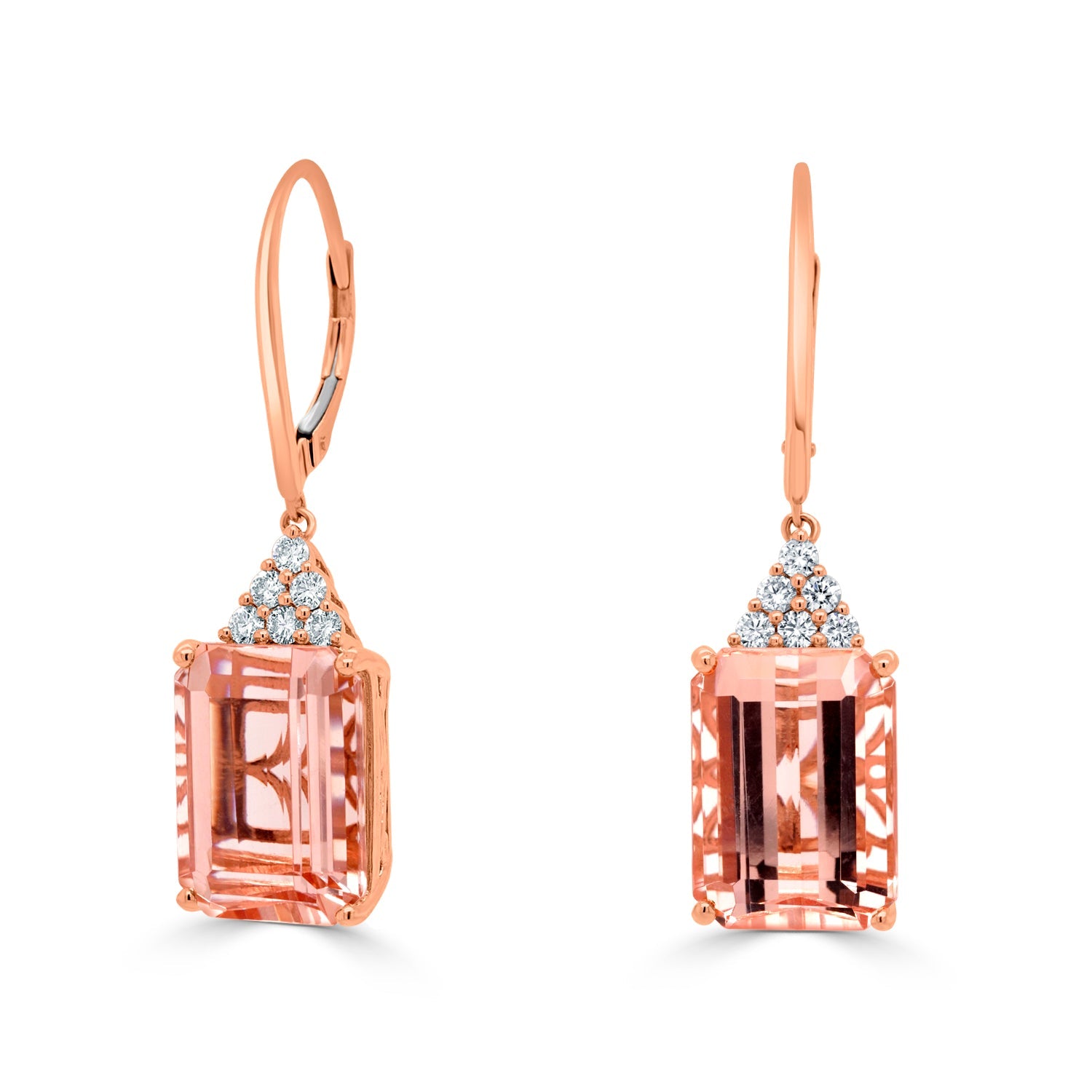 Designed with 14K rose gold, these enchanting earrings are set with a radiant emerald cut Morganite at the center. Bordered by glittering round cut Diamonds, this dazzling piece is the perfect pick for any occasion.