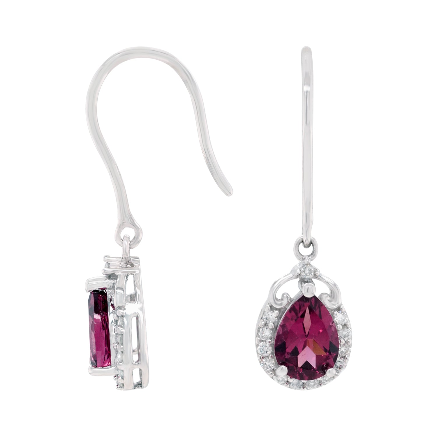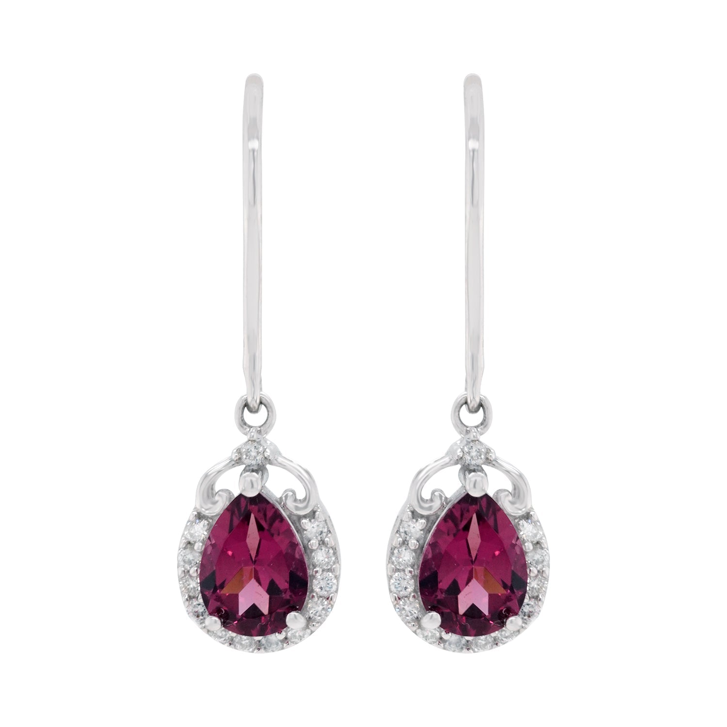 These earrings lends an excellent finishing touch to your outfit and is a great way to display luxury in your look. The pear cut Garnet and round Diamonds are a tribute to the ethereal charm. The 14k white gold is responsibly selected to give a nice base for setting gemstones.