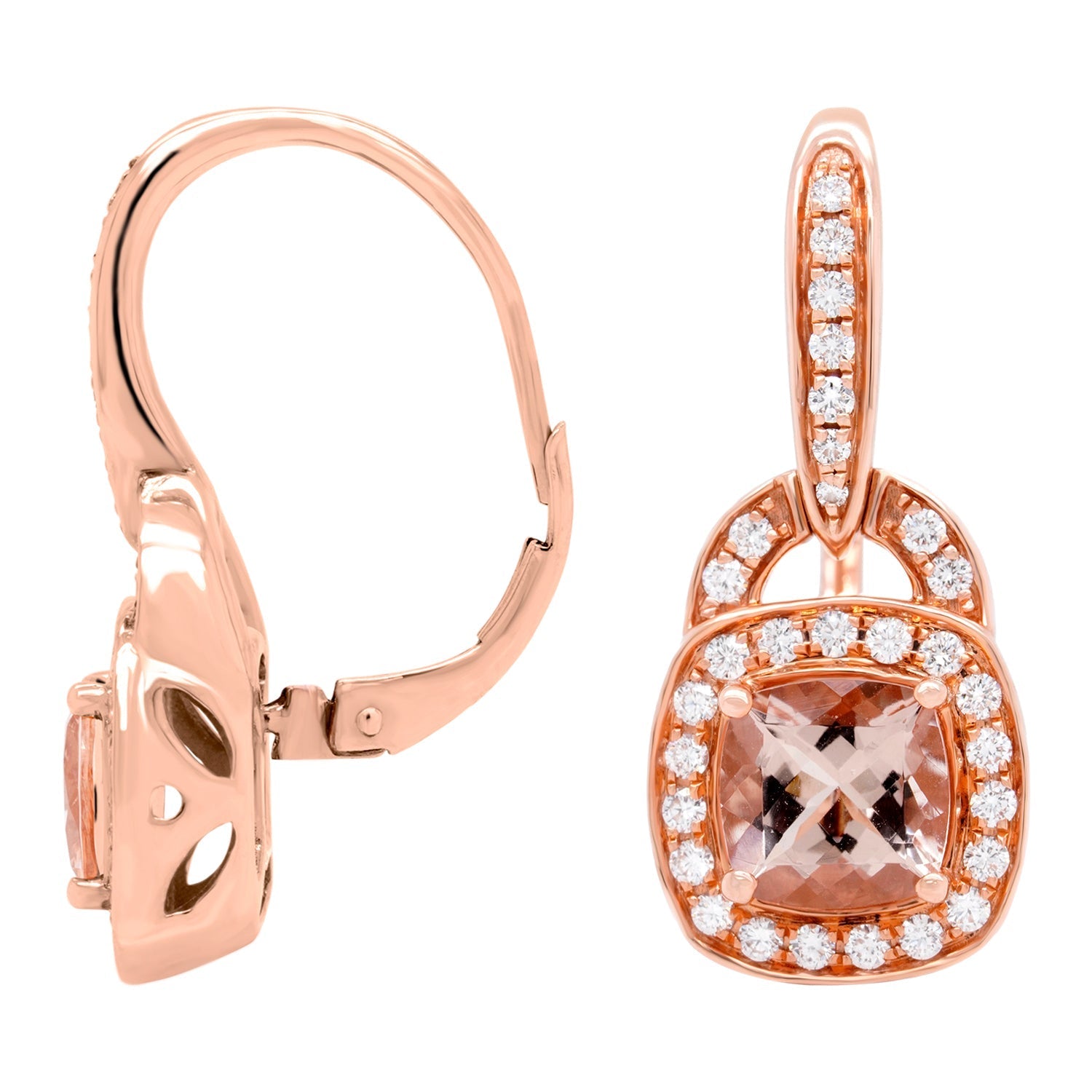 Designed With 14k Rose Gold, The Subtle Yet Elegant Finish Of These Earrings Nails The Perfect Look Each Time. Embellished With Cushion Cut Morganite That Reflects Your Innate Charm, They Are Surrounded With Round-cut Diamonds That Truly Mesmerize.