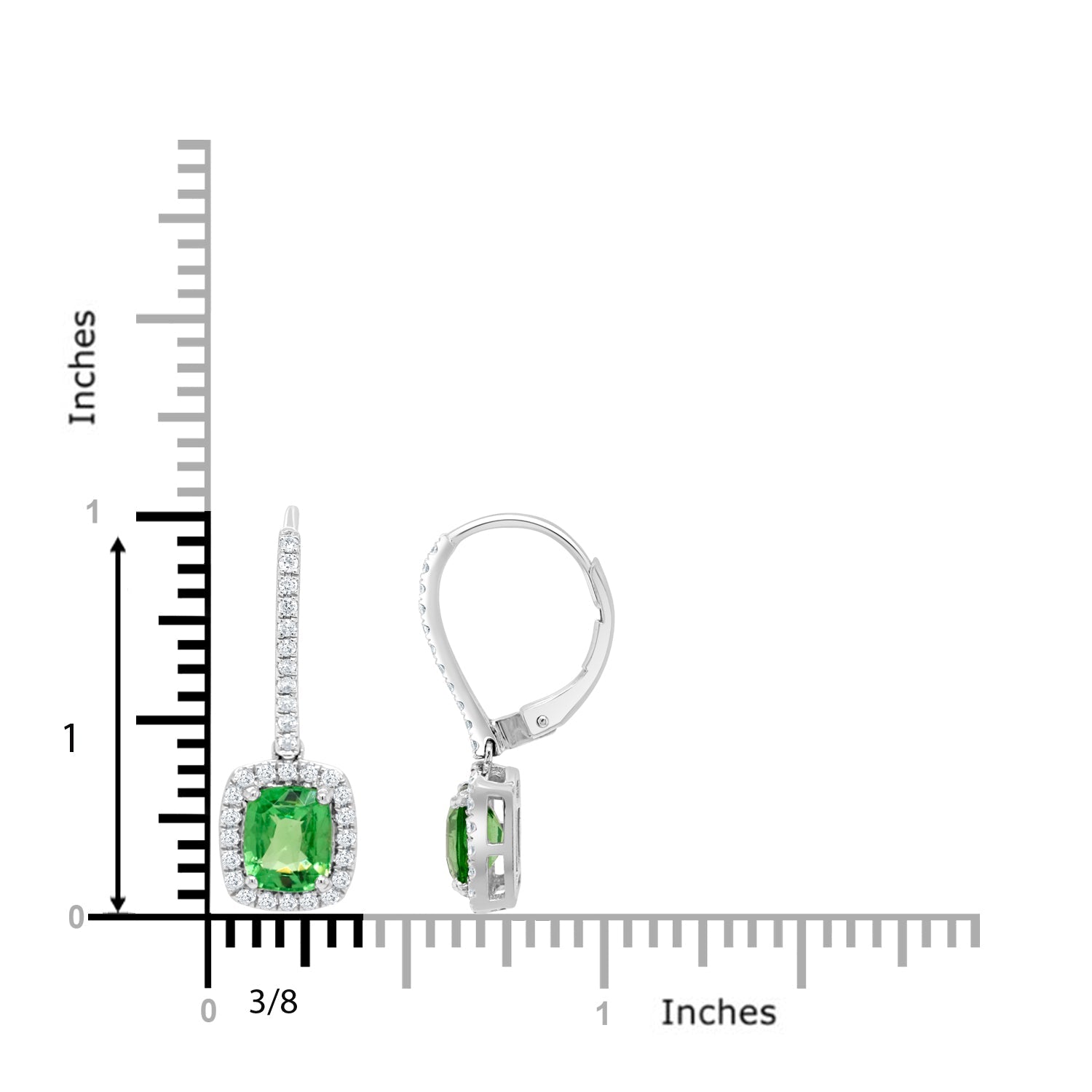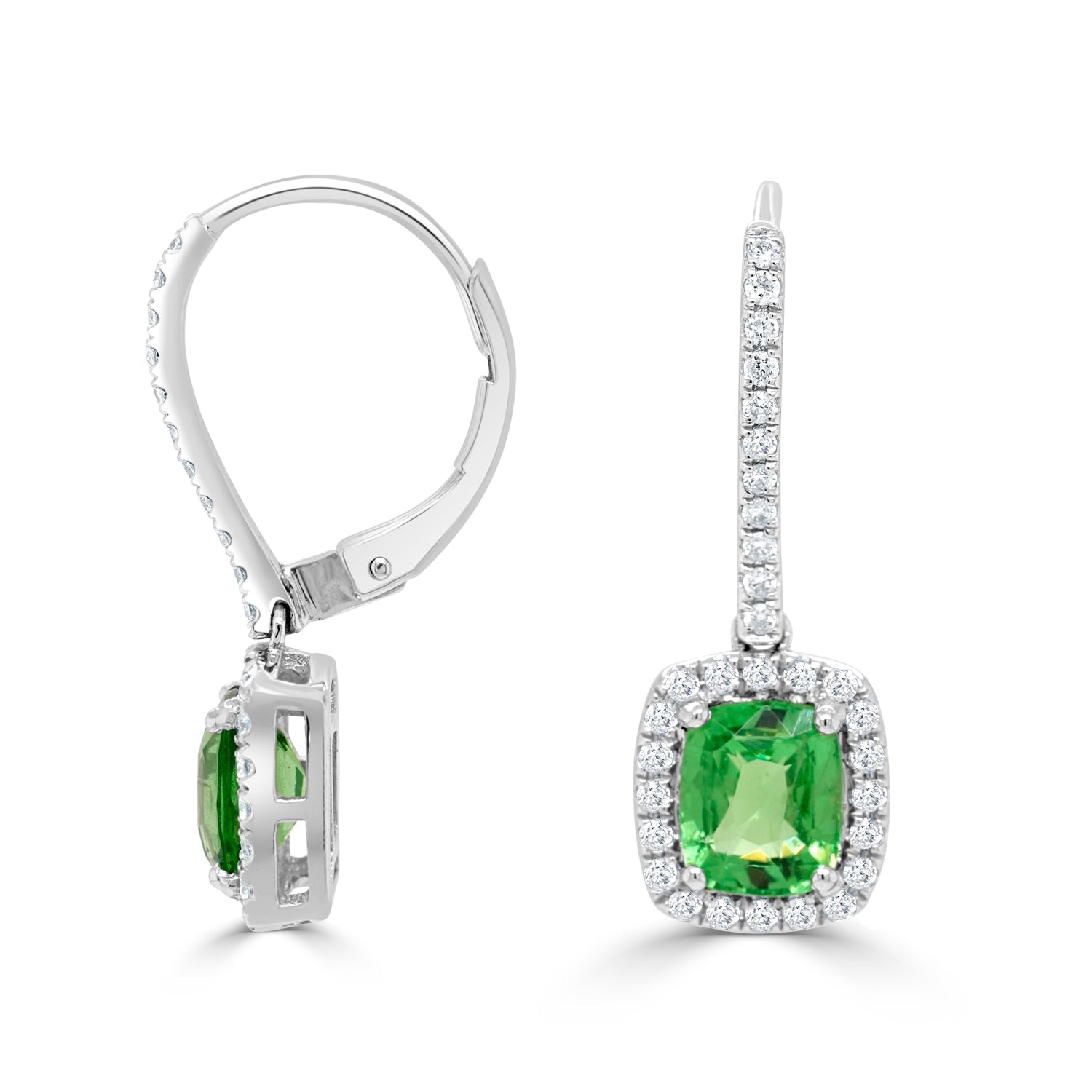 "Crafted with 14K white gold, these gorgeous earrings are set with a beautiful cushion-cut Tsavorite and glittering round Diamond to bring out their stunning beauty."