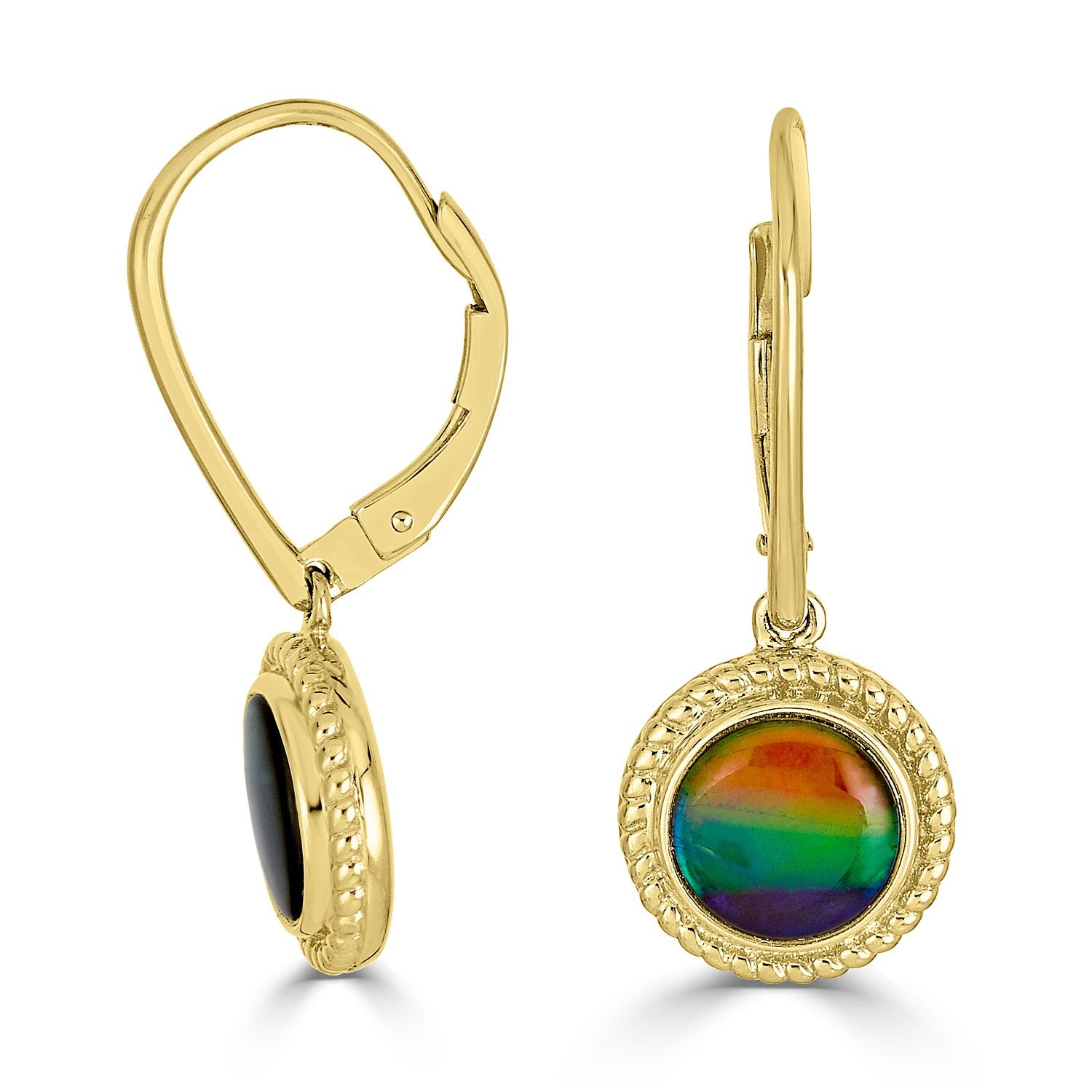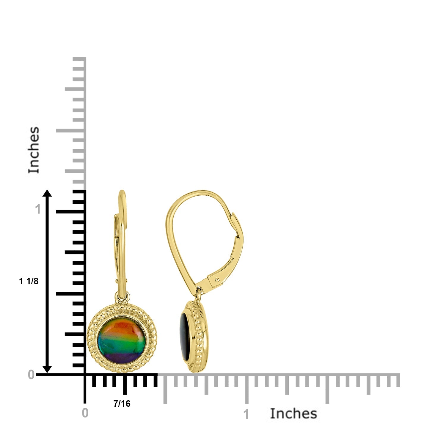 To add a luxury touch to your attire, these earrings are fashioned of 14k yellow gold. With the charm of round-cut Ammolite and Diamonds, this jewelry will complement all your ensembles effortlessly. A perfect fit for royalty!