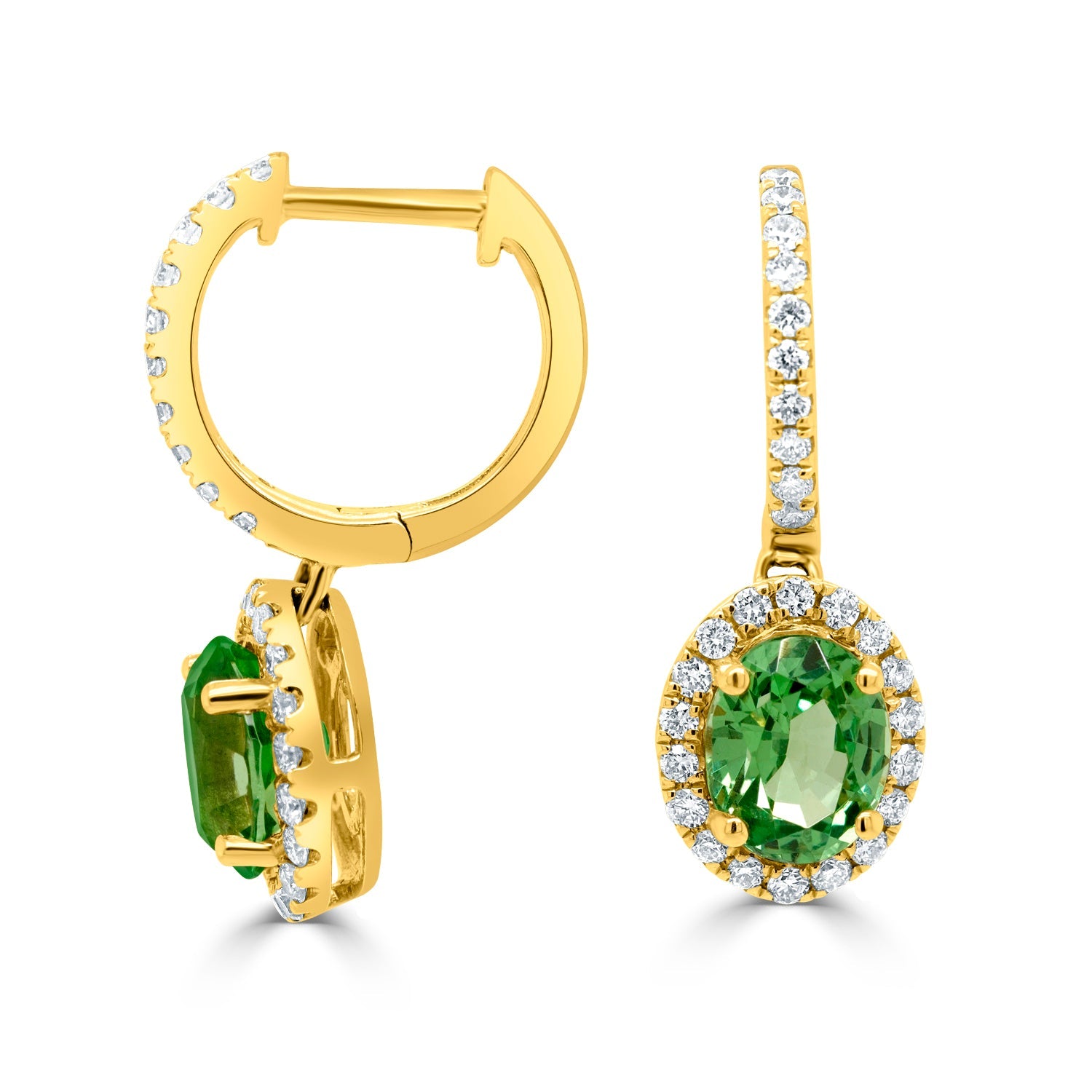 This pair of earrings is set with an oval-cut Tsavorite and round Diamond. Crafted from 14K yellow gold, these earrings are absolutely lovely.