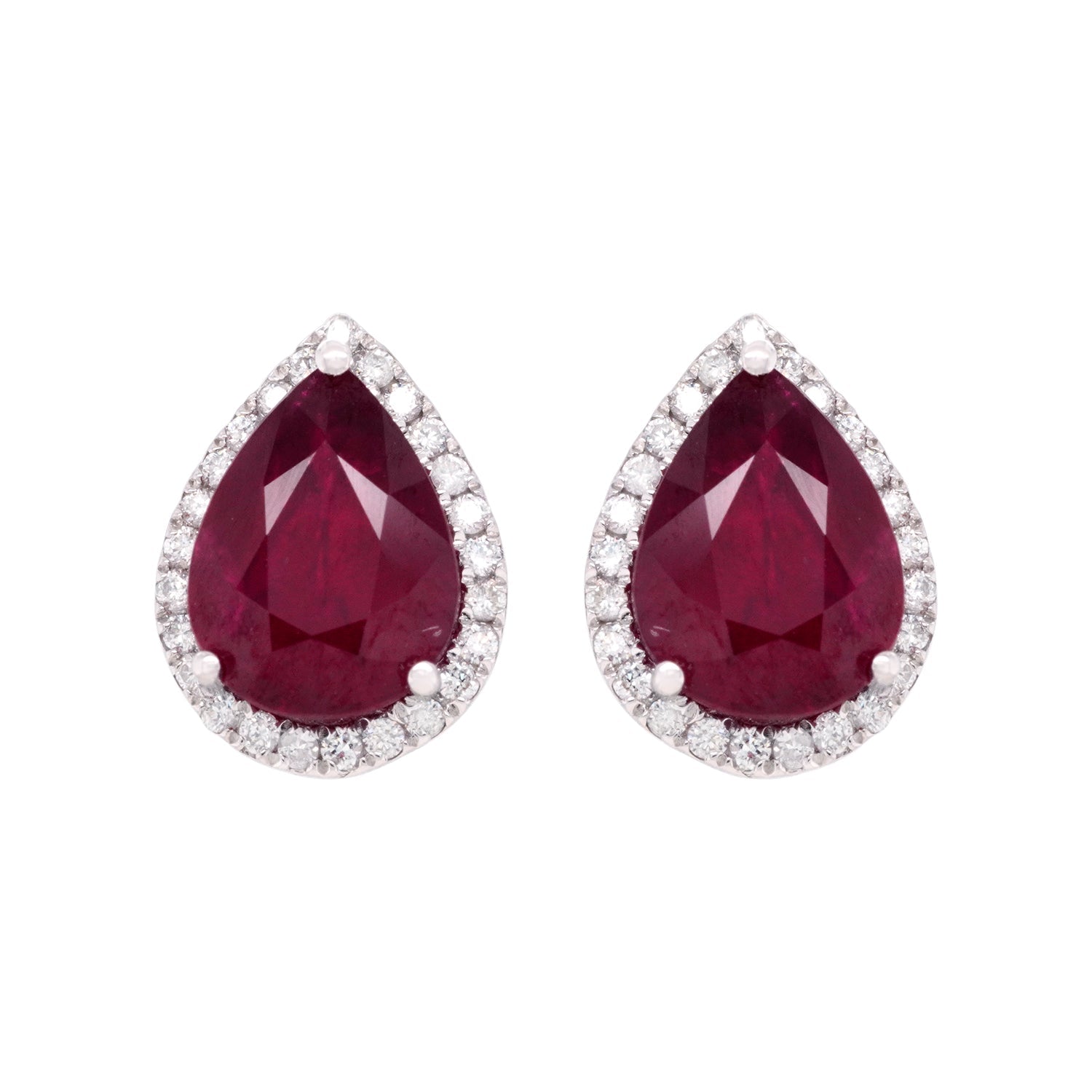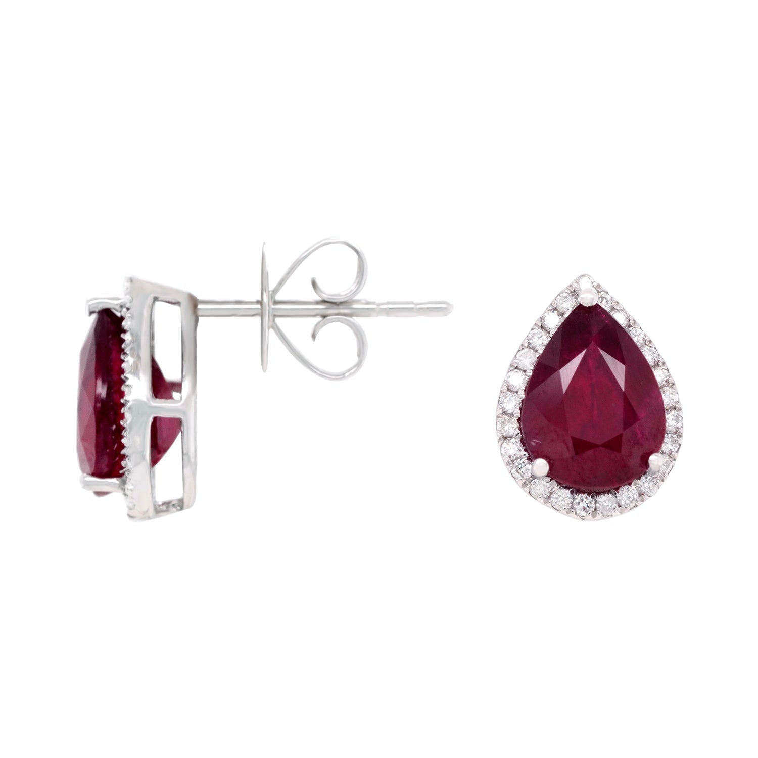 14k white gold and pear cut Ruby come together in perfect unison to form these luxury earrings. Accented by round cut diamonds. Whether you are going for a social gathering, party or a casual day out, this pair of earrings is perfect to revamp your attire.