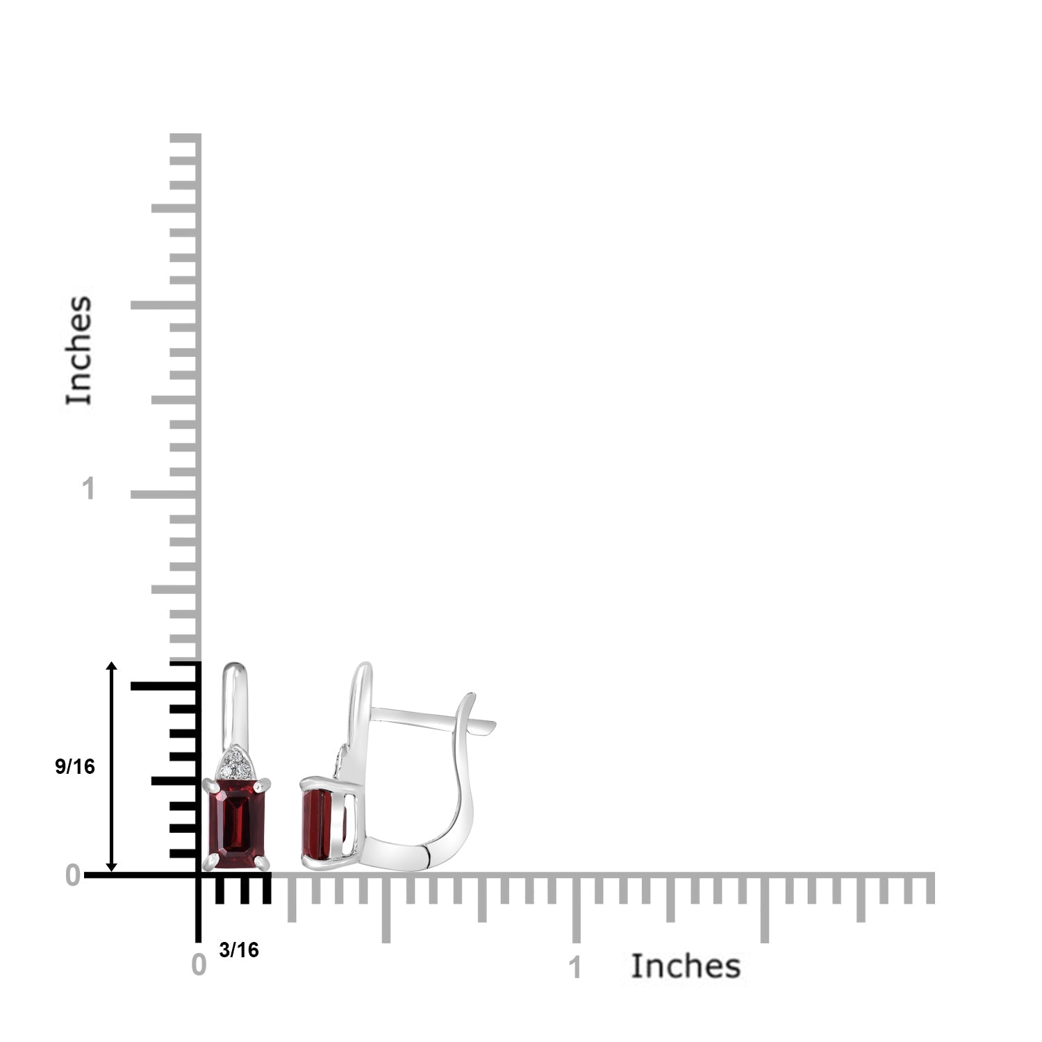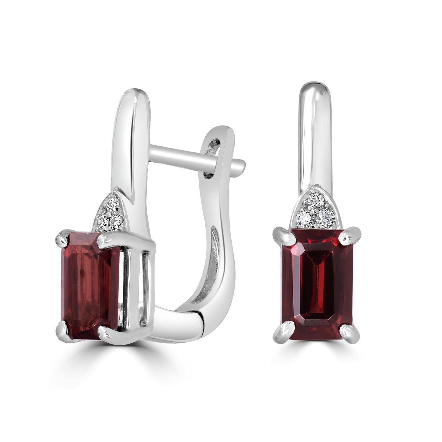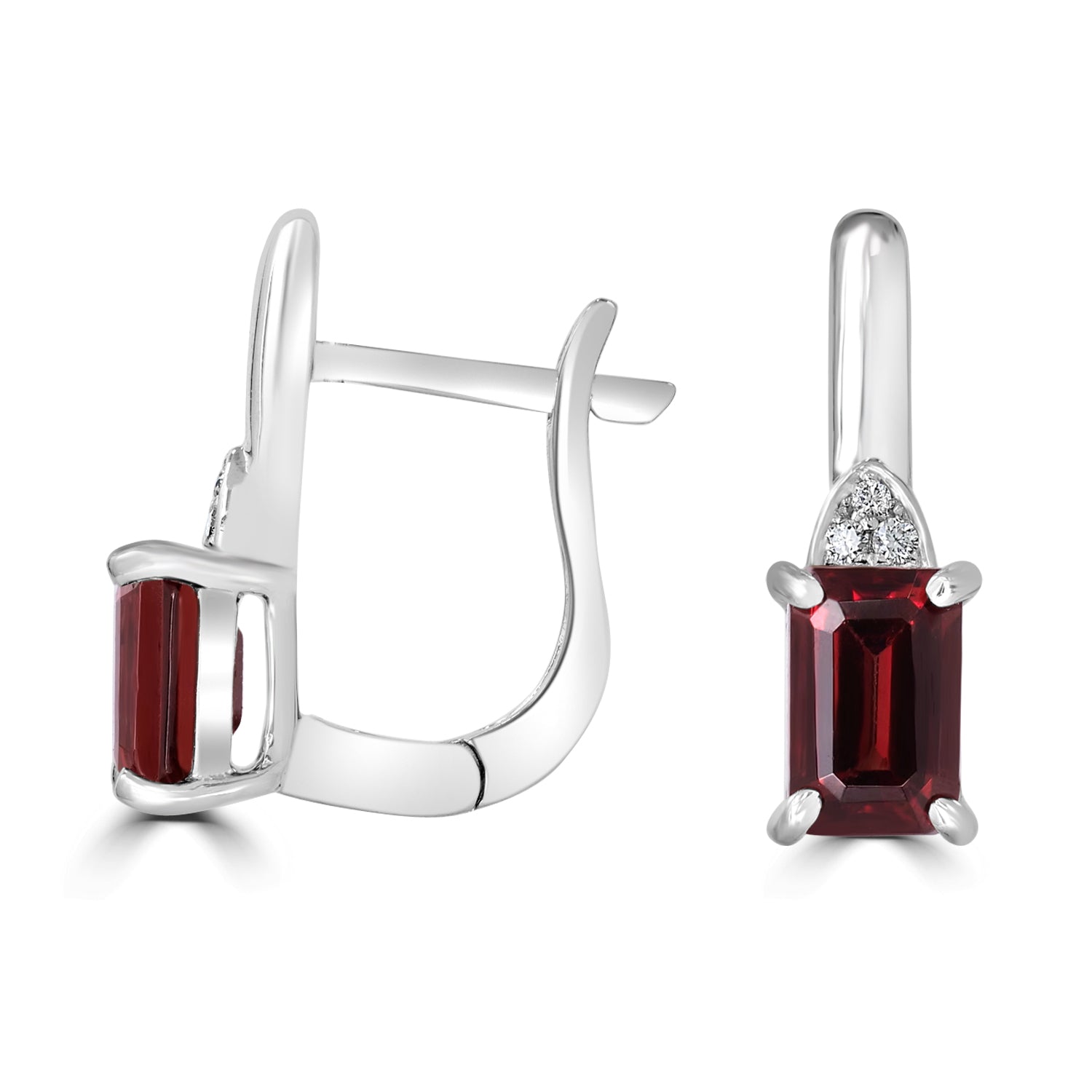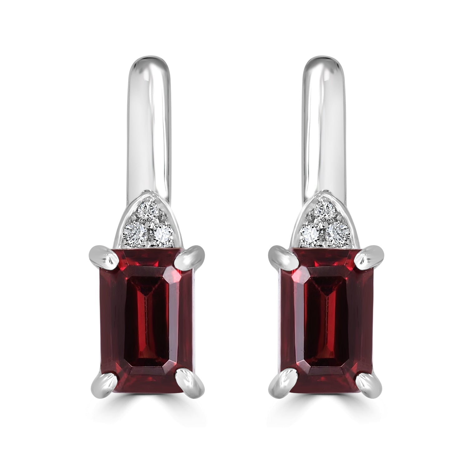 These 14K white gold earrings are set with an emerald-cut cut Garnet and bordered by splendid round Diamonds that will dazzle everyone!