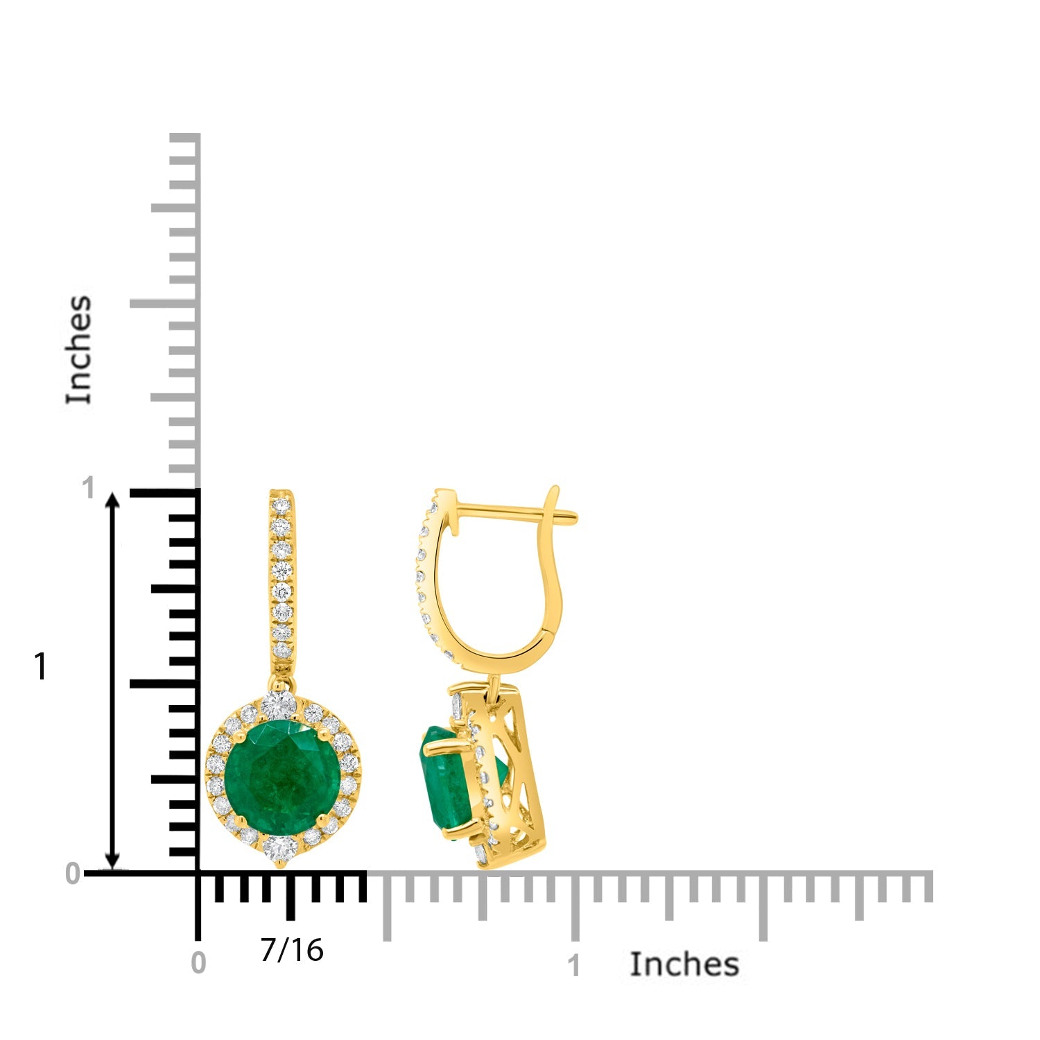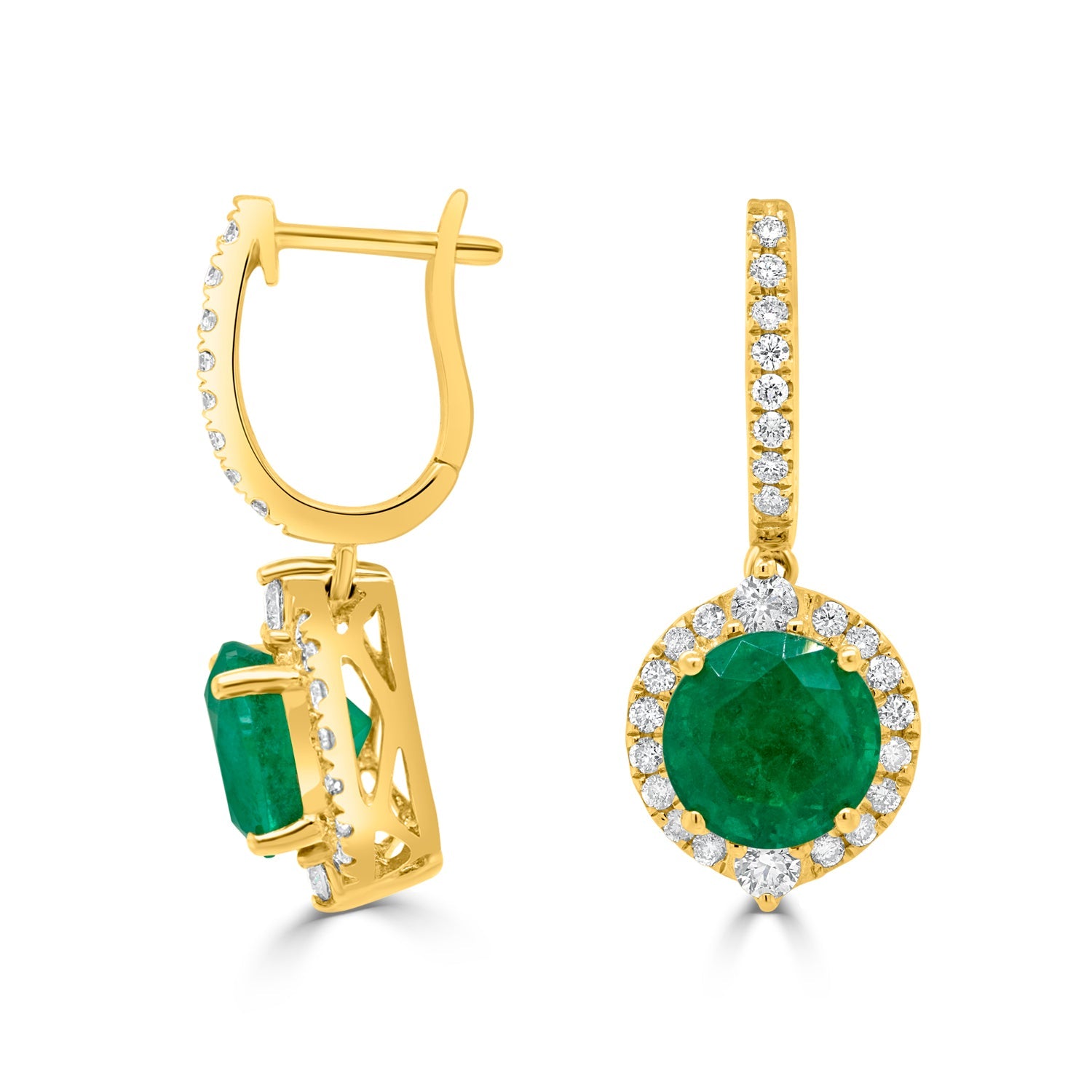 These beautiful earrings are crafted from 14K yellow gold and set with a striking round cut Emerald, bordered by mesmerizing round cut Diamonds that are sure to get you noticed.