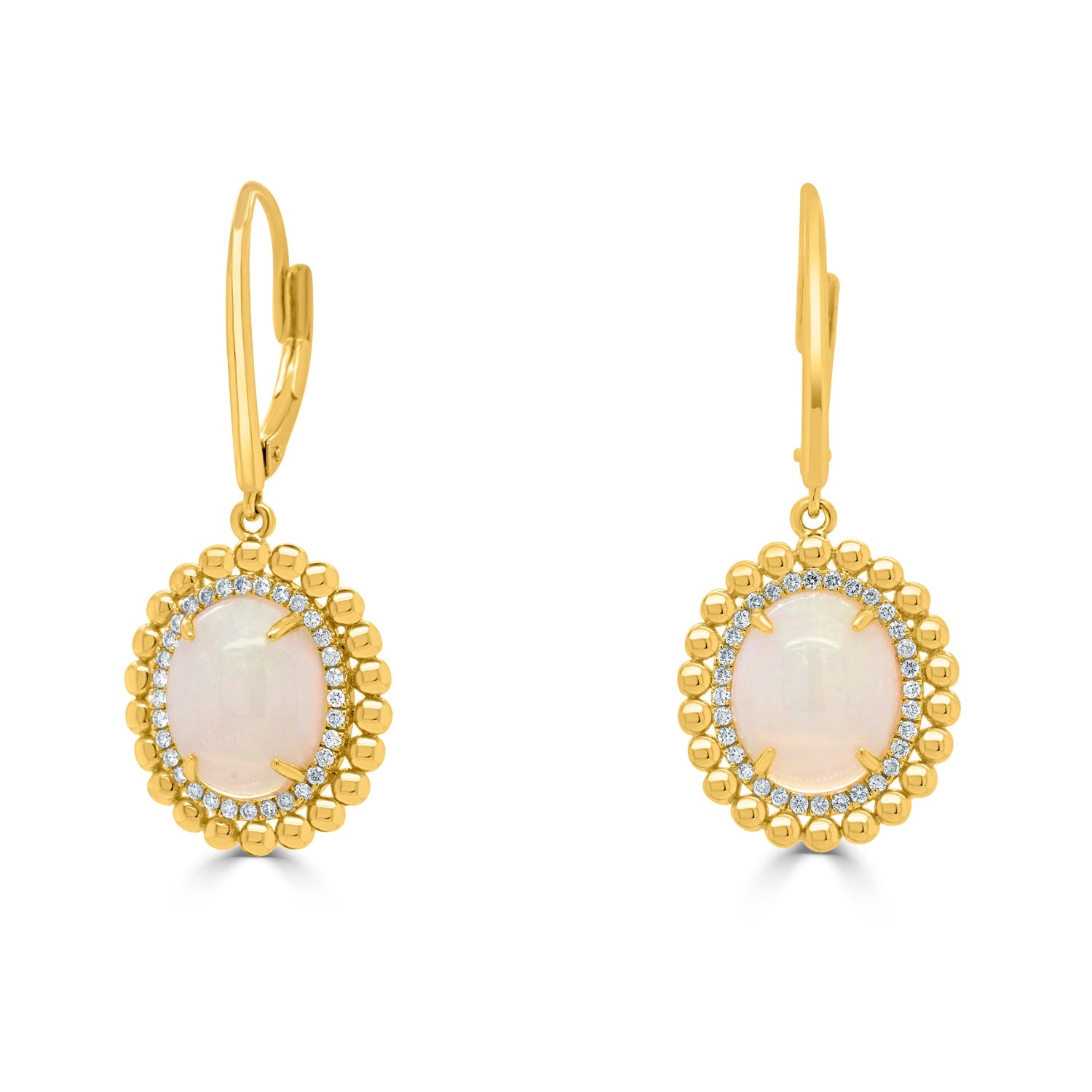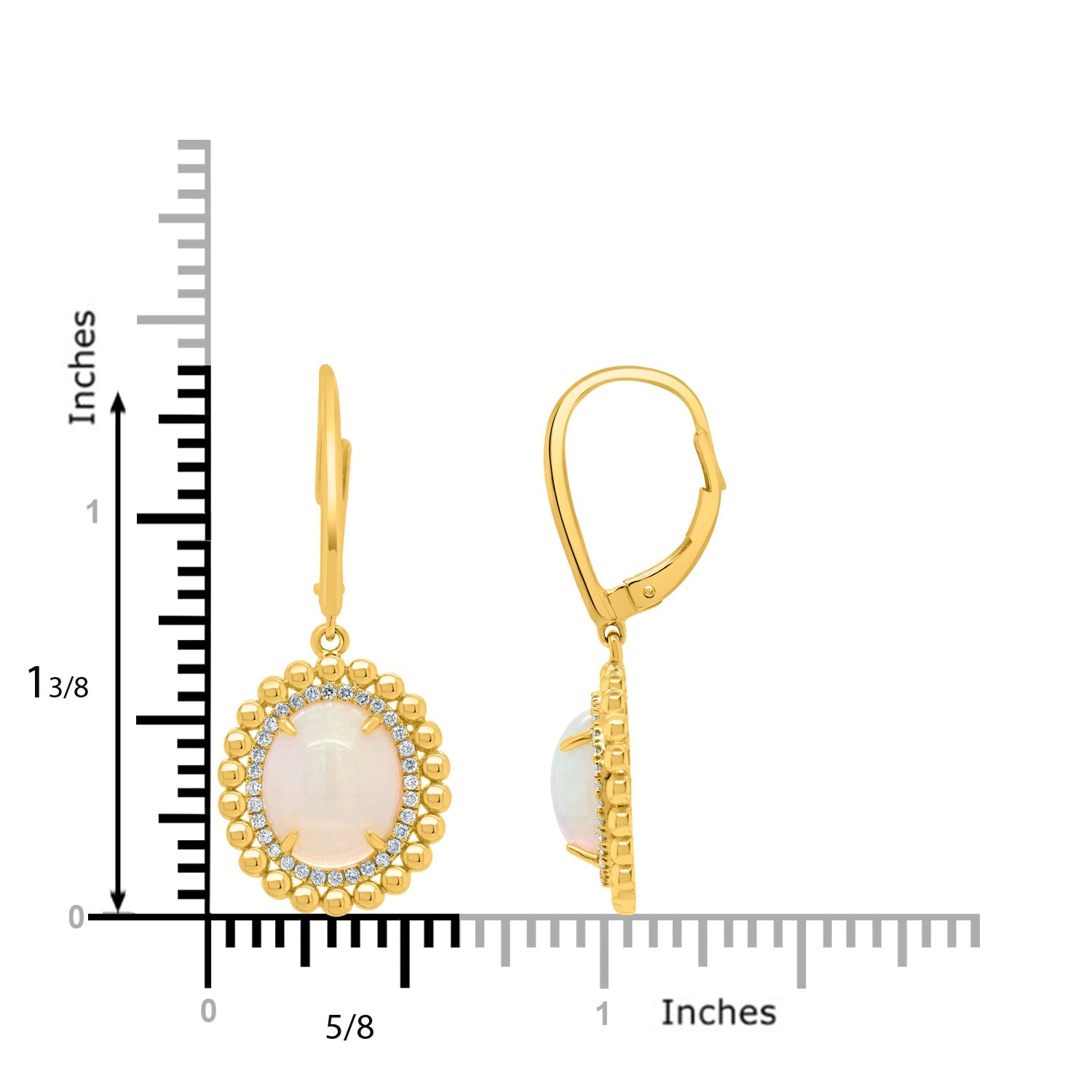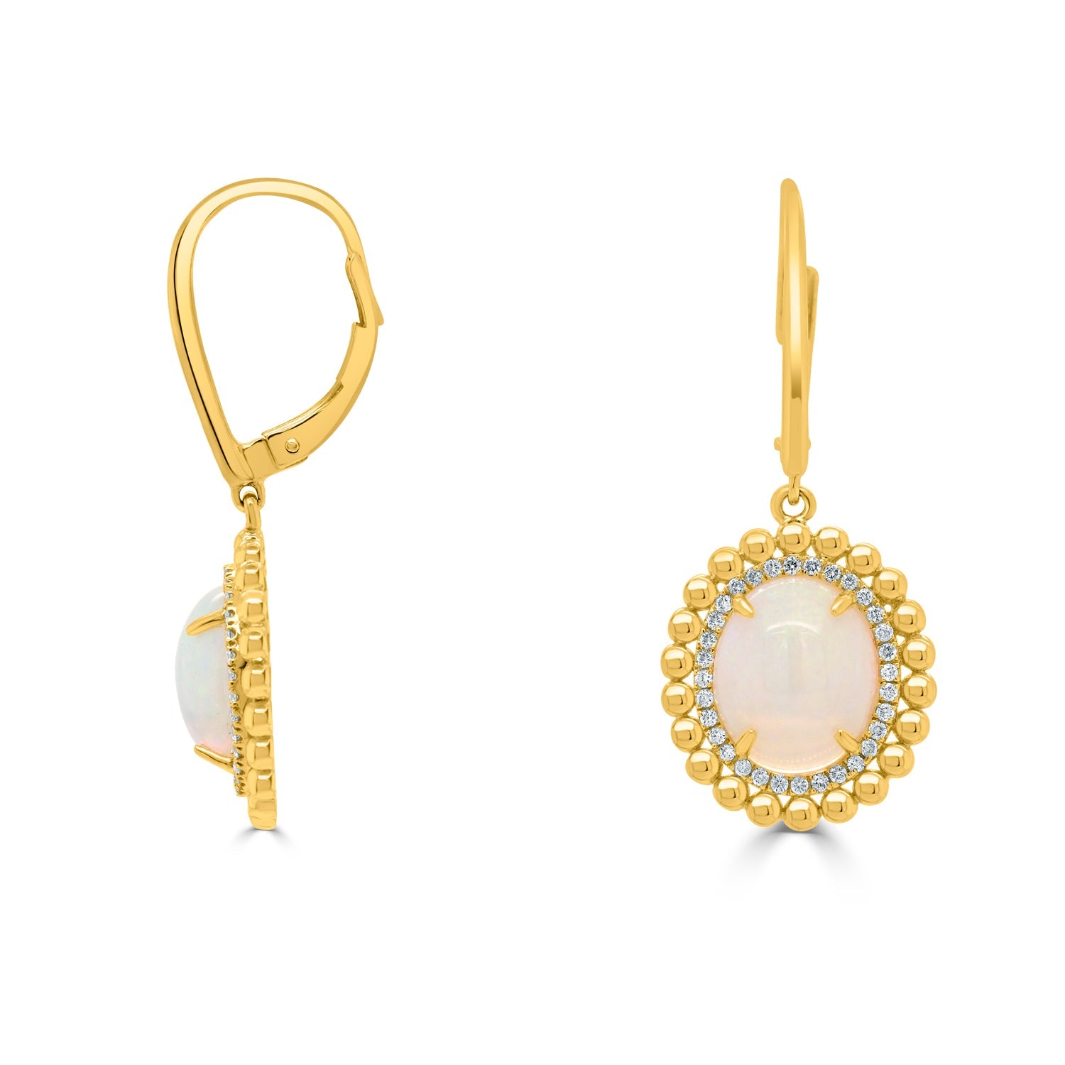 This pair of earrings are set with an oval-cut Opal and round Diamonds. Designed with 14K yellow gold, the workmanship stands out.