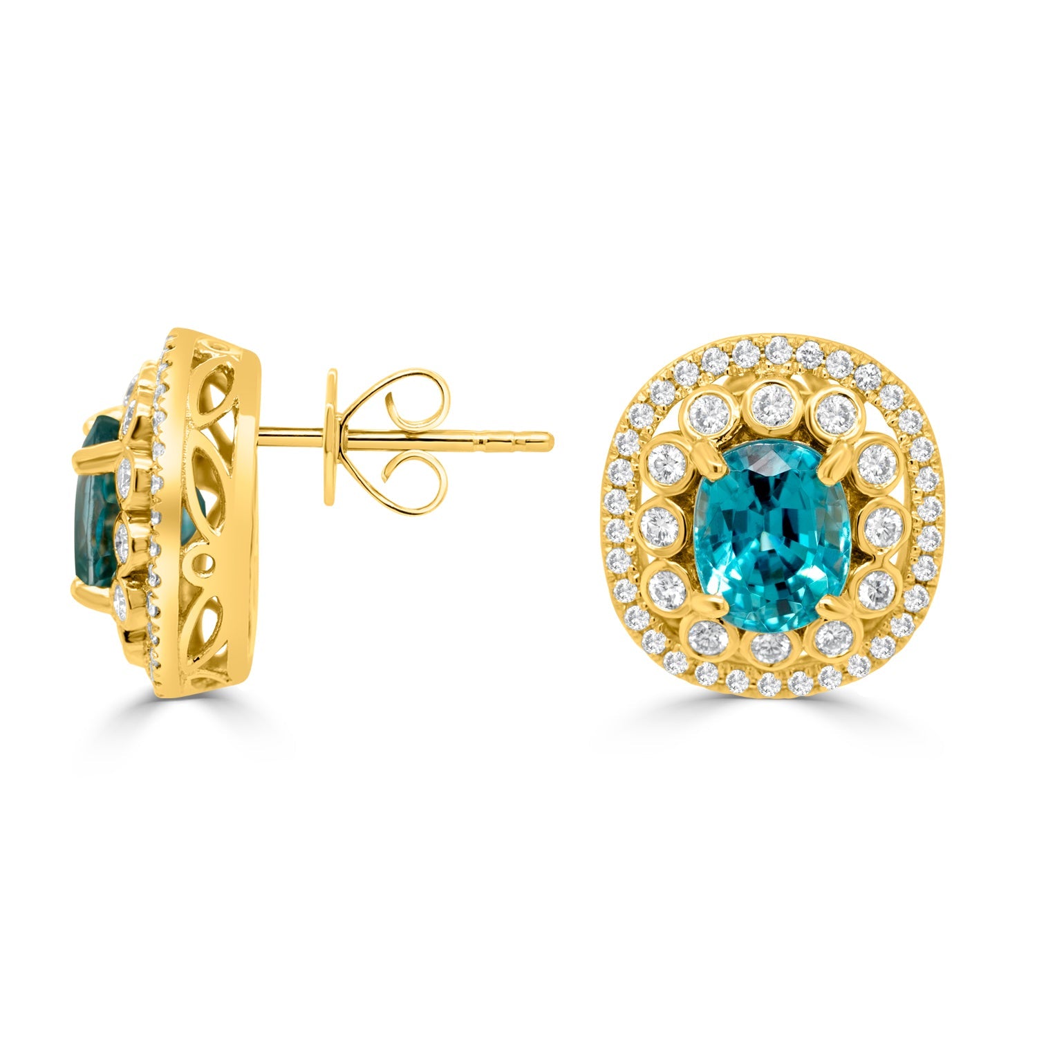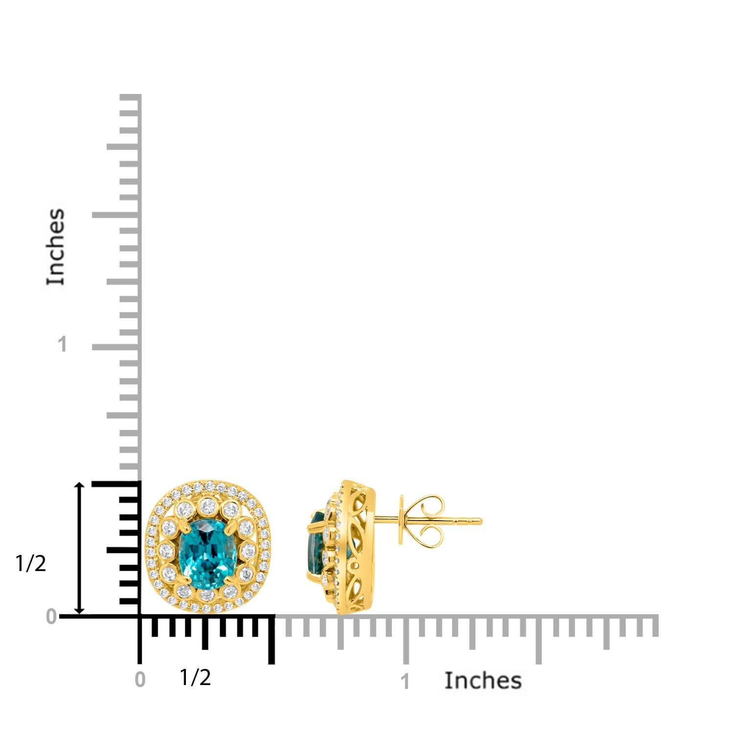 Set with a brilliant oval cut Blue Zircon, these captivating earrings sparkle with round cut Diamonds. Crafted from 14K yellow gold, they are the perfect pick for any occasion.