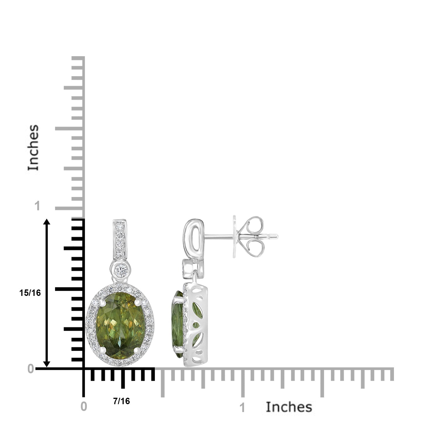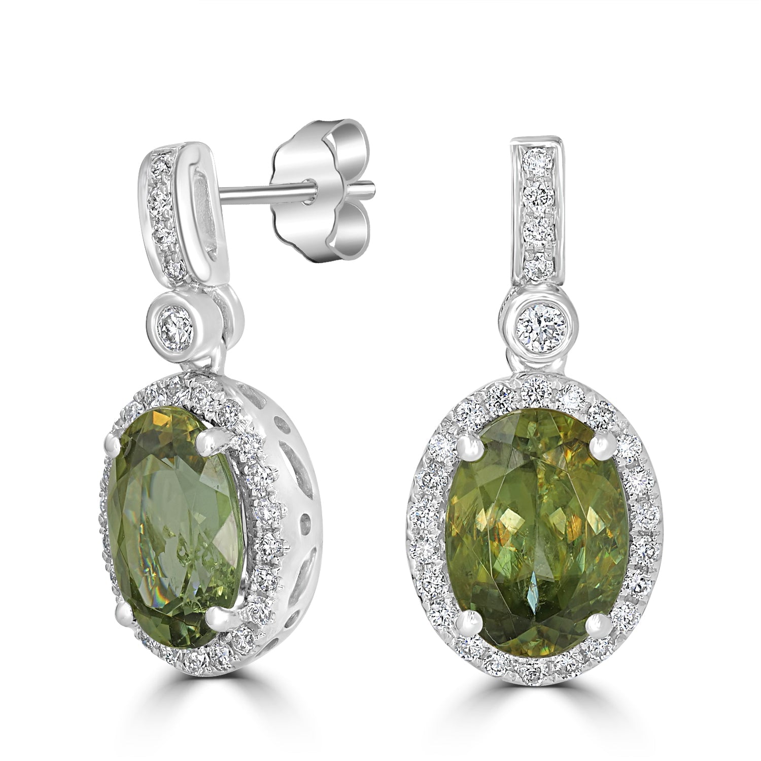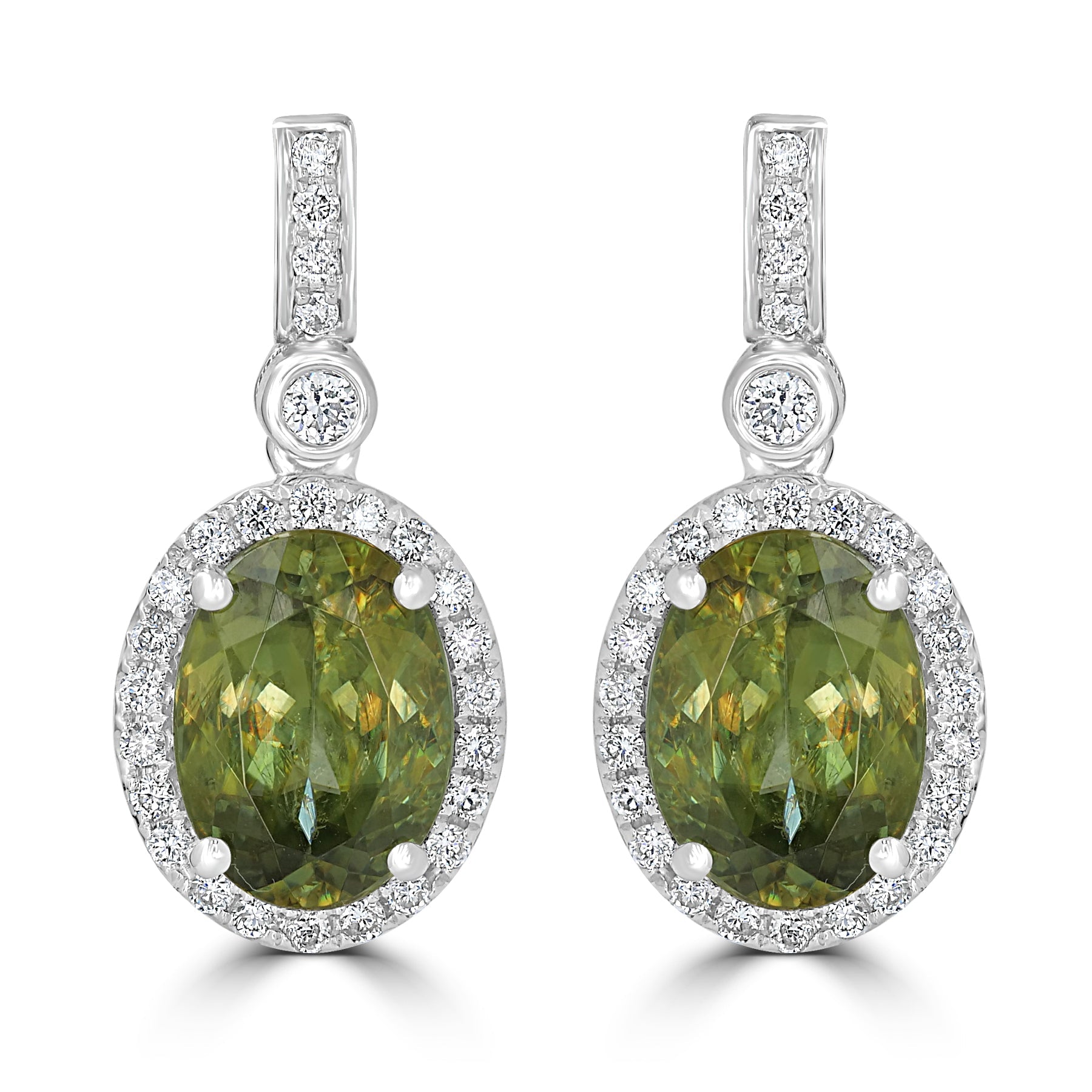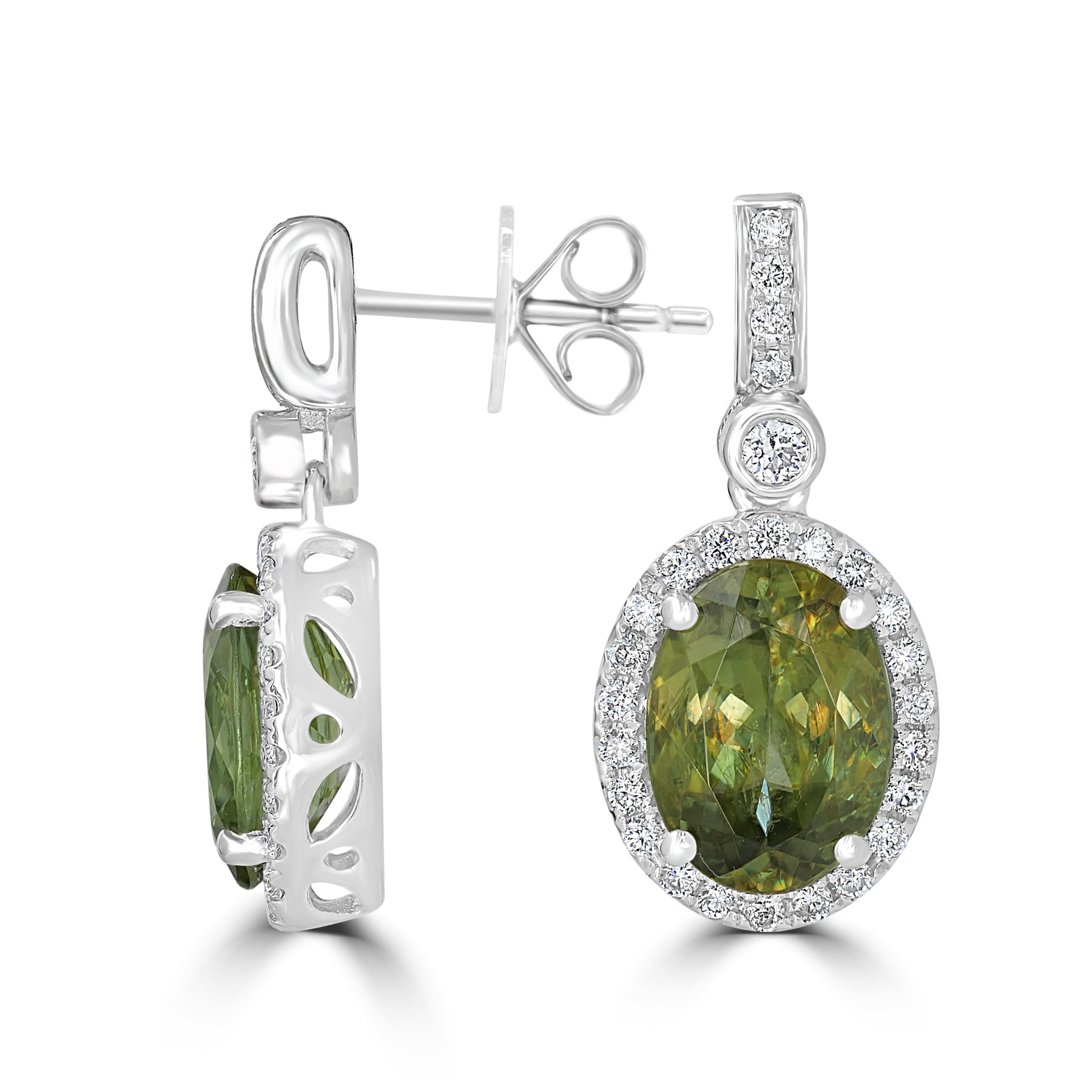 This beautiful pair of earrings is crafted with 14K white gold and set with an oval-cut Sphene and round Diamonds. A truly high-class design that will add some sparkle to your look!