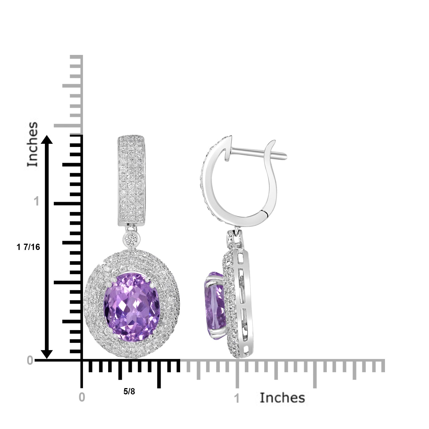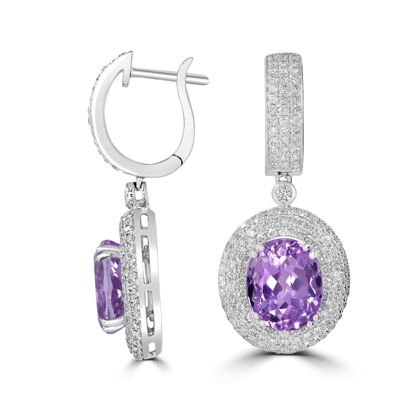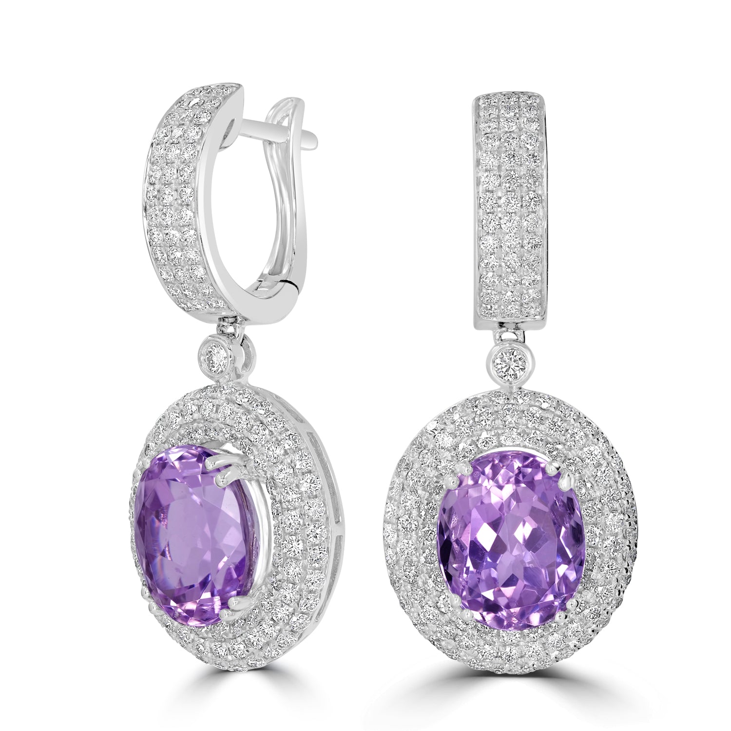 These stunning earrings are crafted with 14k white gold and set with an oval-cut Kunzite and round Diamonds.