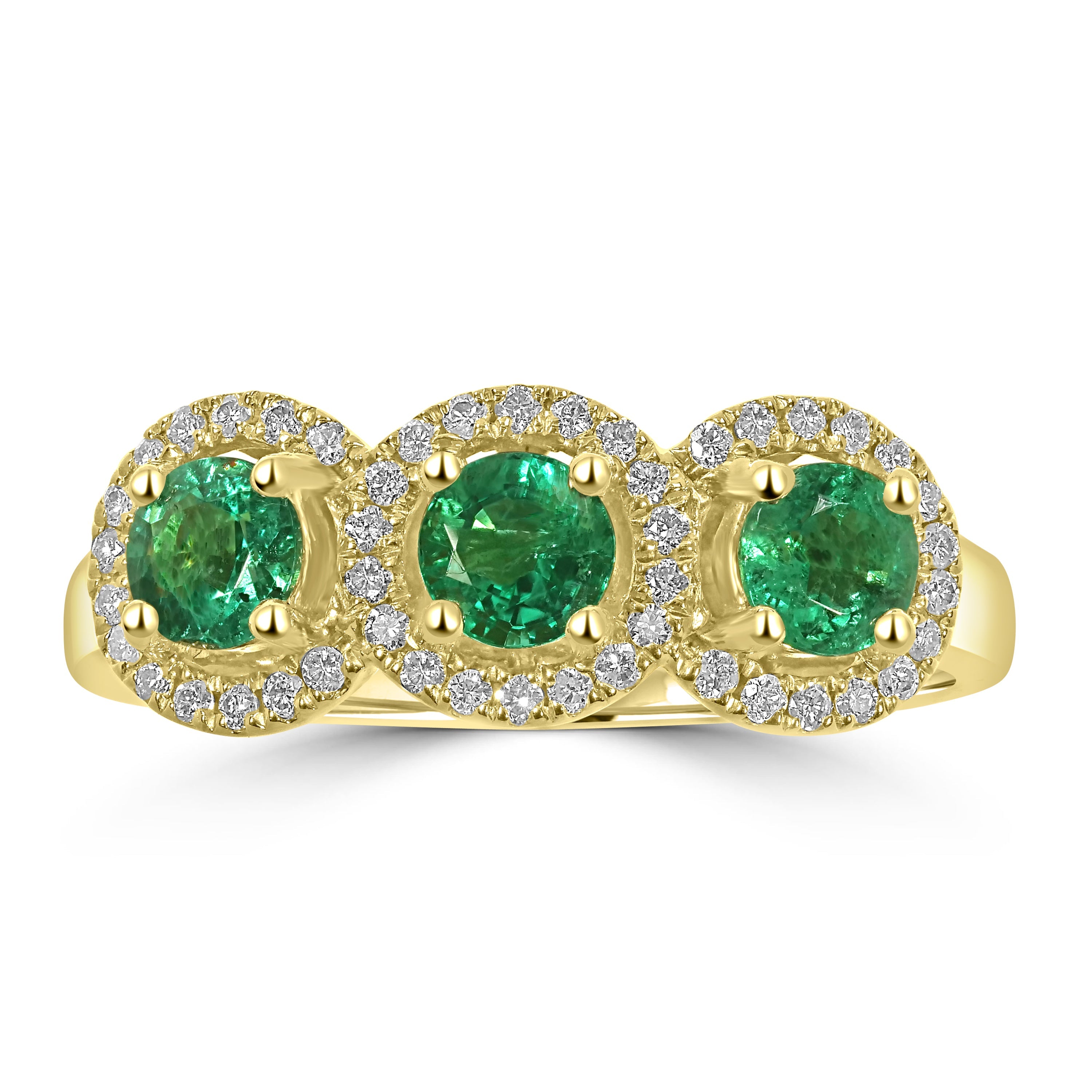 With timeless workmanship and enchanting radiance, this beautiful ring is in line with the latest trend. Fashioned with 14k yellow gold, this ring comes with stunning round-cut Emerald and sparkling round Diamonds which will enhance your style as well as gives an appealing look.