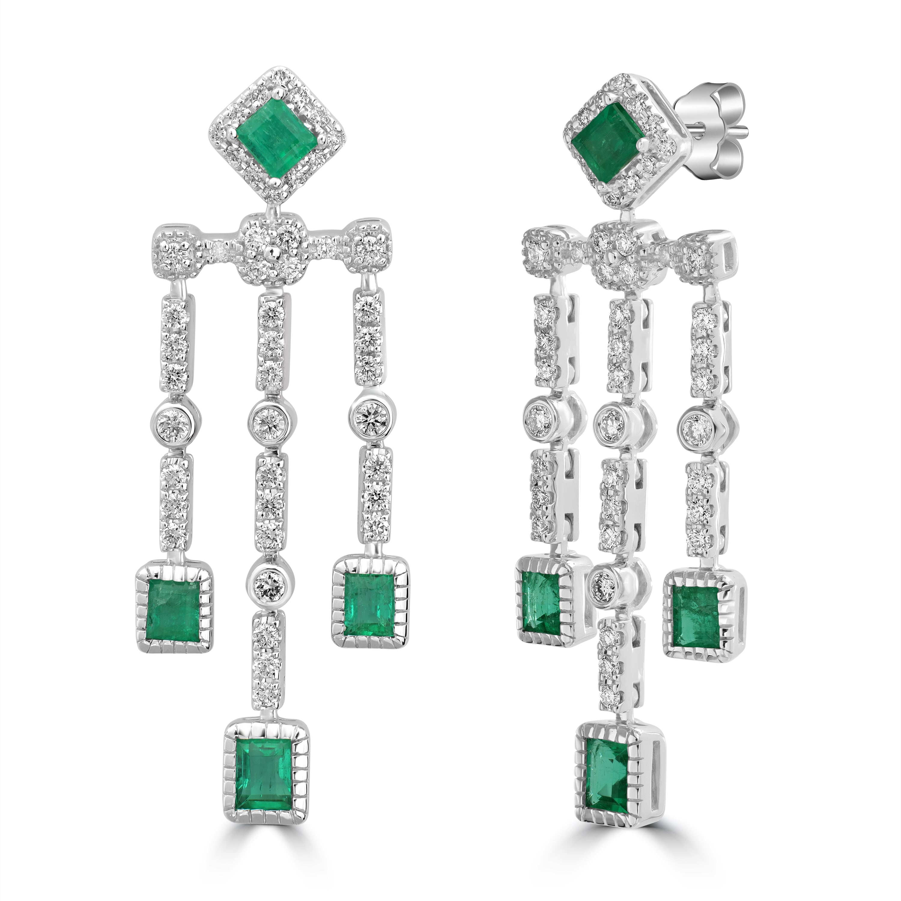 Presenting these 18K white gold earrings that exude natural beauty and brilliance. Adorned with exquisite baguette-cut Emeralds and round Diamonds, their high-class design is eye-catching. Elevate your style with these unique earrings.