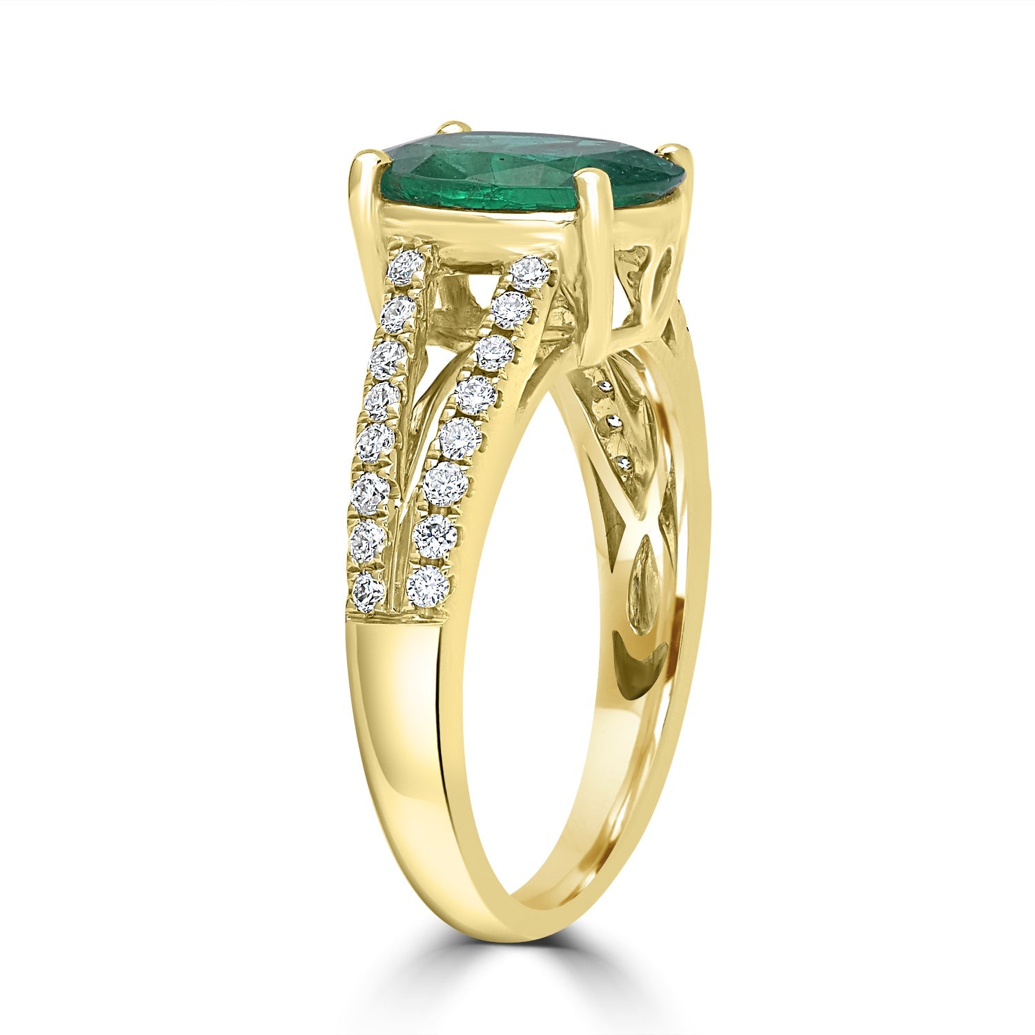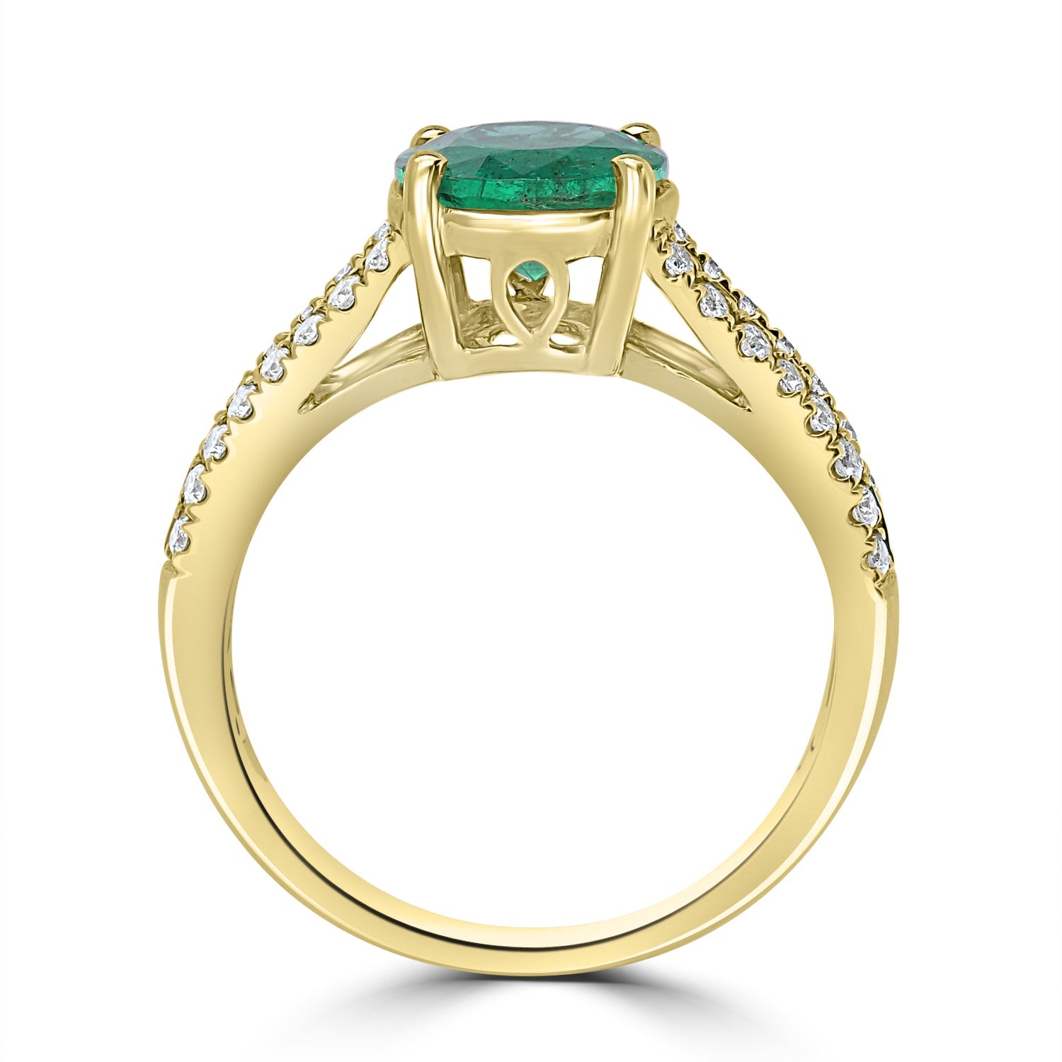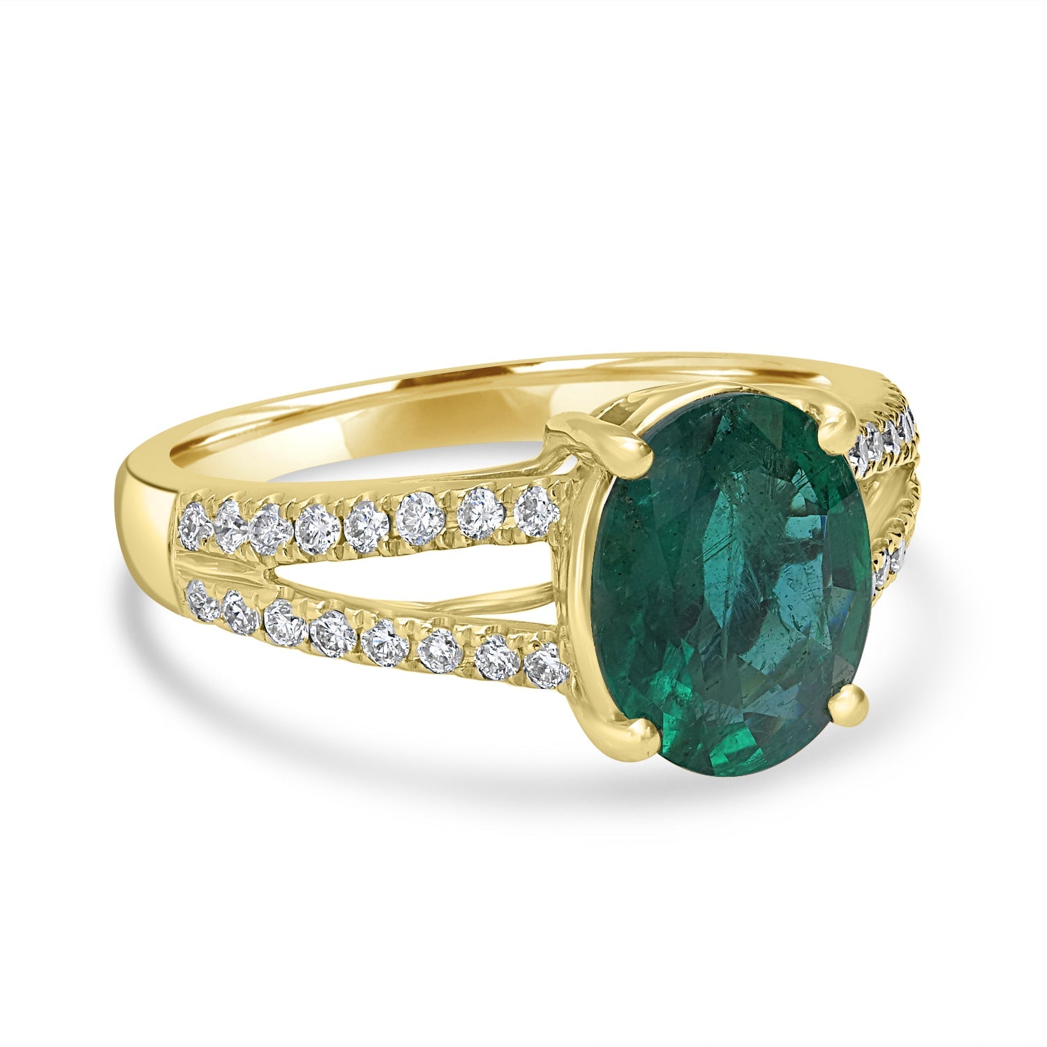 This exquisite 14K yellow gold ring is set with an oval-cut Emerald and round Diamonds that stand out.