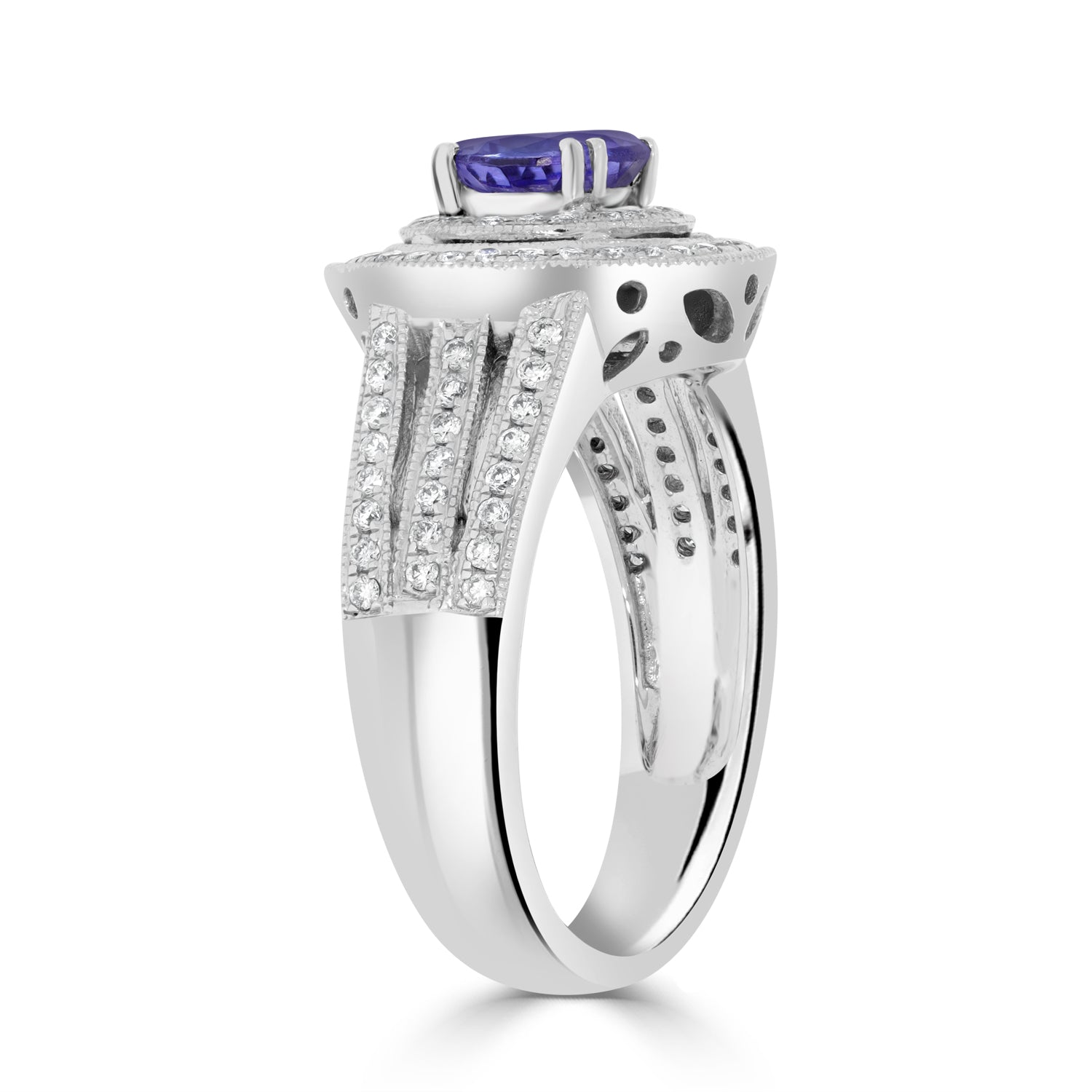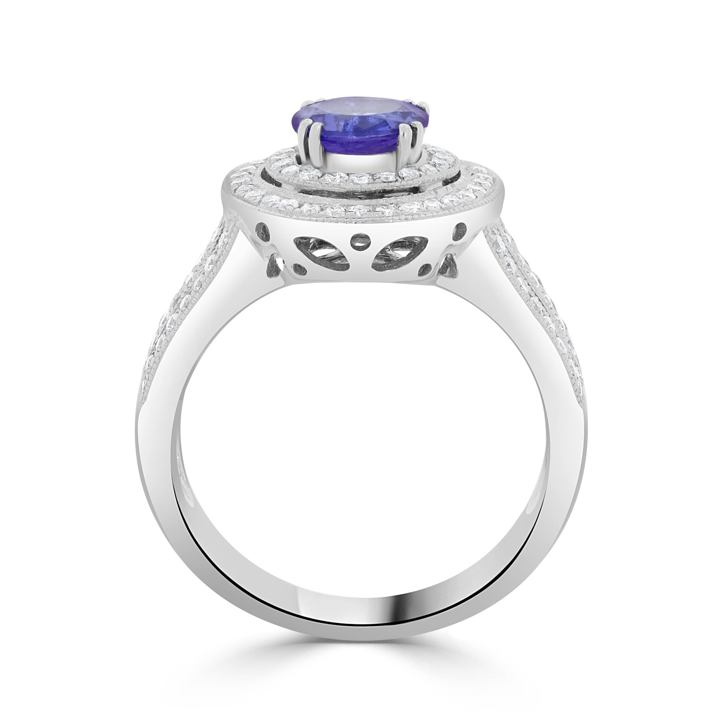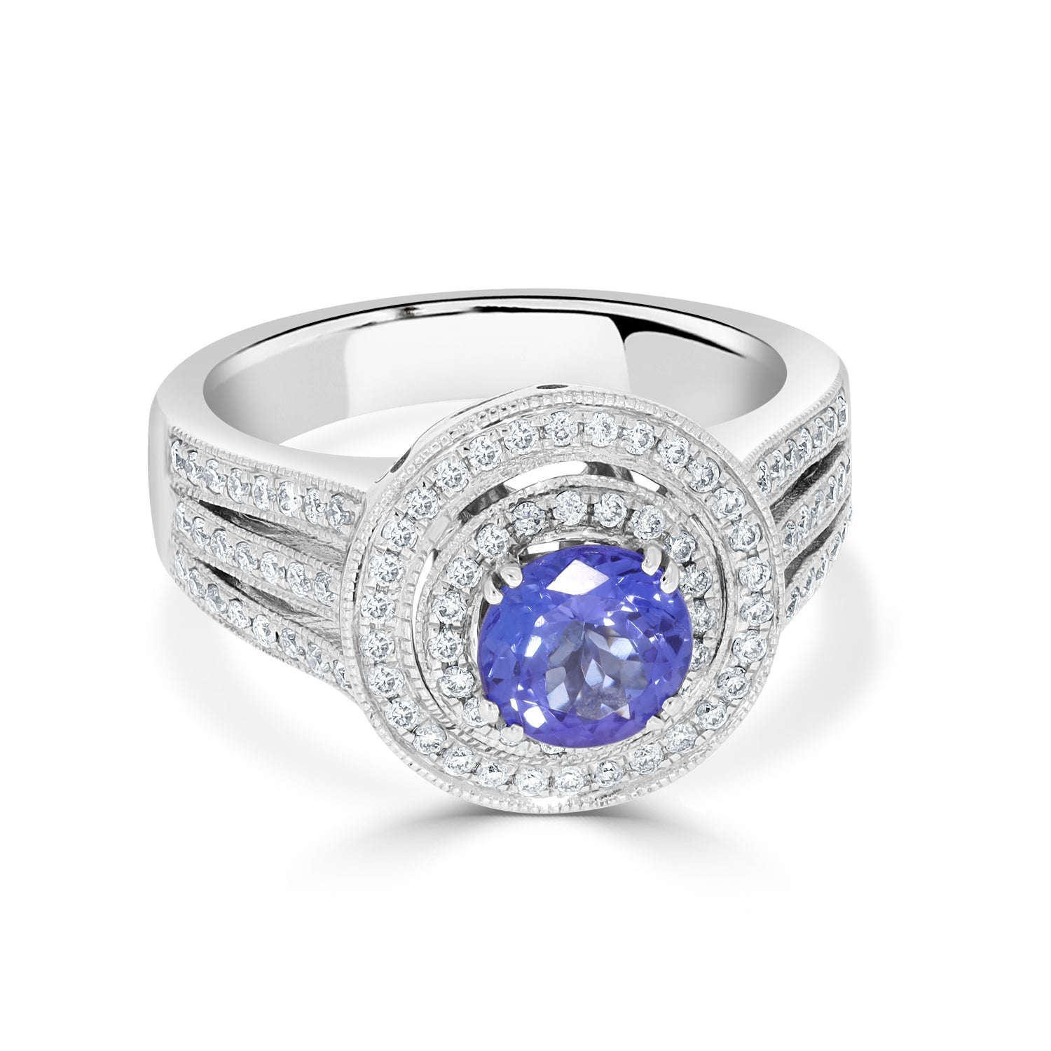 "Crafted with 14k yellow gold, this stunning ring is set with a round cut Tanzanite, This gorgeous ring also has round cut Diamonds set in it."